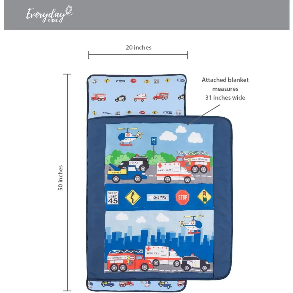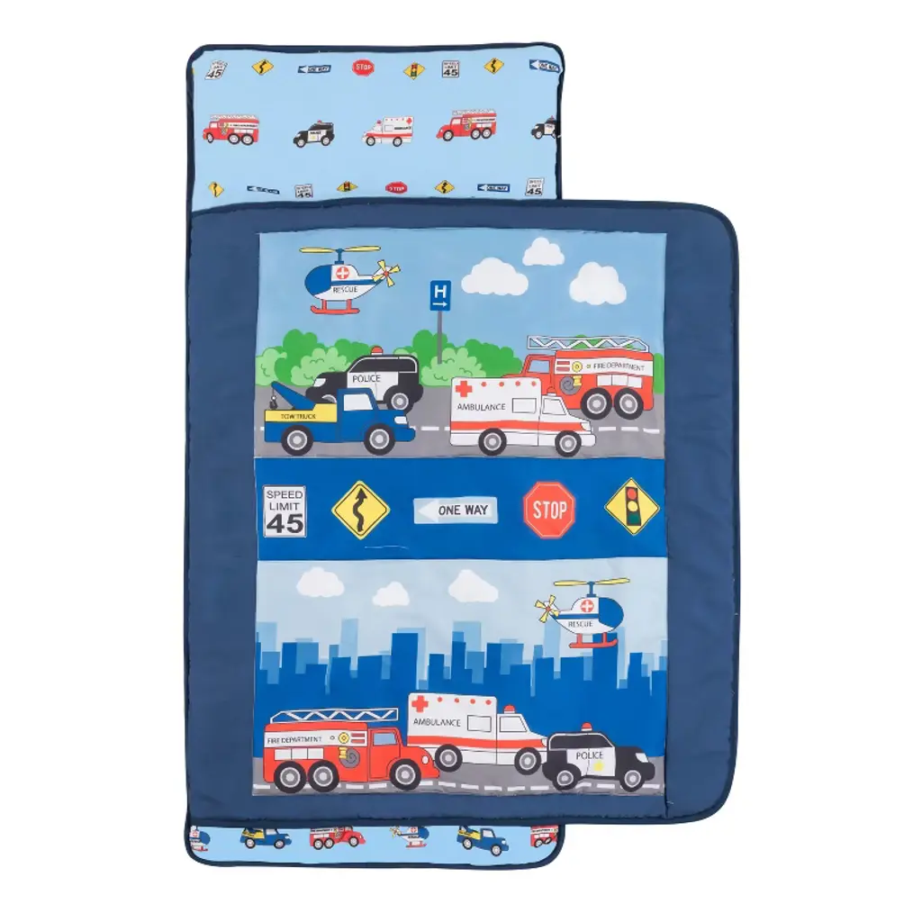 Your future policeman- or fireman will love falling asleep on this rescue-themed boys nap mat! The front of the police nap mat features scenes of rescue vehicles against a busy cityscape, coming together to help those in need. In the center is a parade of traffic signs, adding educational value as an early introduction to sign meanings and street safety. The design of the police sleeping bag is accented with navy blue trim, along with a matching carry handle and hook-and-loop closures. A perfect nap mat for preschool, kindergarten and daycare for children ages 2 and up. The blanket is made of soft microfiber to keep kids comfortable and cozy while they sleep. Never worry about your child kicking off the covers with the attachable blanket. This mat helps them be excited for a nap and attain high-quality sleep.