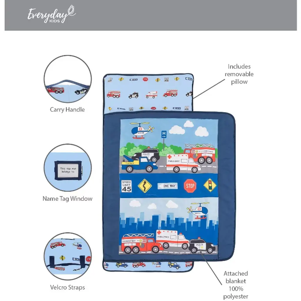 Everyday Kids Toddler Nap Mat – Fire Police Rescue – Soft Microfiber, Rollup With Handle & Pillow, For Preschool, Daycare, Or Travel -Ages 2-6 Years