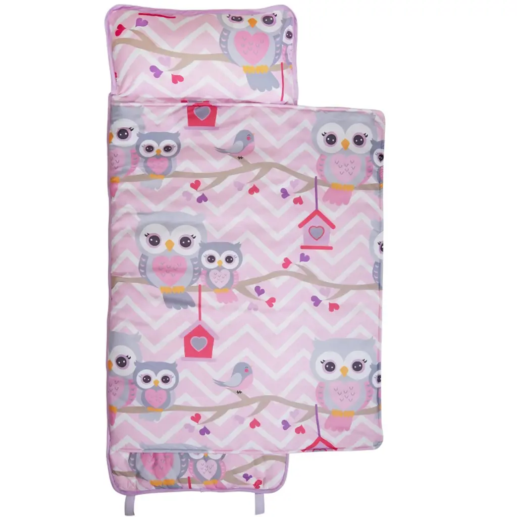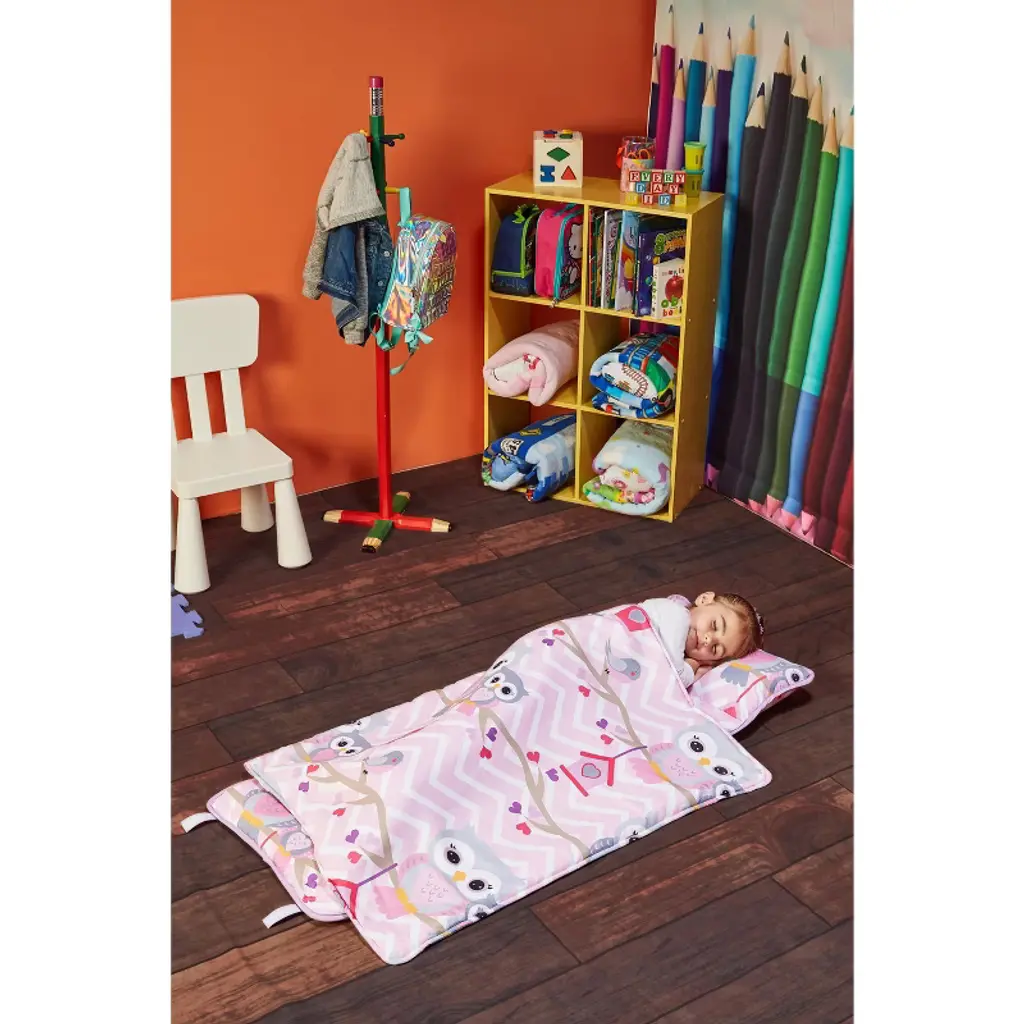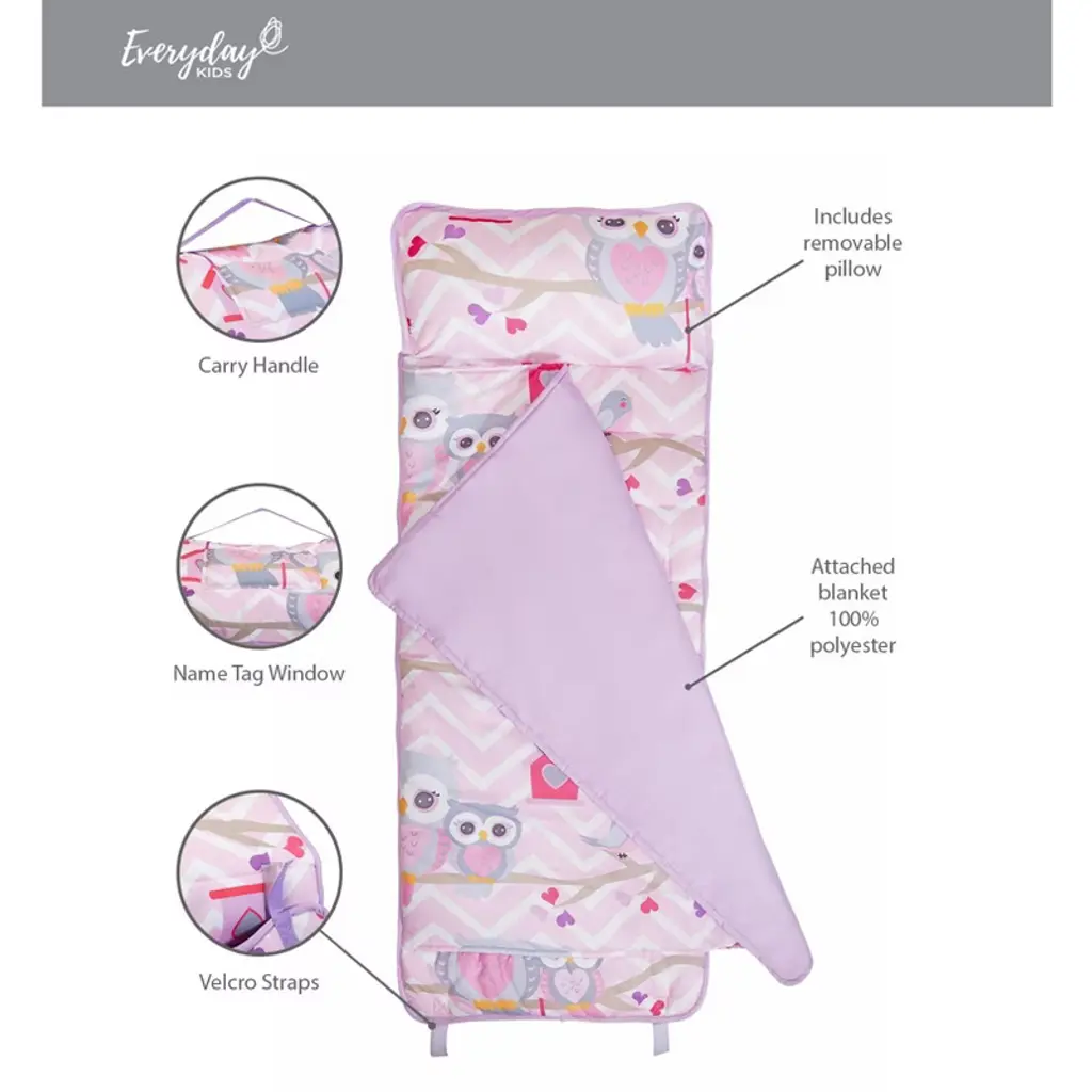 Everyday Kids Toddler Nap Mat –Sweet Owls– Soft Microfiber, Rollup With Handle & Pillow, For Preschool, Daycare, Or Travel -Ages 3-6 Years