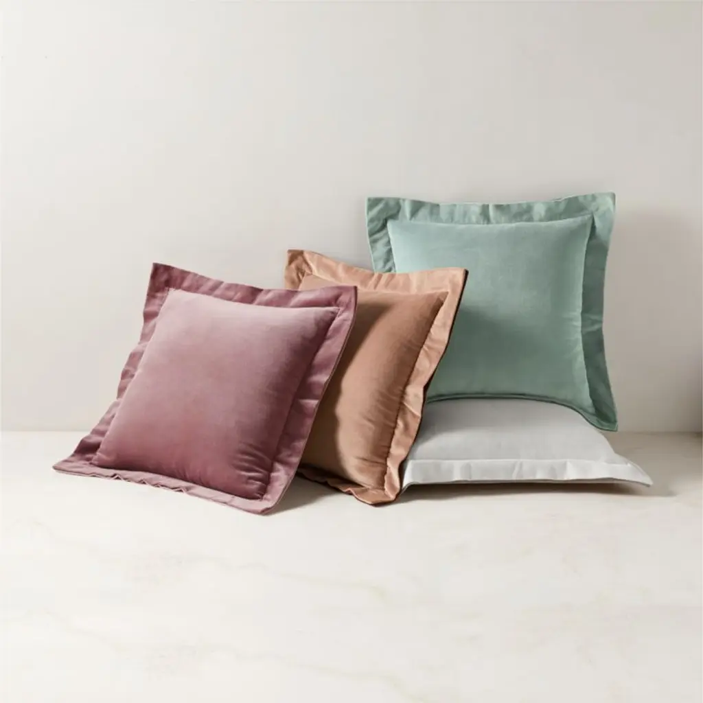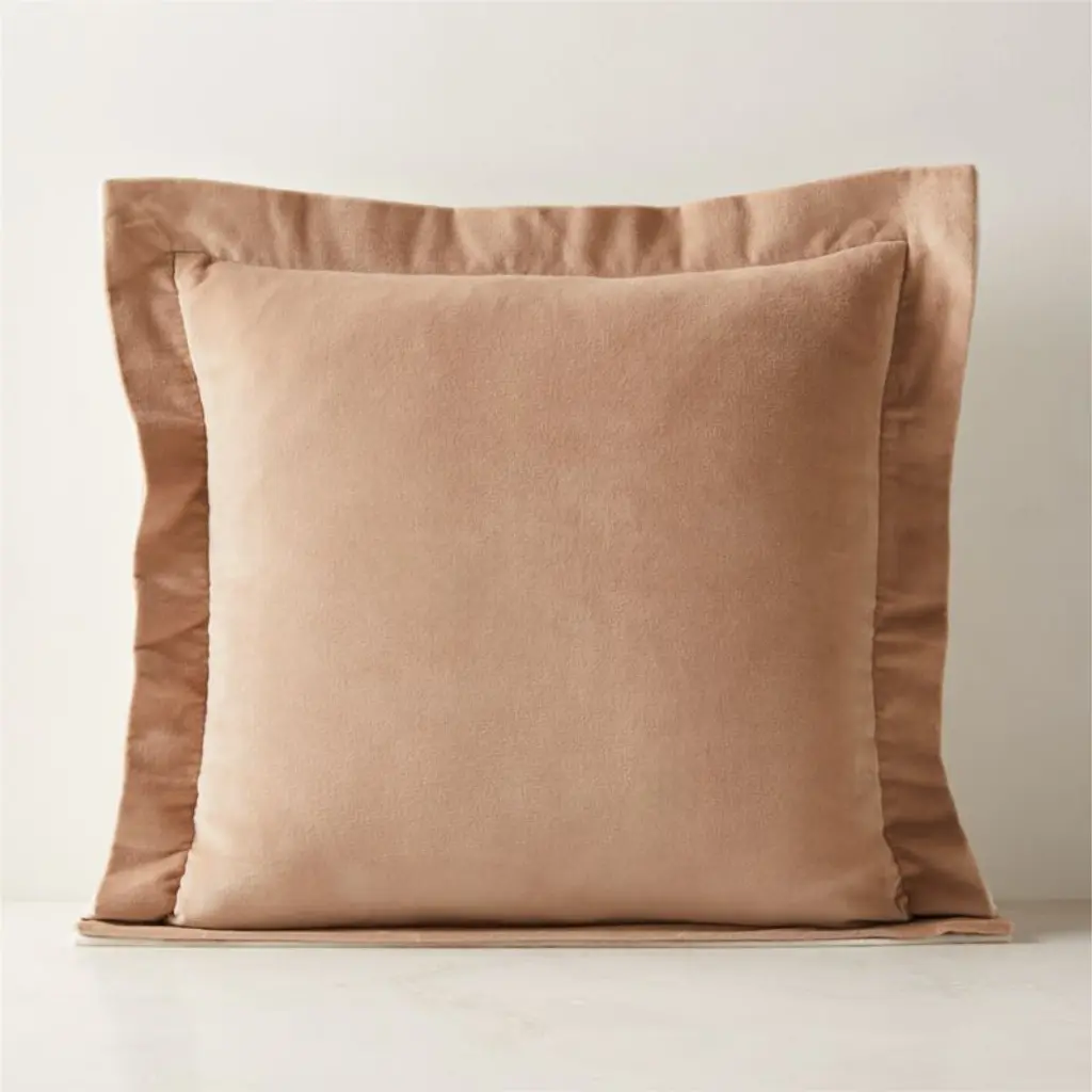 Tailored with a flange border, sumptuous sand velvet throw pillow is the perfect modern accent with silky soft texture. Organic cotton velvet on both sides indulges in rich color and a subtle lustrous finish that changes with the light. CB2 pillows include a pillow insert in your choice of feather-down or down alternative.