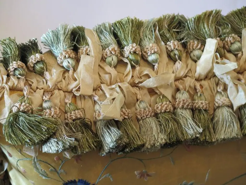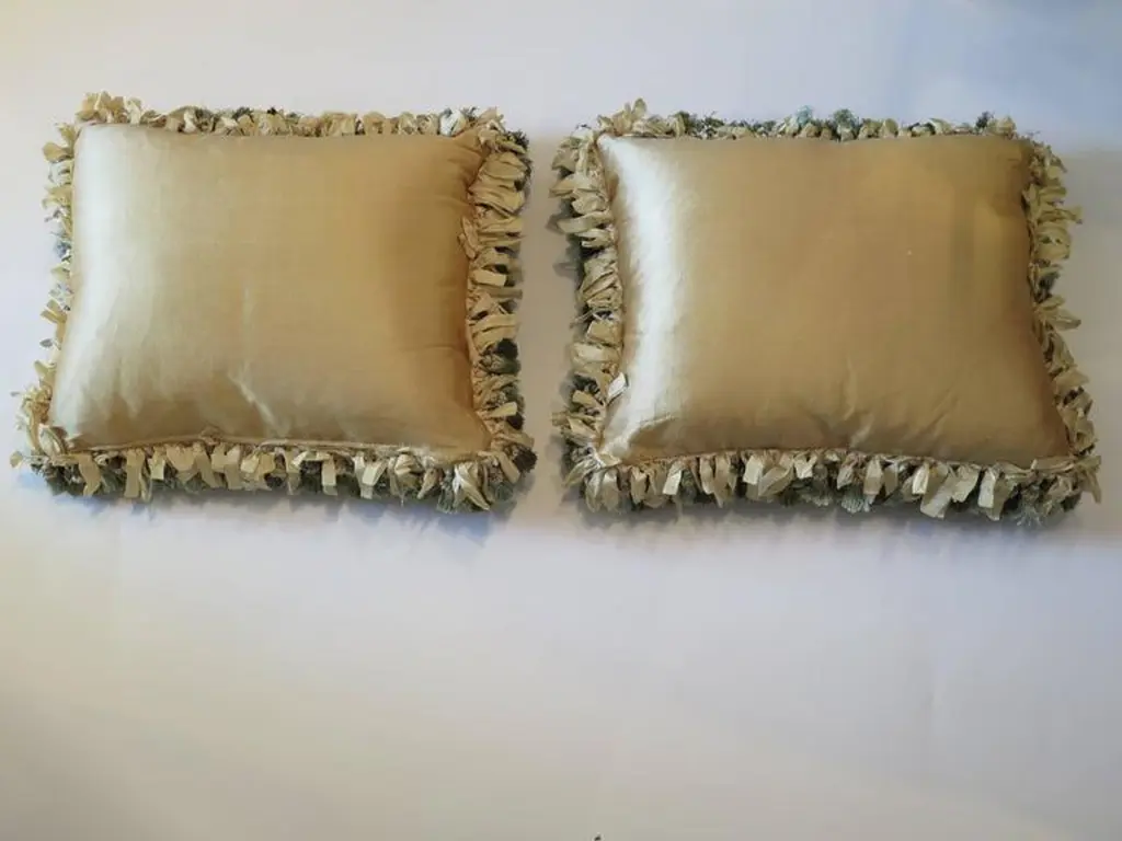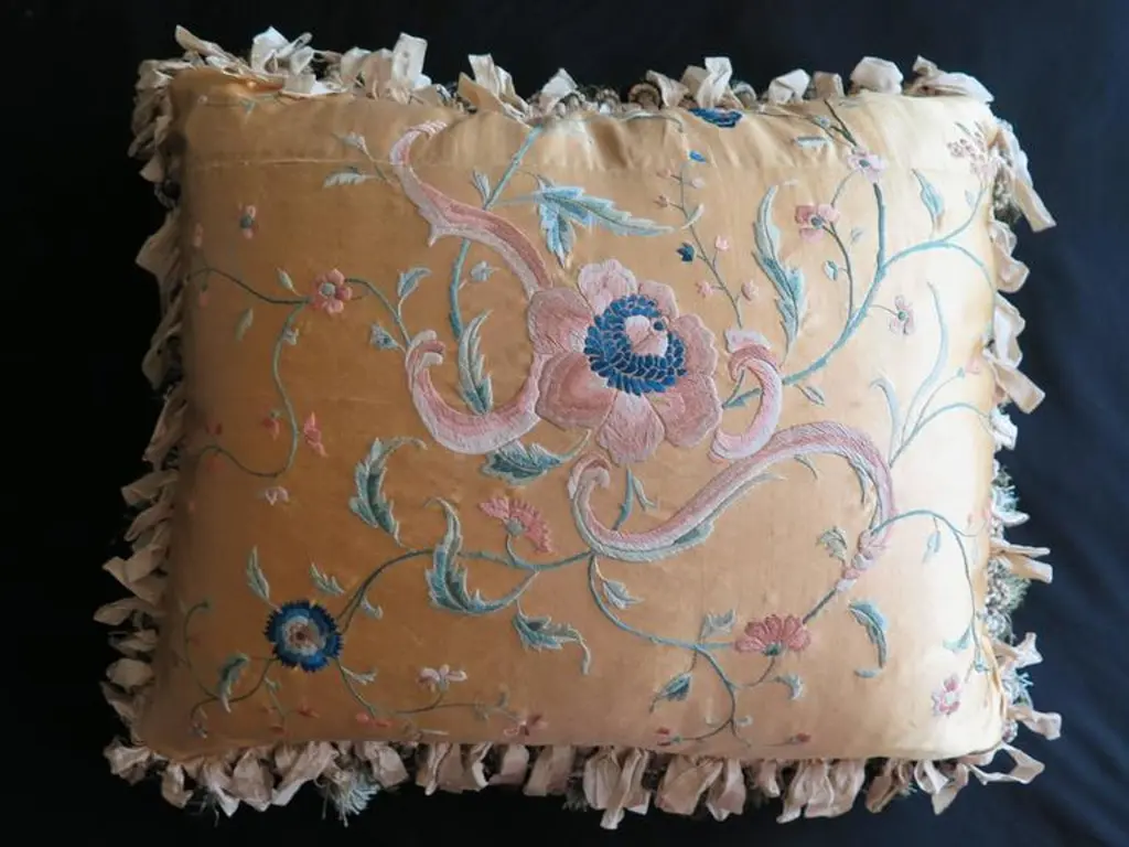 A pair of exquisite pillows made of Chinese 18th century silk embroidered floral pattern fragments in soft gold color and antique tassels fringes and ribbons.