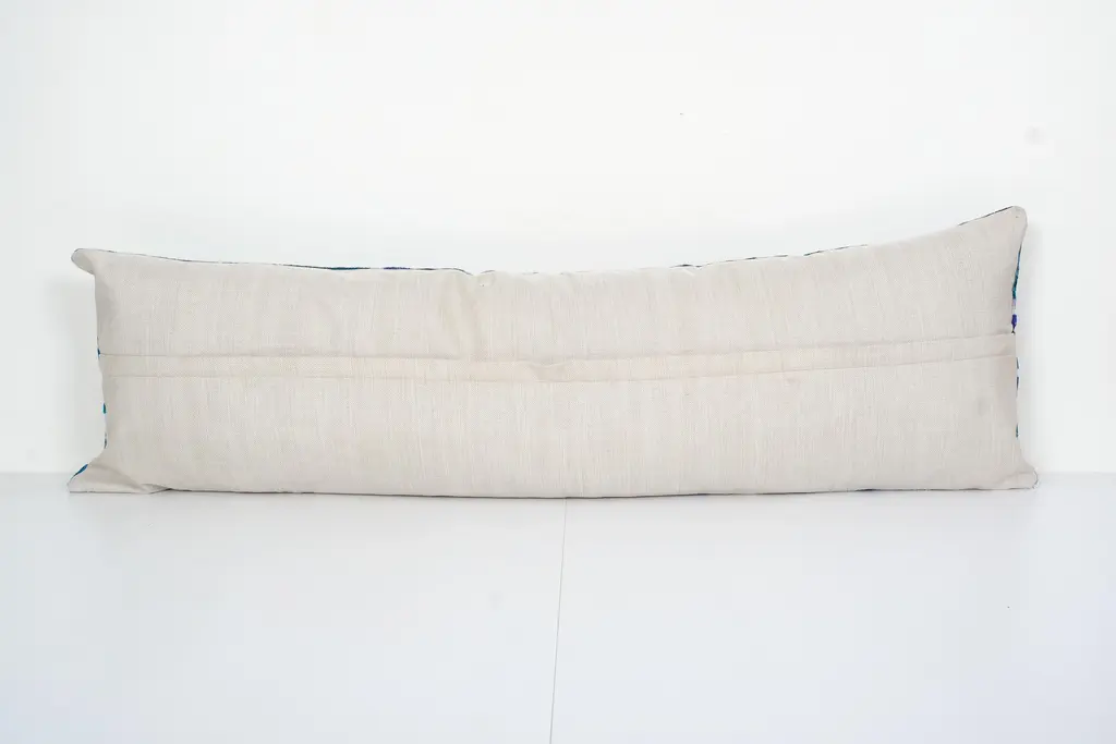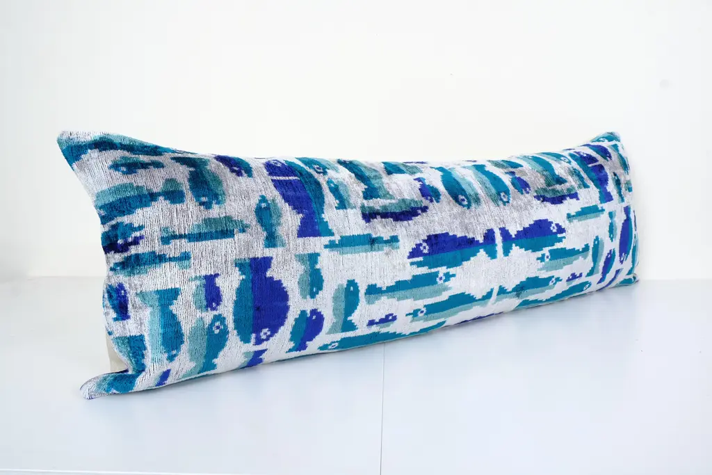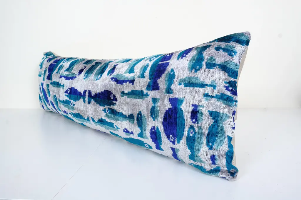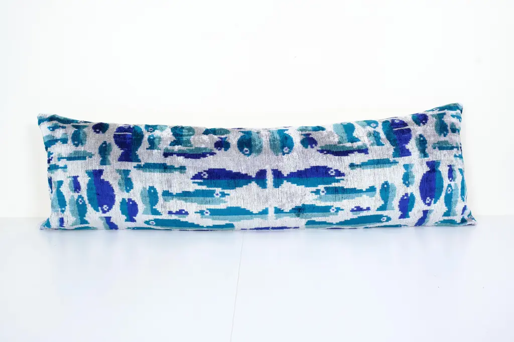 Decorative Throw Velvet Ikat Pillow -Luxurious cushion cover of handloomed ikat fabric -Insert is NOT included -Ikat is an beautiful fabric, every pillow is unique but can also contain small imperfections; the charm of a handmade product. Dimensions: 15" x 48" / 38 x 121 Cm -Handloom 100% silk velvet fabric -Back side is cotton fabric and with hidden zipper. -Handwoven velvet pillow case only, -Hand wash 30 C or dry clean