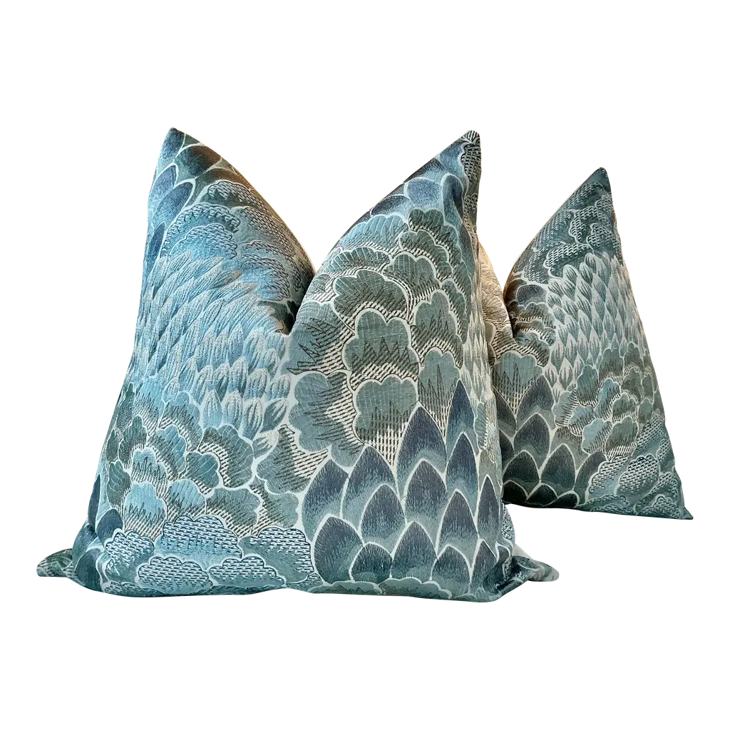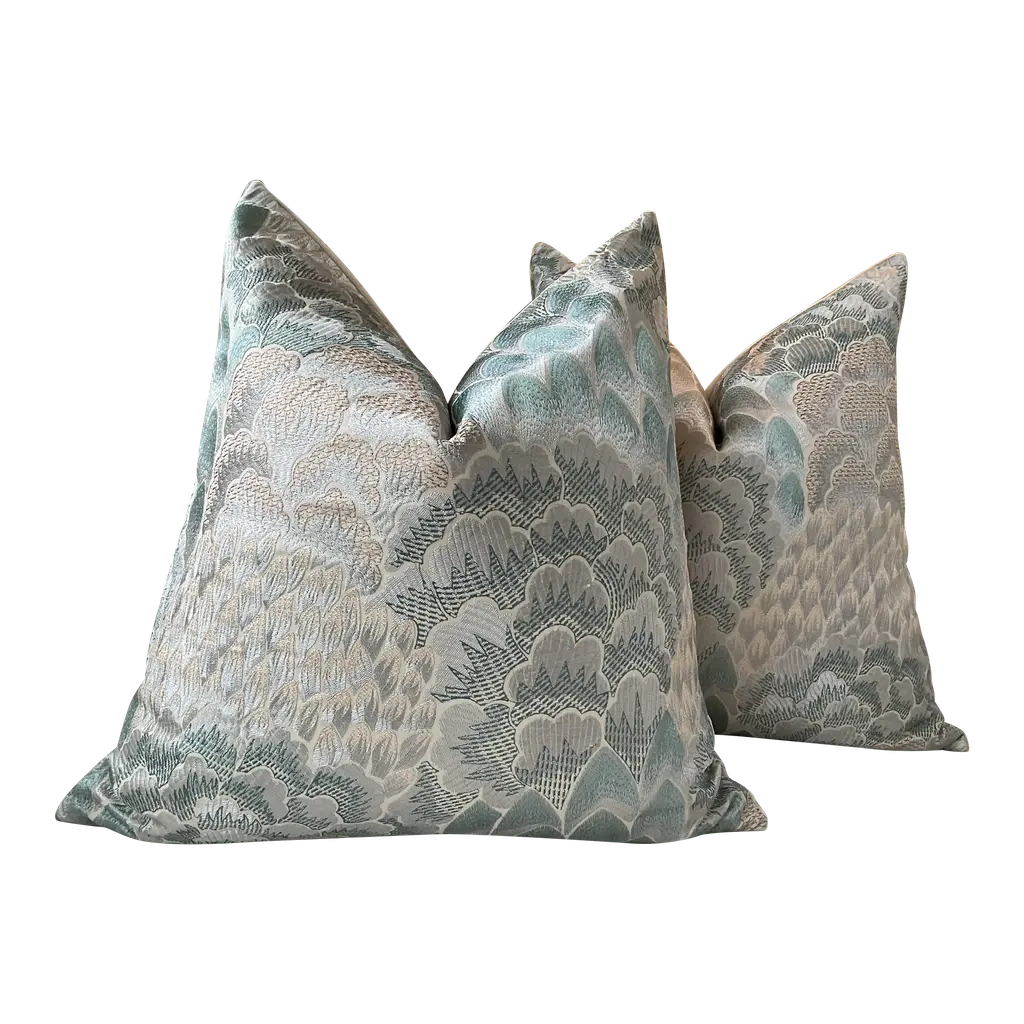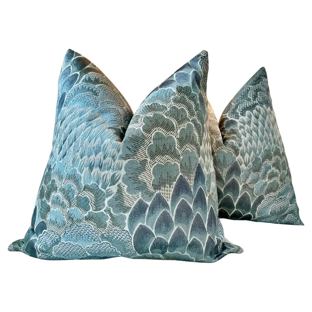 Pair of handcrafted pillows fashioned with Fabricut Laberinto Velvet in Laguna fabric on the front and backed in a flax colored linen. Meticulously crafted with serged interior seams, invisible zipper closure, and 95%Feather/5% Down fill insert. Brand new condition.