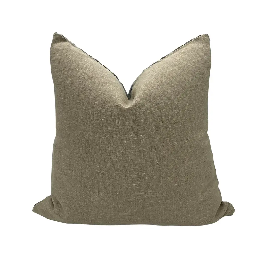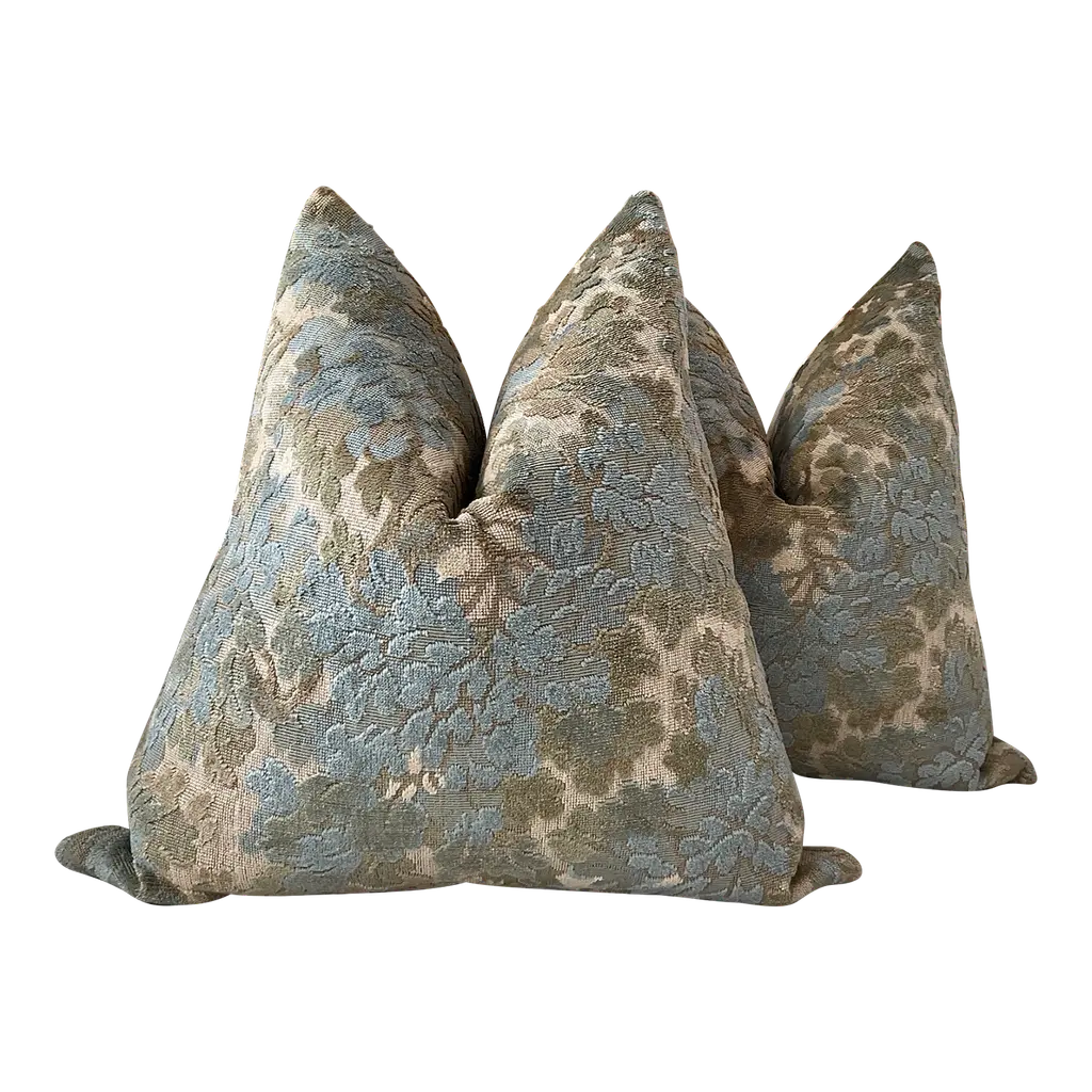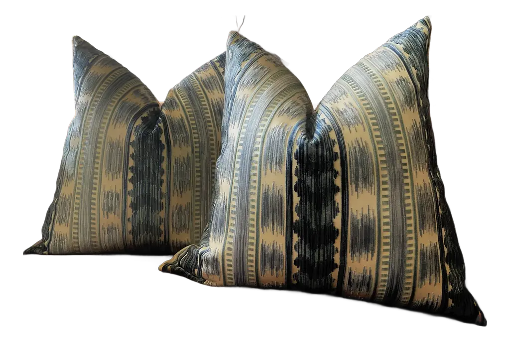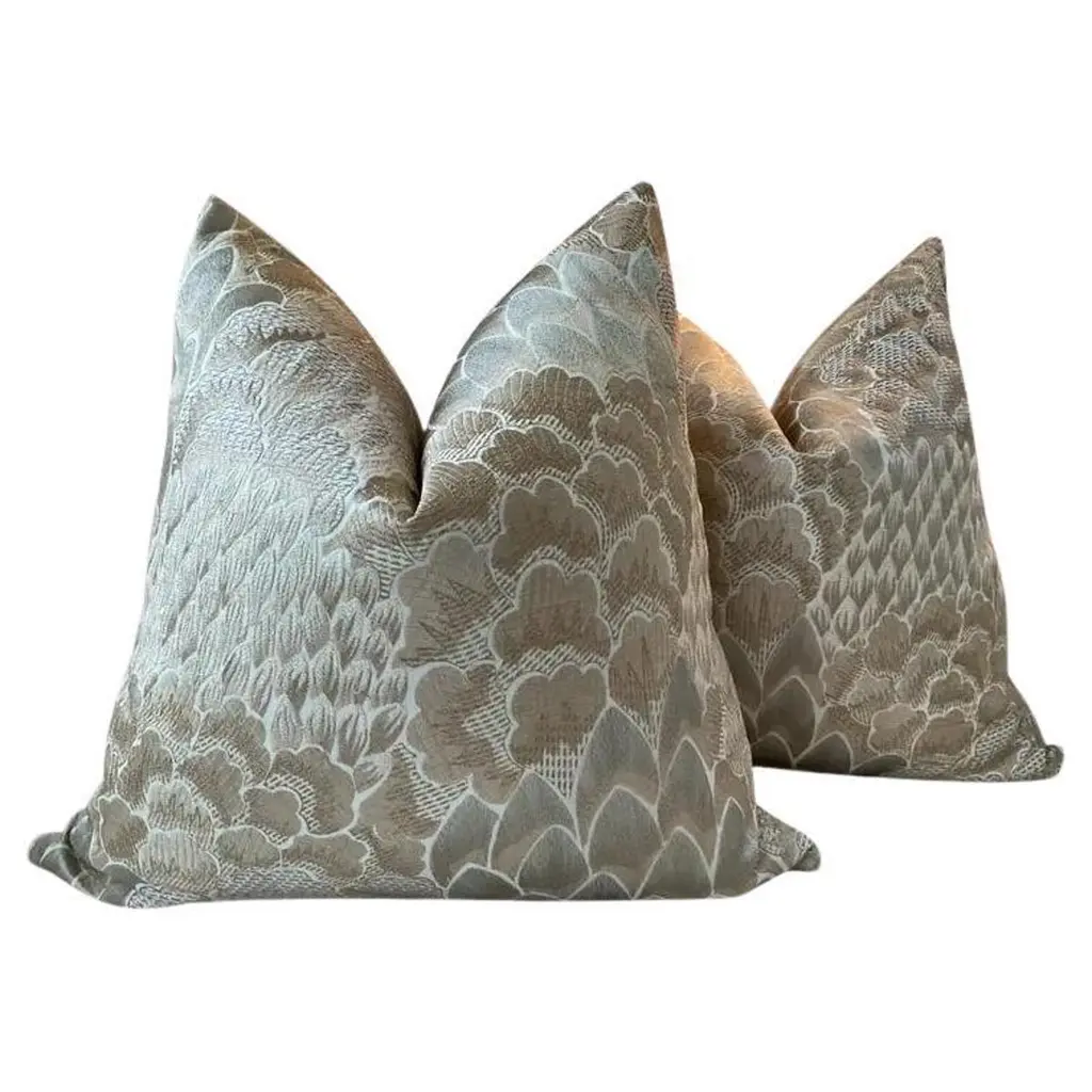 Pair of handcrafted pillows fashioned with Fabricut Laberinto Velvet in Laguna fabric on the front and backed in a flax colored linen. Meticulously crafted with serged interior seams, invisible zipper closure, and 95%Feather/5% Down fill insert. Brand new condition.