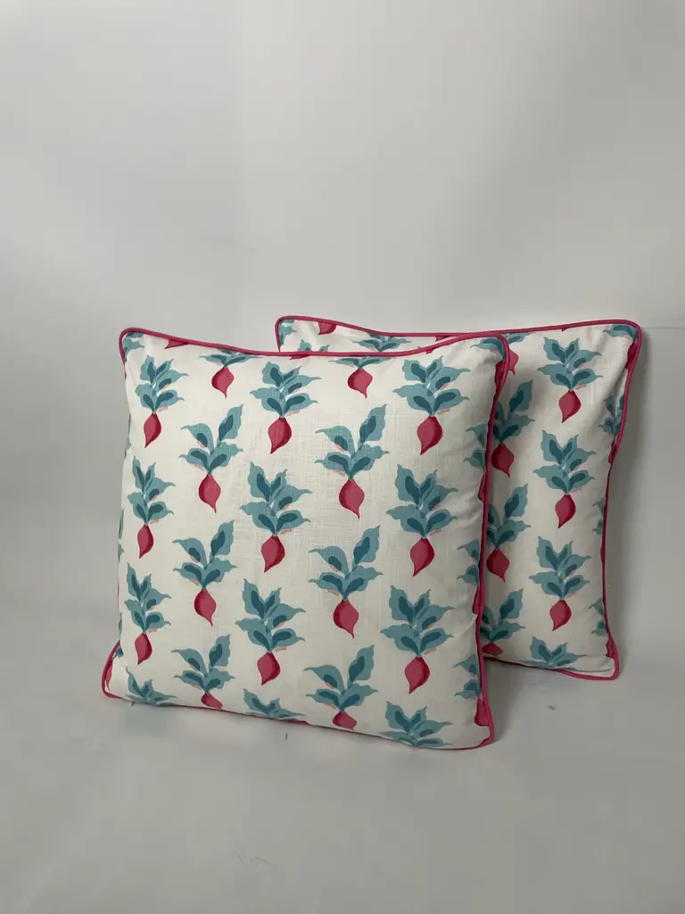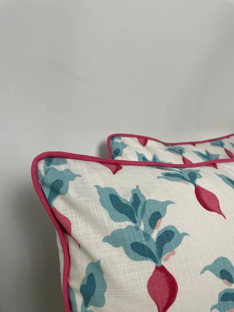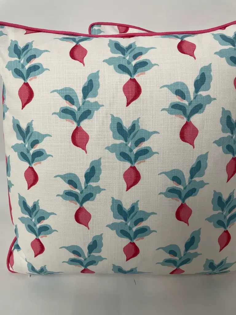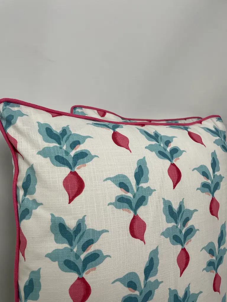 Adorable radish printed pillows from Fabricut in a stunning pink and blue colorway. Complete with a plain white back, pink contrast welt, hidden zipper closures, and new 22” feather down inserts.