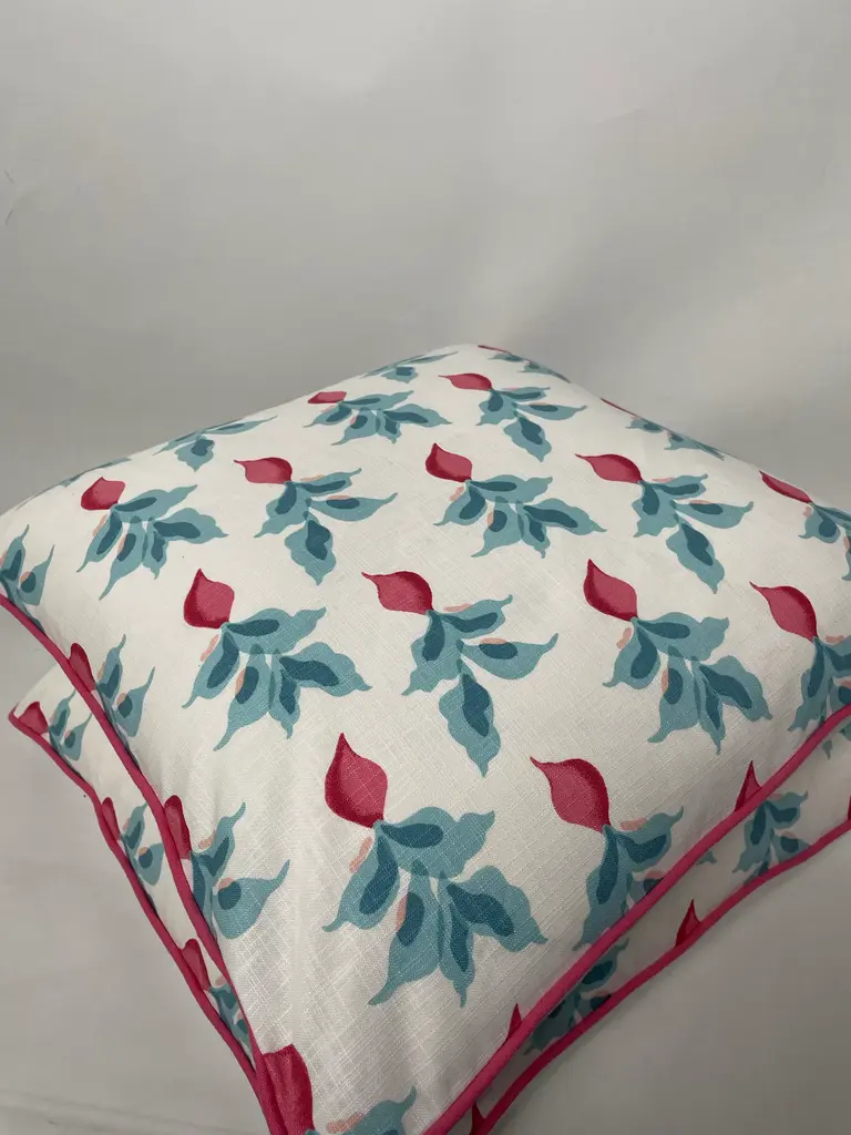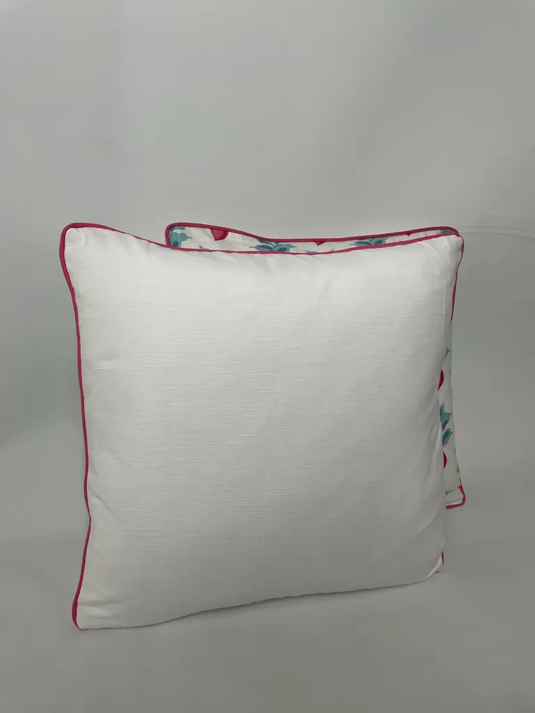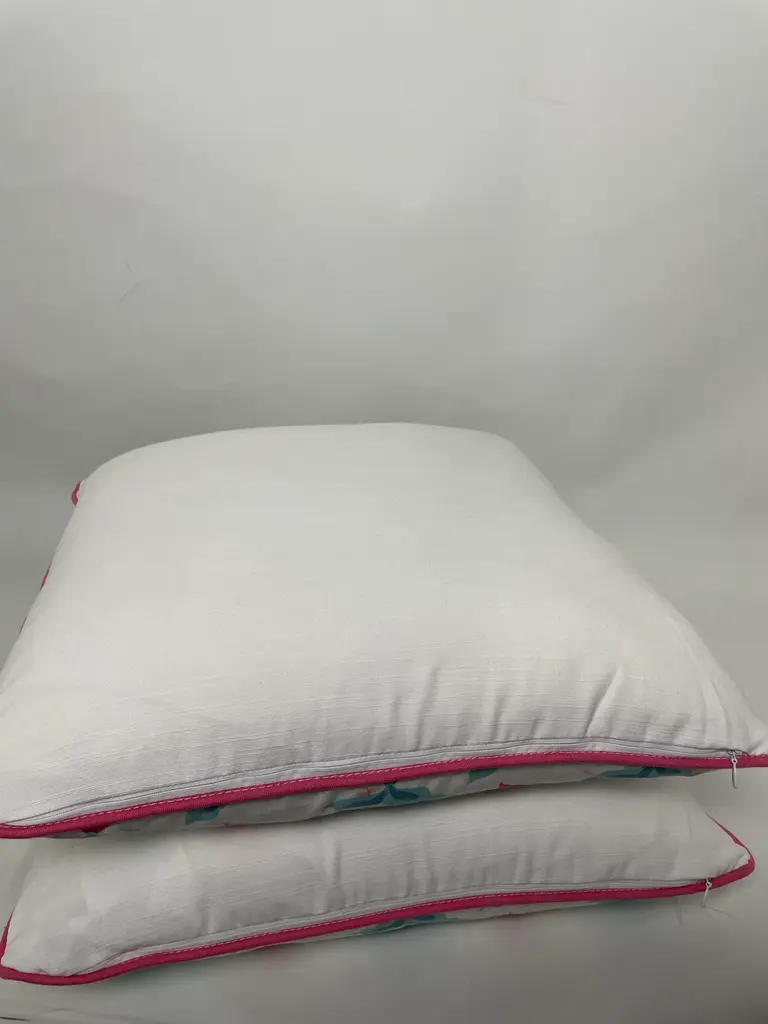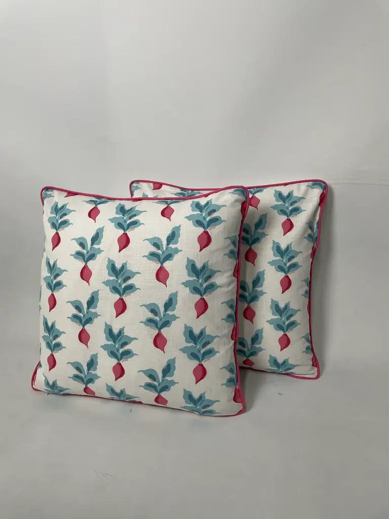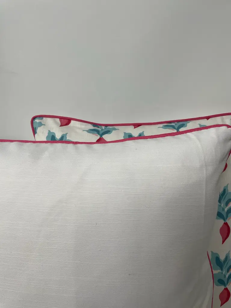 Adorable radish printed pillows from Fabricut in a stunning pink and blue colorway. Complete with a plain white back, pink contrast welt, hidden zipper closures, and new 22” feather down inserts.