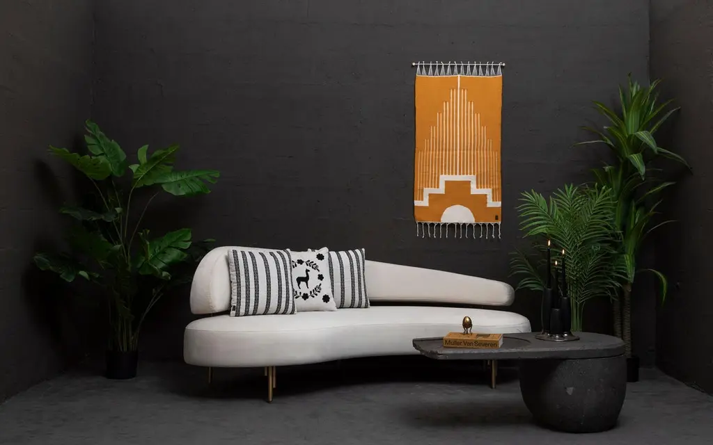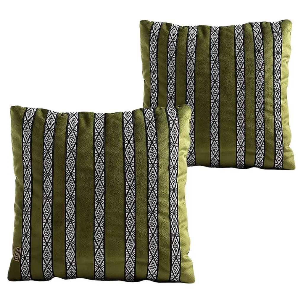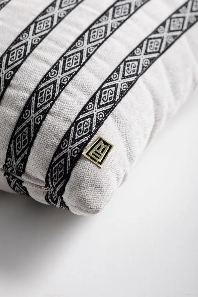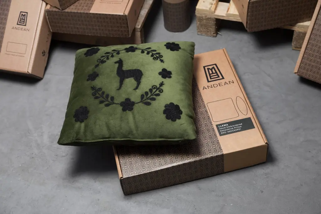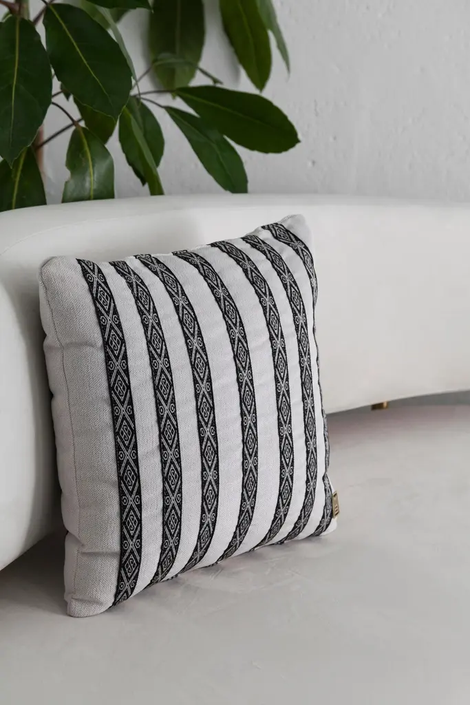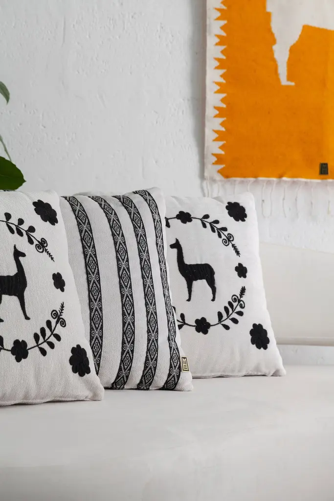 Decorative pillows with handwoven artisanal sash details from Peguche, Imbabura, and waterproof velvet or upholstery fabric.These decorative cushions are carefully hand-crafted with cotton embroidery and enriched with accents of sheep fur and leather. They feature traditional motifs and are specially waterproofed for stain resistance.SOULFUL OBJECTS represent a journey through our heritage and traditions. A family of objects that depict the autochthonous materials and artisan methods of Ecuador. The collection comprises an array of decorative and functional objects— bowls, candleholders, decorative pillows, and tapestries— showcasing materials such as hand-carved volcanic stone from the quarries of Chimborazo, Ecuador's highest and dormant volcano, opulent bronze, stainless steel, and sumptuous velvet.The designs collectively tell our story of Latin America. Every object is the result of a thoughtful approach to Ecuadorian material culture and iconography. Selecting the ideal artisan technique to produce a sophisticated, modern abstraction. An ideal platform for our artisans to embed their generational knowledge. Leaving their soul's signature on every seam, every crease, every chisel mark.ANDEAN studio’s practice is an exploration that highlights Ecuador's iconography and our Latin American essence. New items will be added to our ongoing collections every year, each bearing our equatorial design stamp and a distinct aesthetic.ARTISANS:Marco Panamá: Handwoven BeltsKelly De La Torre: Upholstery