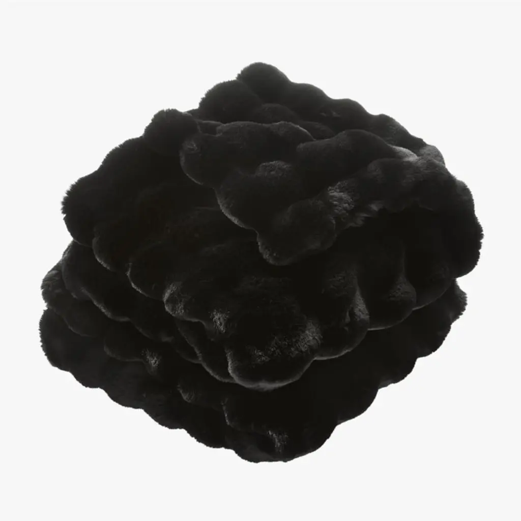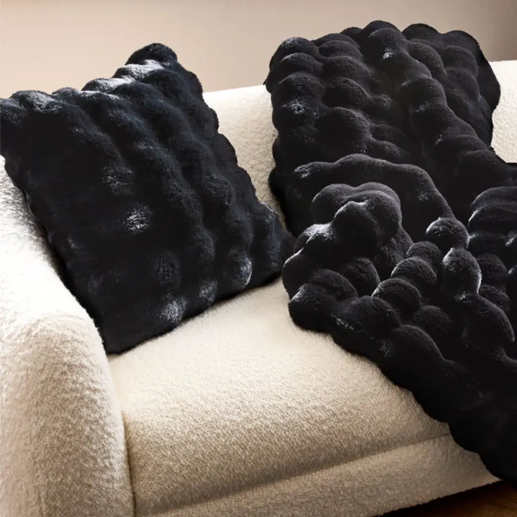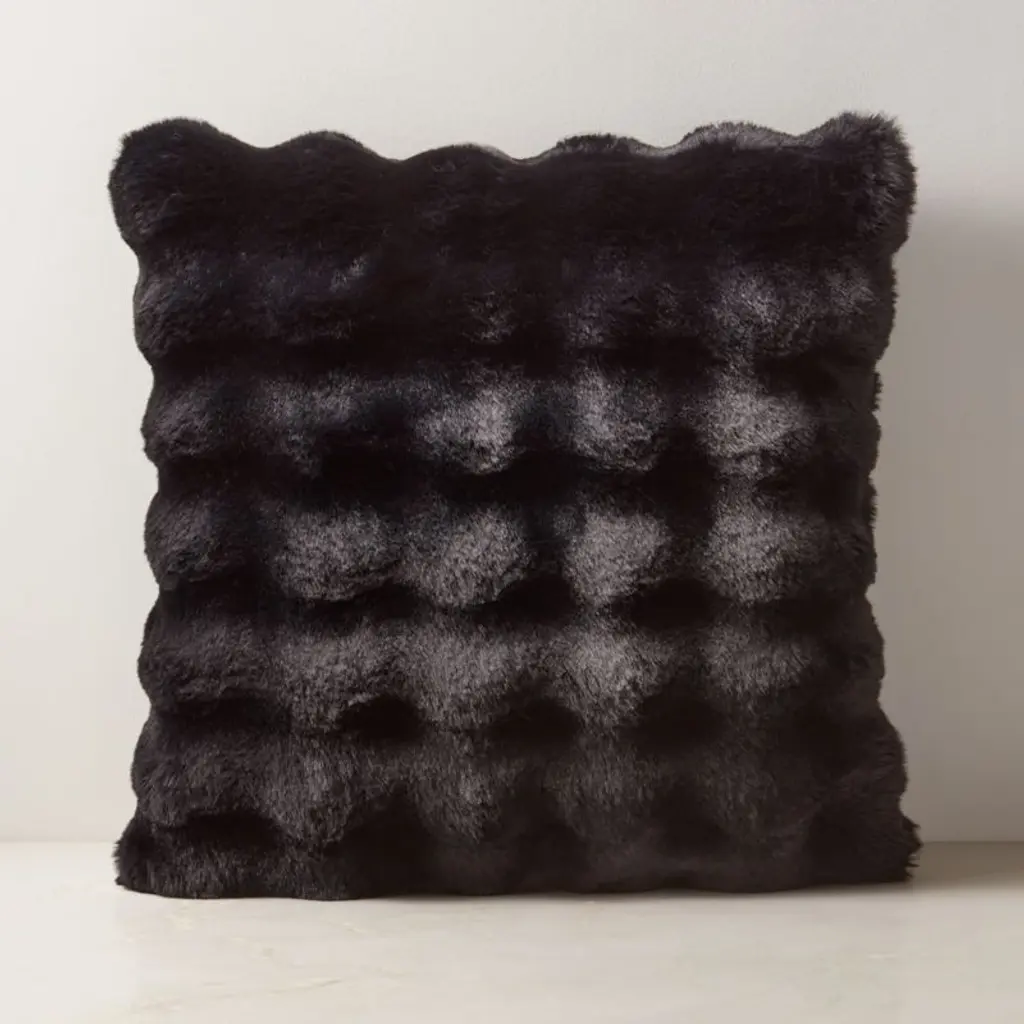 Farleigh black faux fur throw pillow and blanket set adds touchable texture to any space. Woven with a super-plush pile, the set doubles up on fur with an elevated convex bubble design, recreating the warmth and sumptuous feel of genuine fur. CB2 pillows include a down-alternative pillow insert.