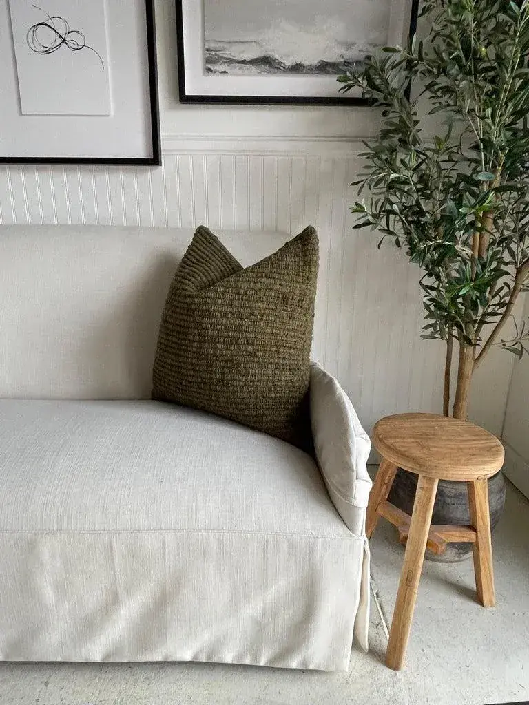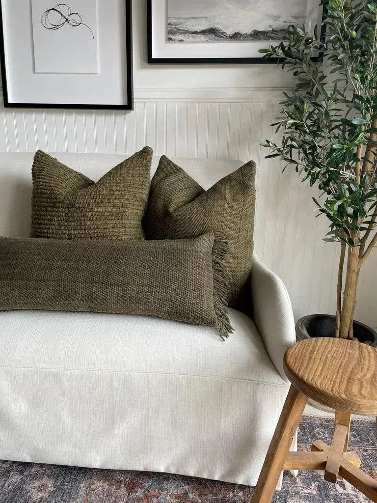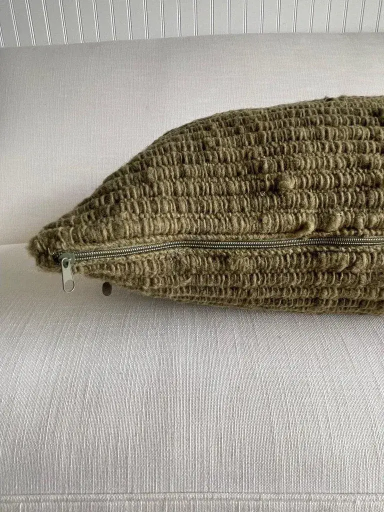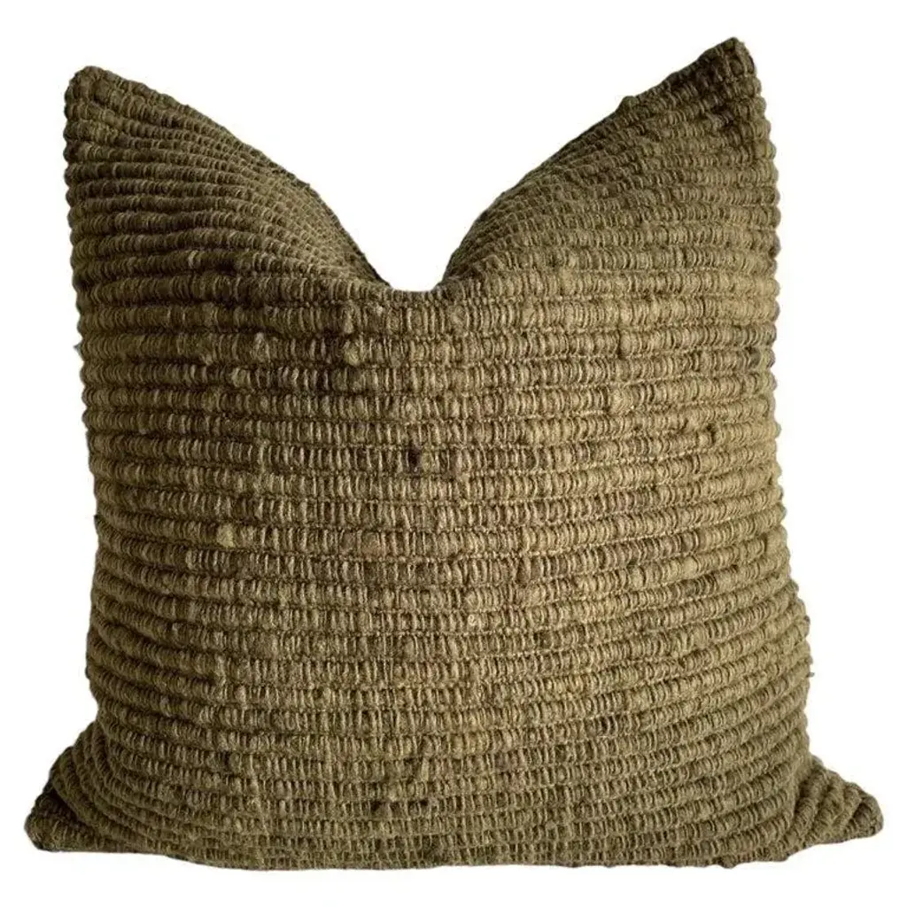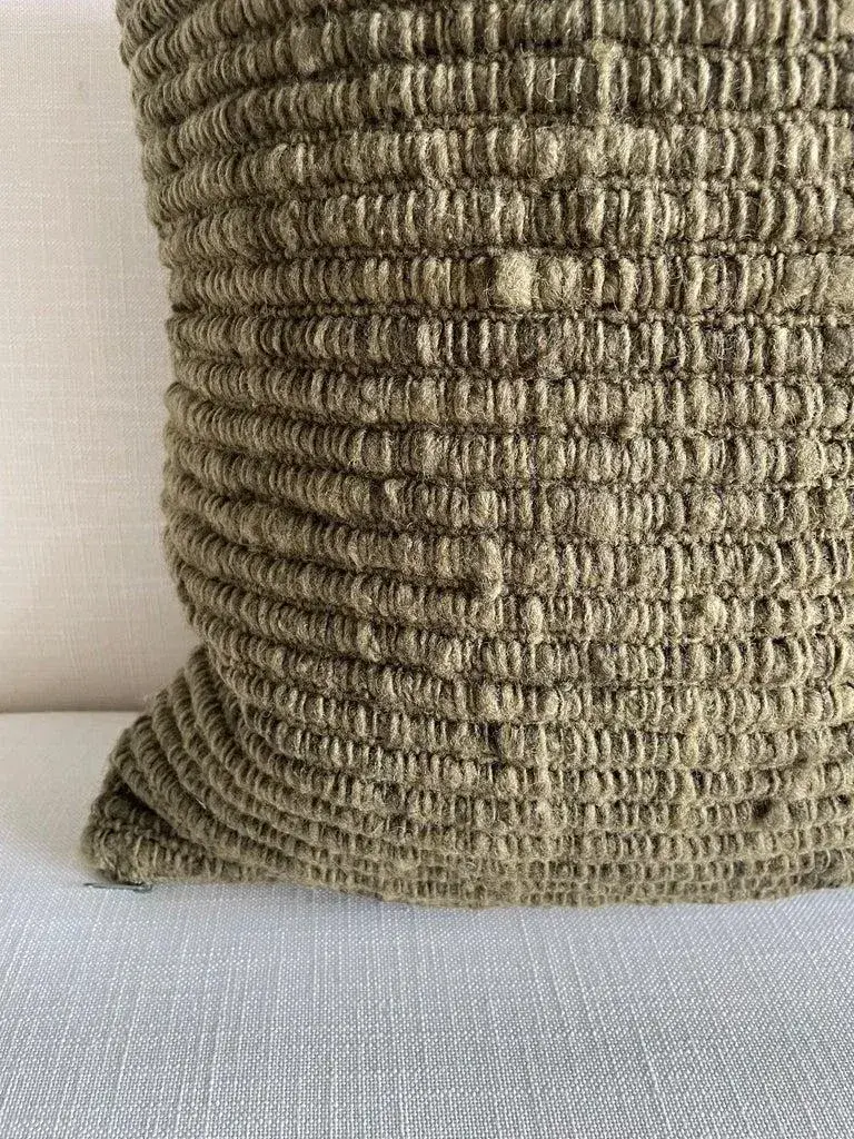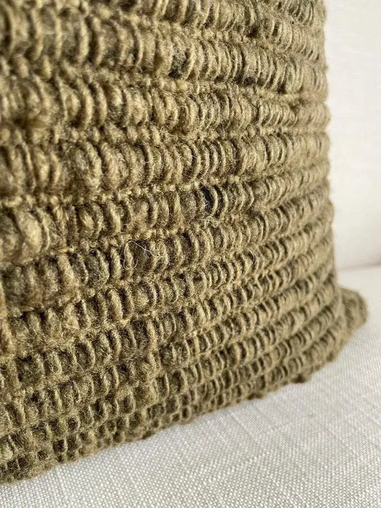 All of our products are commissioned and handmade by the craftswomen of Chiloé. The textiles are made with 100% wool from ’Chilota’ sheep, that are born and raised on the island. The process by which these luxurious wool pieces are made starts with shearing the sheep, cleaning the wool in hot water to remove the natural oils of the sheep, drying and spinning the wool into fine threads before hand weaving into unique textile patterns and textures. The textiles we use are colored by natural dyes using leaves, barks, roots, branches or mineral elements. Their main characteristic is their capacity to adapt to difficult weather conditions which makes their wool resistant, flexible and durable. Color: Army Green Hidden Zipper Closure. Large wood yarns woven to create a beautiful texture. Dry Clean or spot clean recommended. Size: 24” x 24” Includes insert