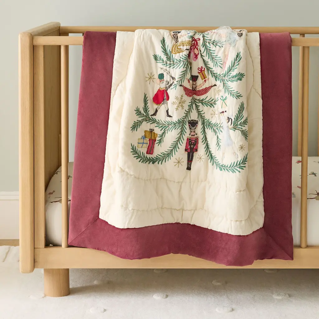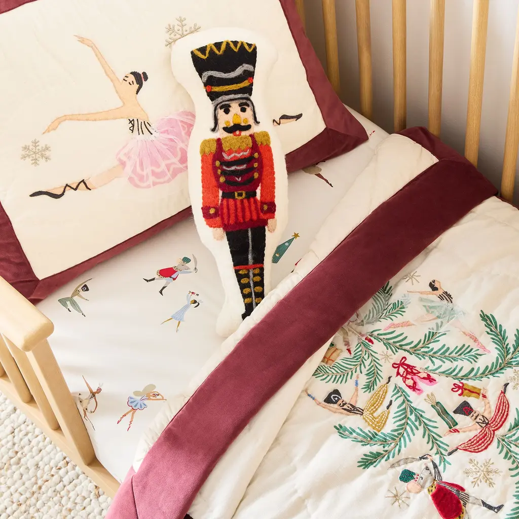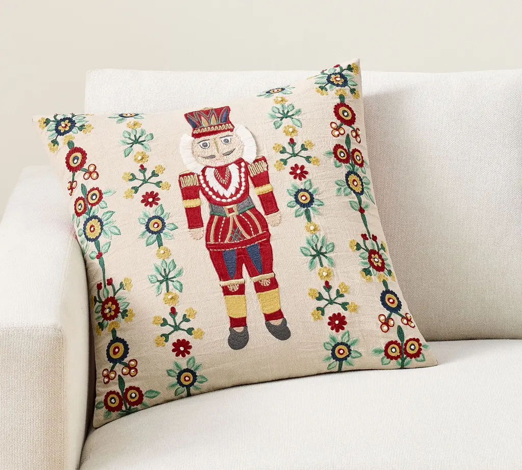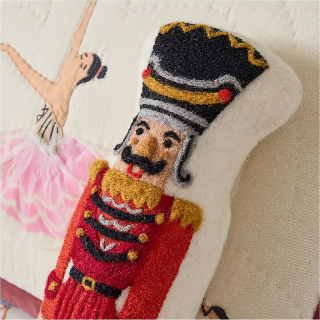 The traditional nutcracker design with a modern spin. Adds cute, vintage charm to a bed, sofa or reading nook. Essential cozy cheer to the holidays.