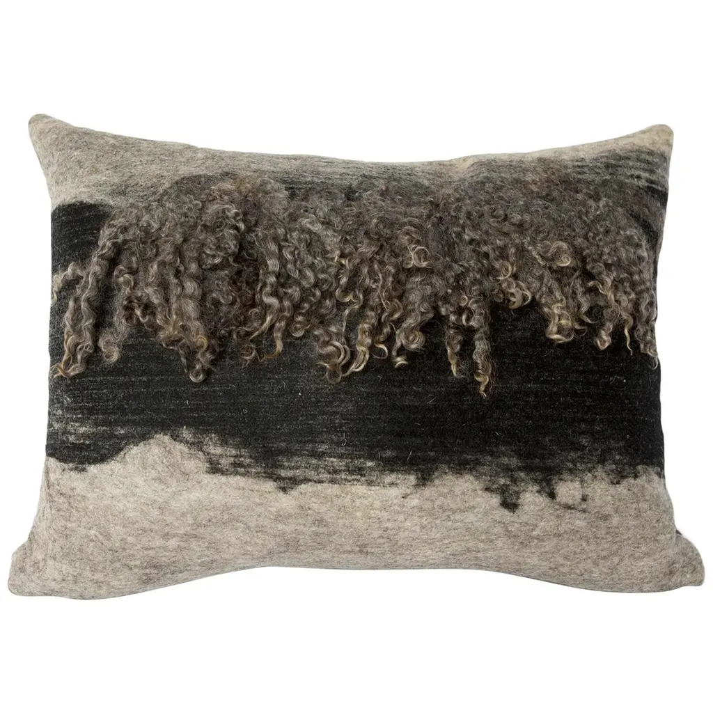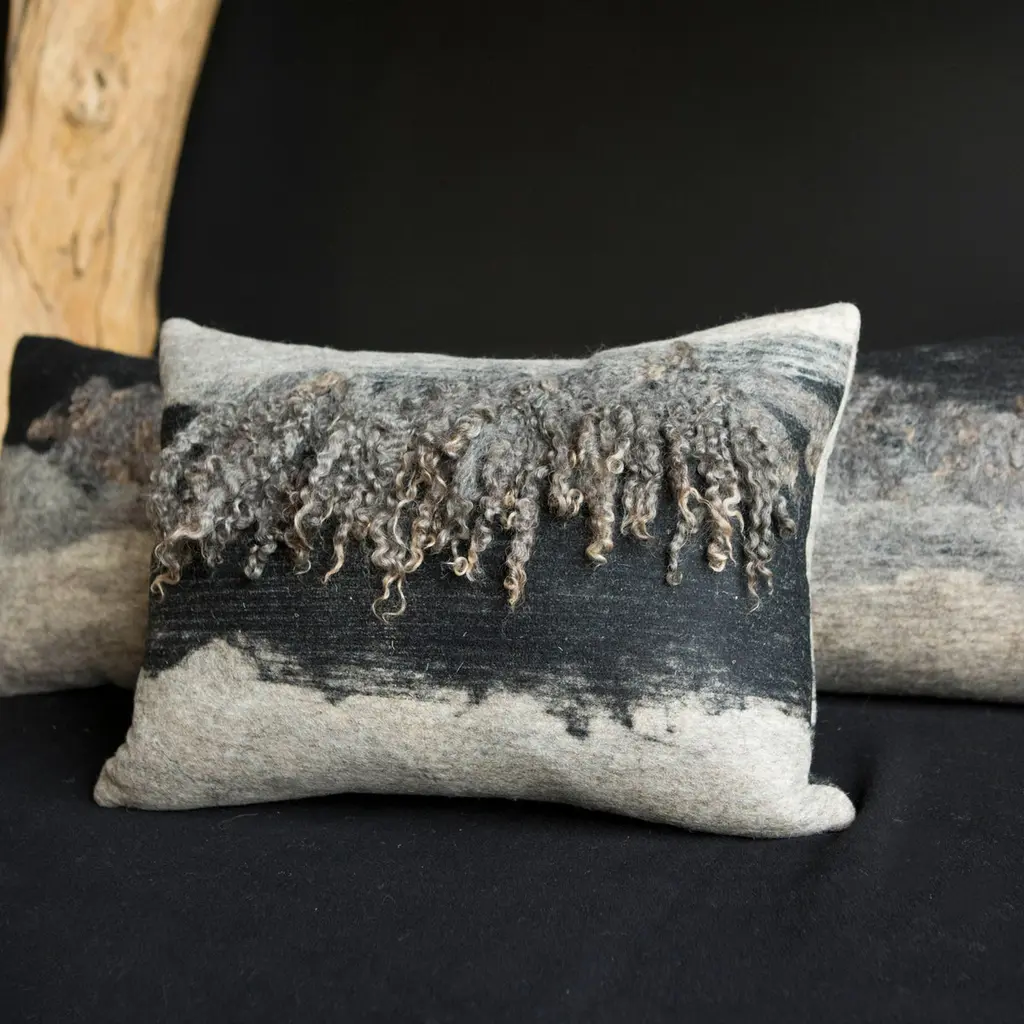 Milled in JG Switzer's design workshop, this pillow is named after the sheep that adorn its face, The long-locked Wensleydale, mostly because "Wensleydale" is just so darn fun to say. Wensleydale felted adornment is from local, California sheep and our very own "shop sheep."Pillow size is 16 x 48". Dry clean only. Insert included and designed to keep its shape. Every pillow is handcrafted on our needle loom and is one-of-a-kind, so no two pillows alike. Nobody will have your exact pillow, and your pillow will differ from the picture slightly.