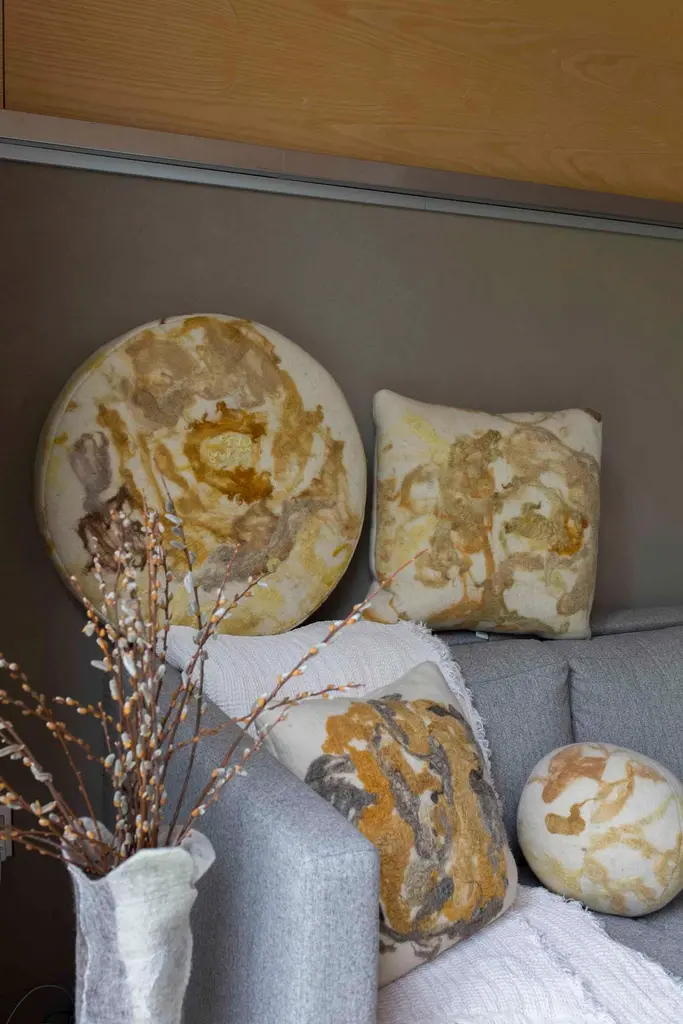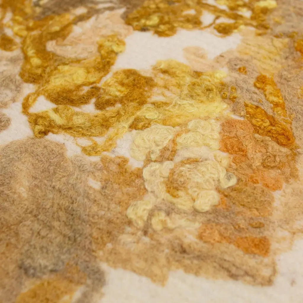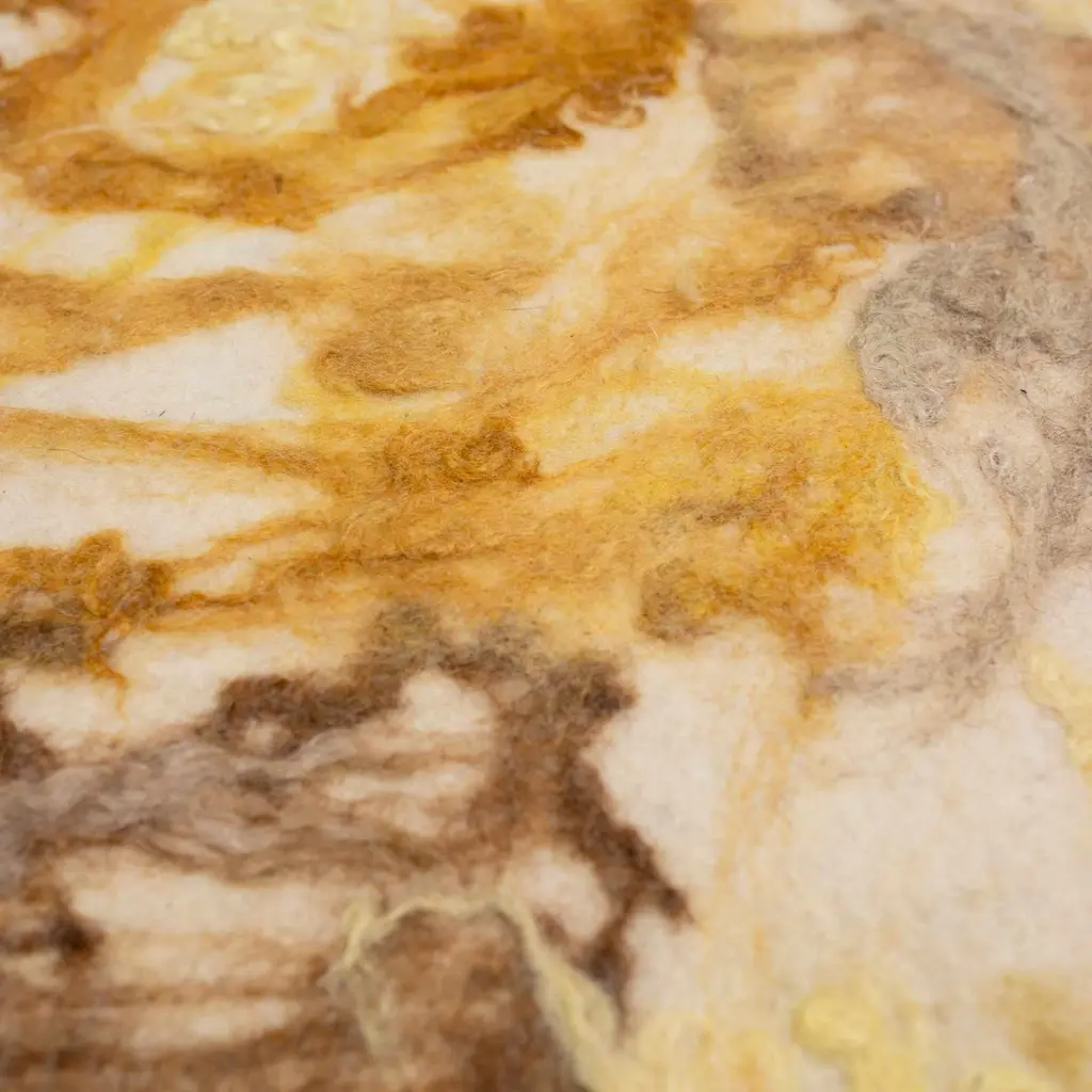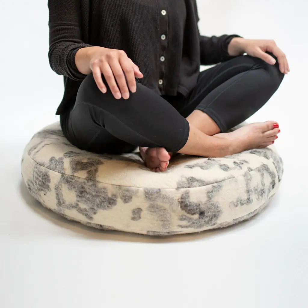 Felted wool round floor cushion, in turmeric-dye medallion yellow felted from local, fiber shed wool in a creamy, natural background, our indigo and green apple dyes are nature-made and part of our Botanical Collection.Raw fleeces are "painted" on to the natural, wool canvas sourced within a 50-mile reads of our workshop. These dyes are colorfast and tested to last. As each piece is created in our workshop, no two are alike. Colors will be a mix of yellow-gold hues from plants turmeric and weld and mushrooms. We make the fabric unique to each pillow, please allow for nuances in color, just as you would for natural materials such as stone or wood.Pillows are sewn in for a clean look. Inserts available in your choice of wool wrapped foam and 100% natural, wool wrapped in foam. Available also with a latex insert. Note: 100% natural latex is 20% heavier in weight.Dimensions: 26"Care: Spot clean. We do not recommend dry cleaning as pillow is sewn in by hand.