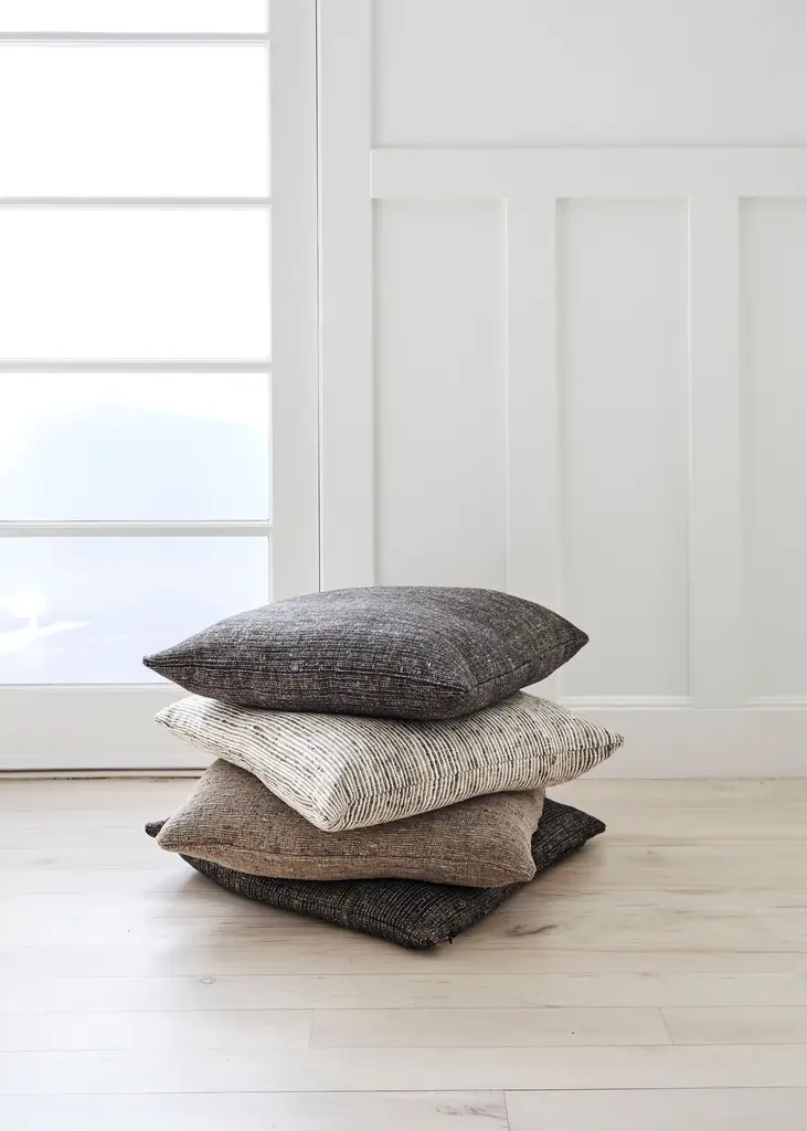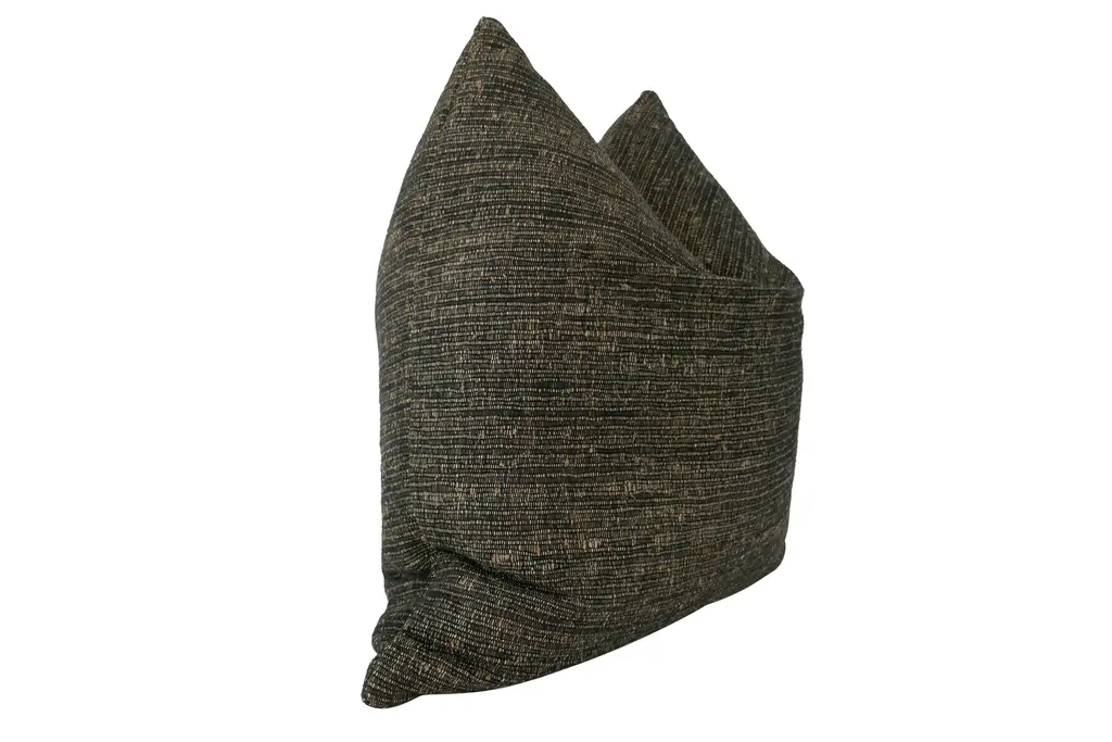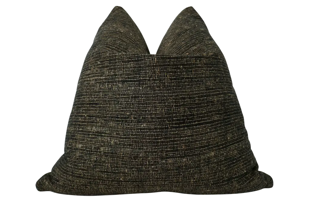 Beautiful hand cut-and-sewn large pillow in solid ultra-luxe heavy textural Italian loomed rolled textural silk textile. Shown in variegated black tone's. 70 ounce Ultra-Plump down-and-feather insert, invisible zipper closure. Fully muslin lined. Impeccably created by Fragments Identity in California.