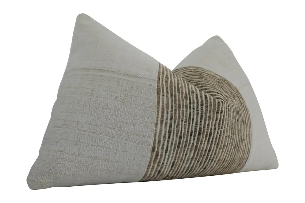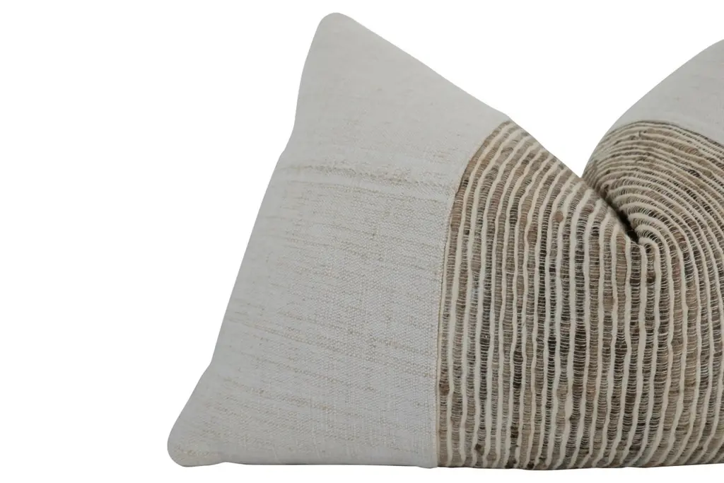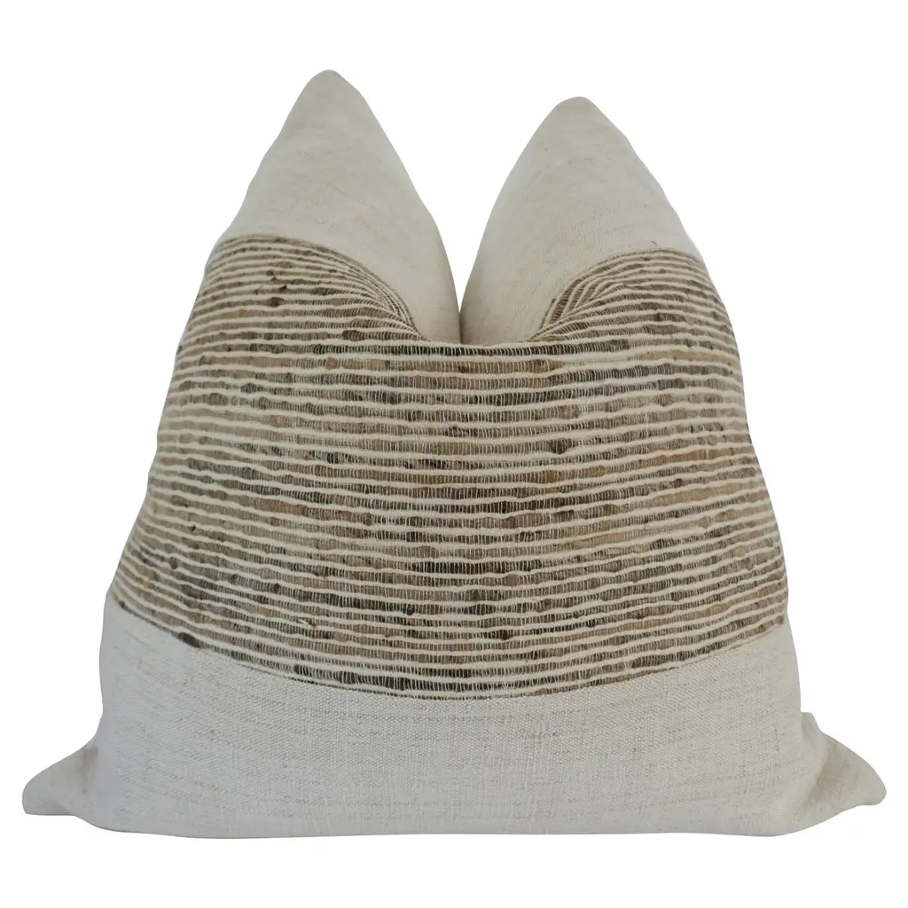 From our vintage Global textile collections. Hand cut-and-sewn pillow in authentic hand-spun natural organic French linen. Banded with luxe Italian loomed raw rolled silk in neutral variegated camel color-way. Ultra-Plump down-and-feather insert, zipper closure, full muslin lining.Impeccably created by Fragments Identity in sunny California!