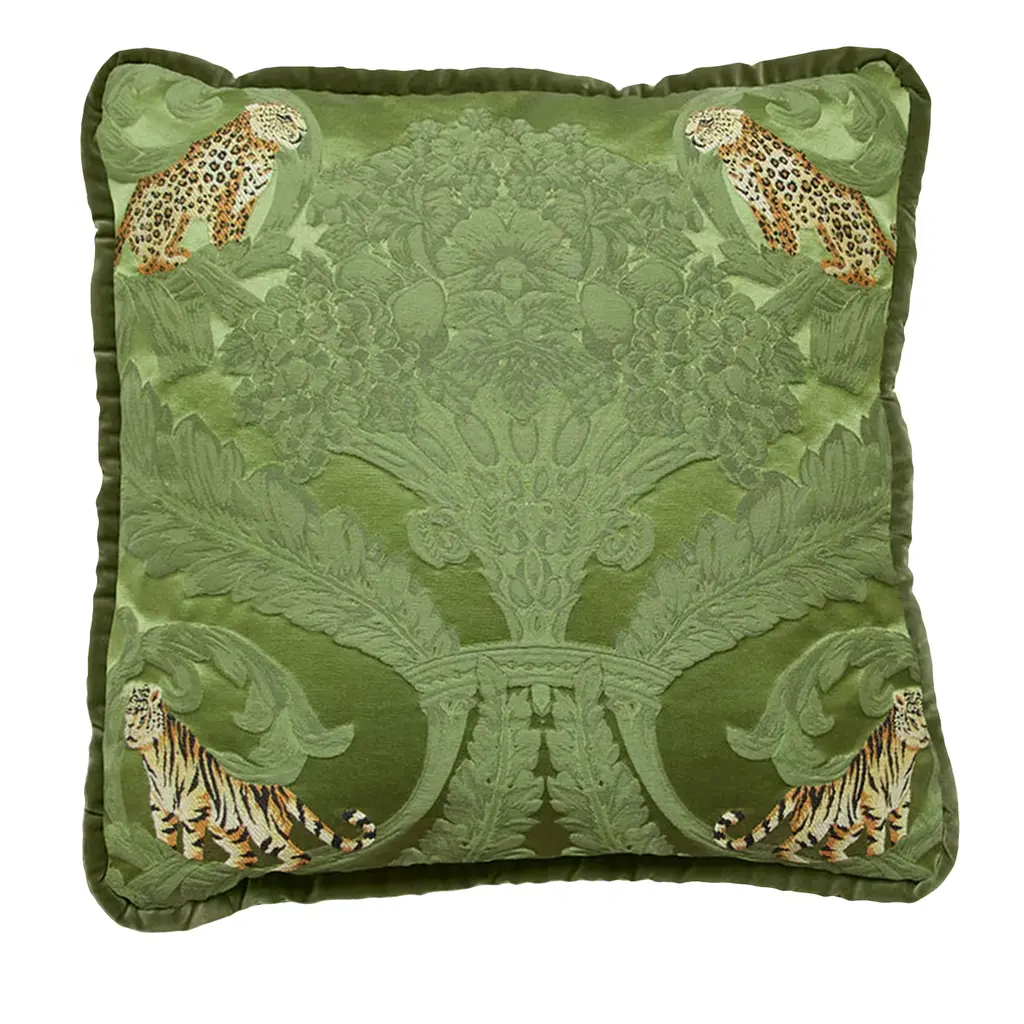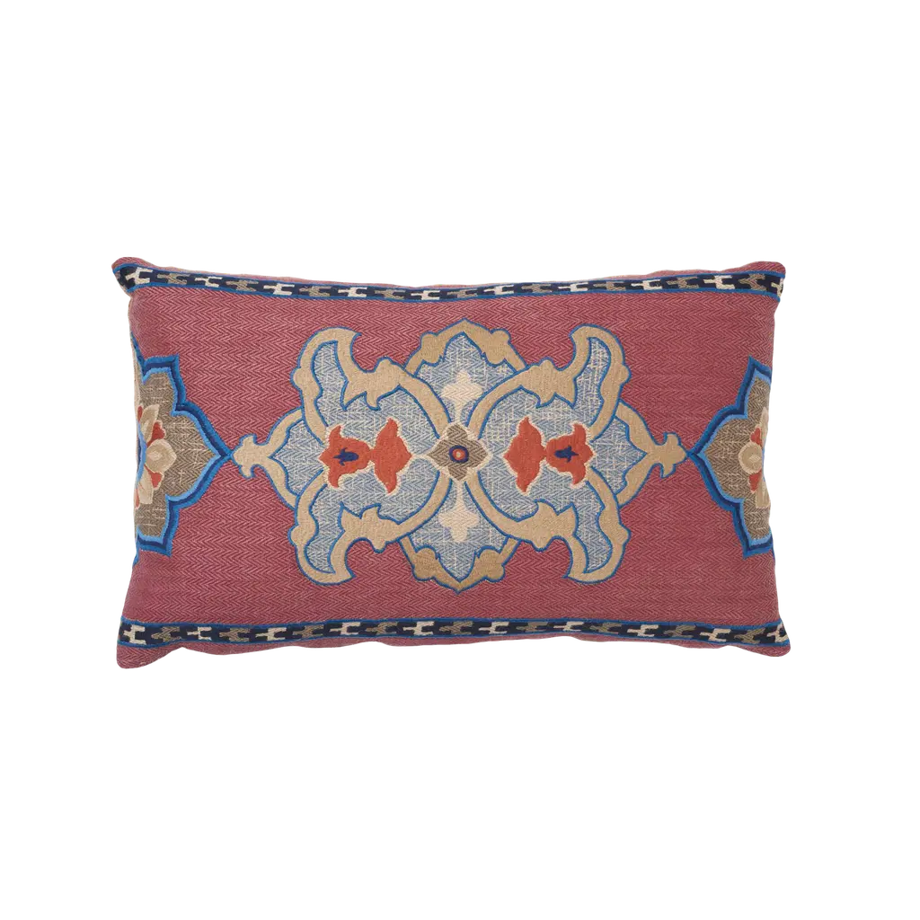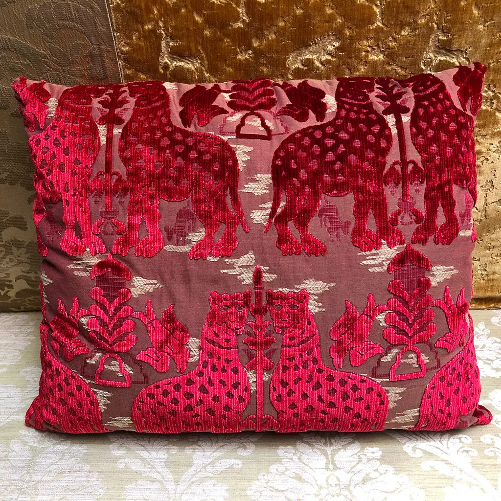 An elegant velvet where the main motif is animals that defend the sacredness of the tree of life symbol of eternal life. This is a reproduction of a thirteenth-century drawing. Masterfully crafted with vibrant colors, this piece creates a striking visual impact in a modern living room or traditional bedroom. This piece is finished with zipper closure.