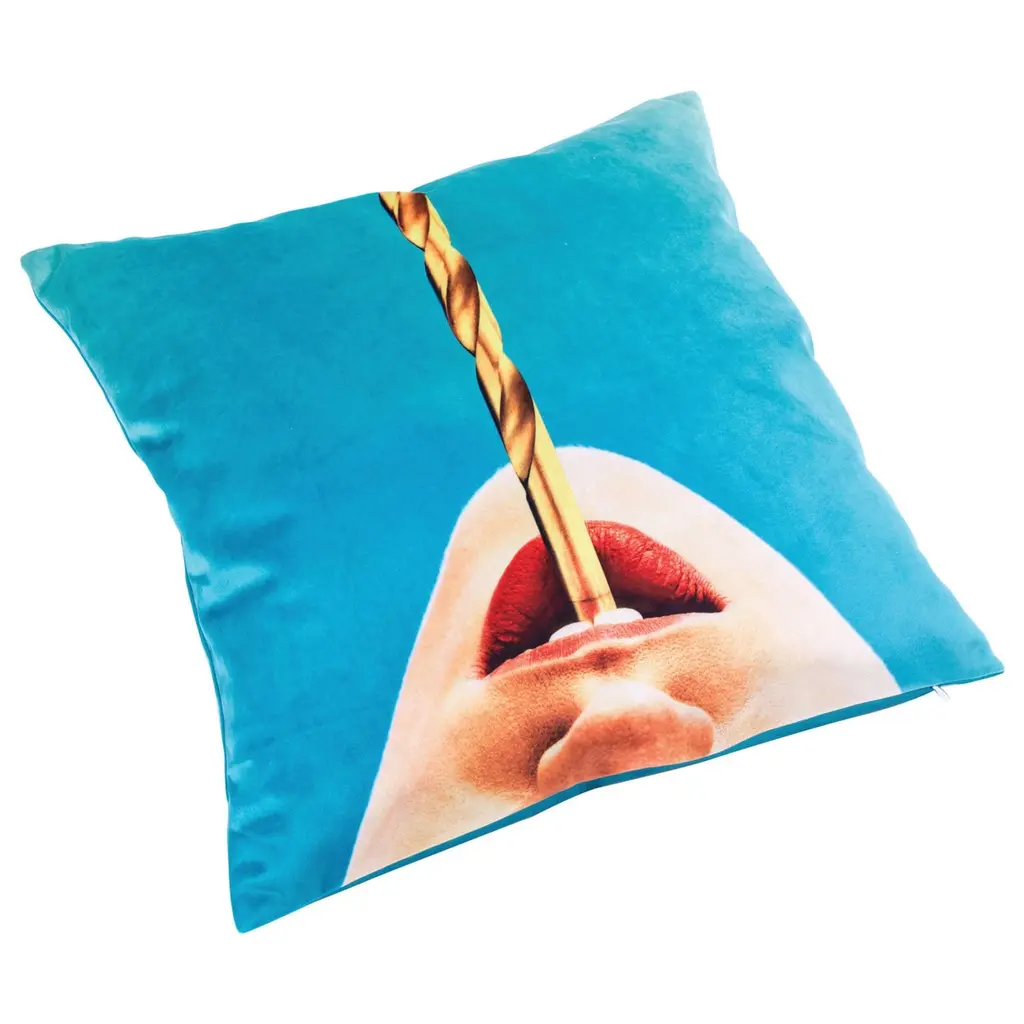 A collaboration between an Italian design company and a provocative image-only magazine, the Seletti Wears Toiletpaper collection of plates, mugs, and other household items toes the line between art and everyday object with its kitschy mix of pop iconography, candy-colored pastels, and dark humor. Velvet pillow with an image pulled from from the pages of Maurizio Cattelan and Pierpaolo Ferrari's edgy arthouse magazine, Toiletpaper.