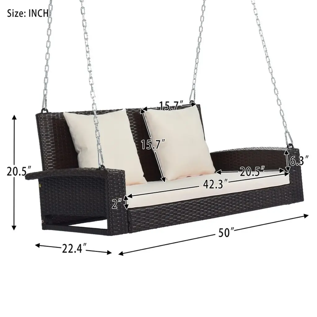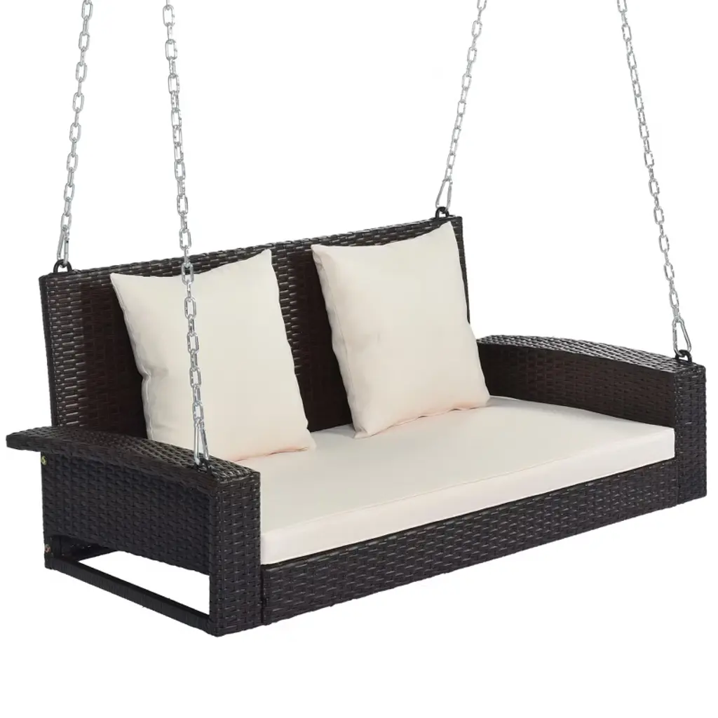 Enjoy cozy outdoor moments with this 2-Person Wicker Hanging Porch Swing. Crafted with sturdy white PE rattan and a durable steel frame, this swing ensures strength and weather resistance. The thick gray cushion and pillow provide ultimate comfort, while the included heavy-duty chains guarantee stability and safety. Perfect for porches, gardens, backyards, patios, or pondside relaxation.