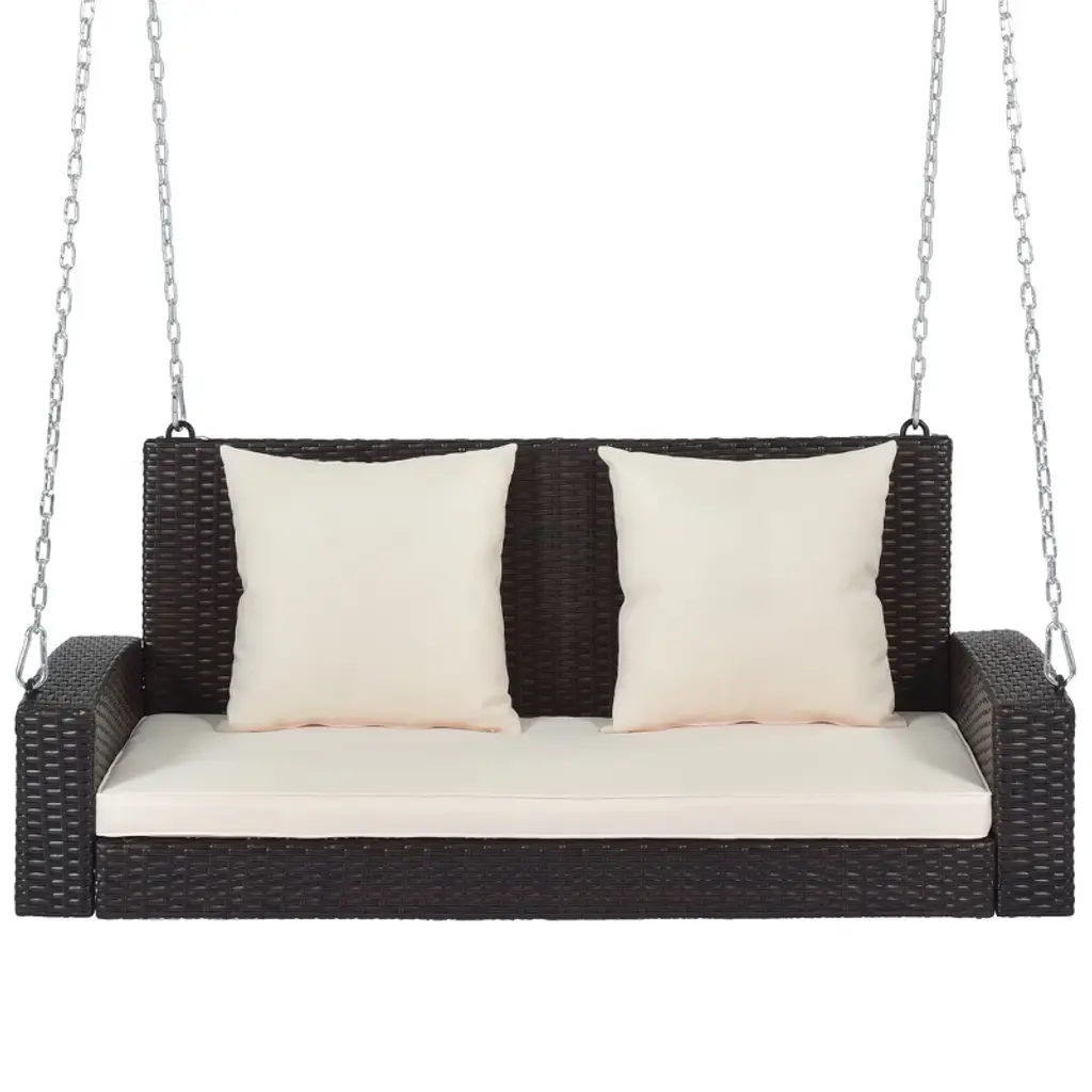 Fioneca 2-person Wicker Hanging Porch Swing With Cushion & Pillow, Outdoor Rattan Swing Bench With Chains For Garden, Backyard, Pond (White/gray)