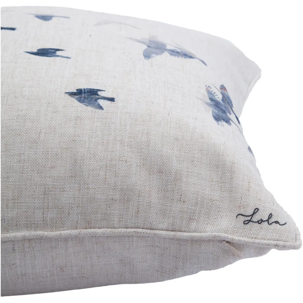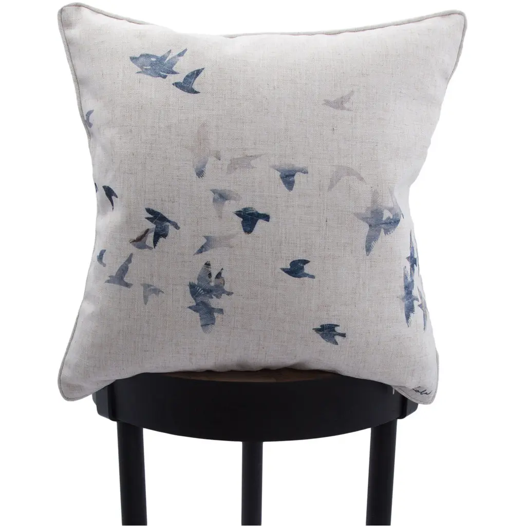 Compose a chic pillowscape on couches and beds with the traditional style of this decorative pillow. Printed in graphic detail on a square pillowcase, blue silhouettes of a flying flock of birds cross the off-white background in a charming design that turns an ordinary cushion into a captivating work of art. A sumptuous combination of duck feathers and down fill the standard pillow sham with enduring softness, offering comfortable cushioning for every seating or sleeping arrangement.