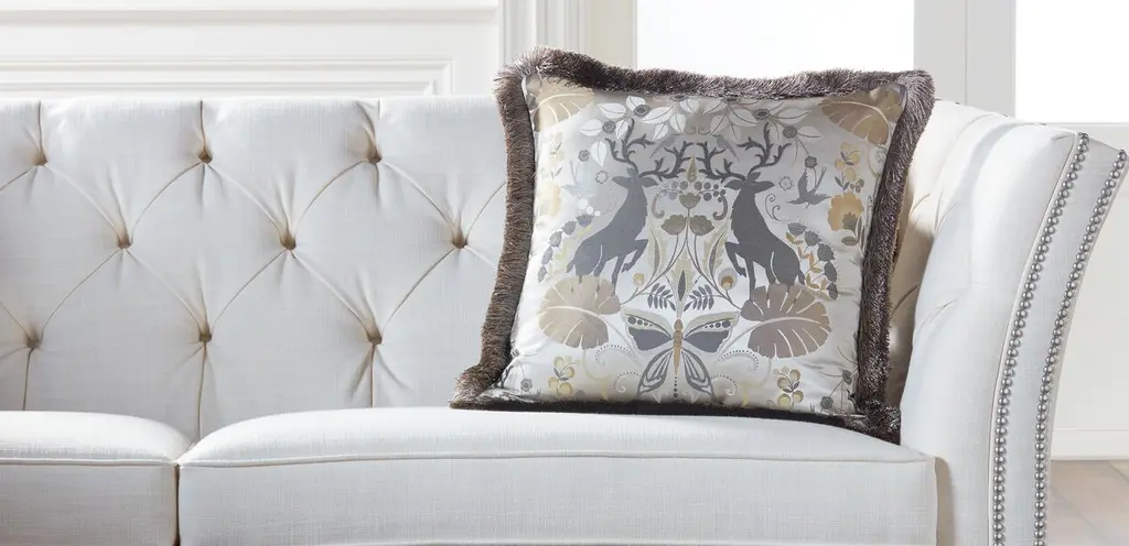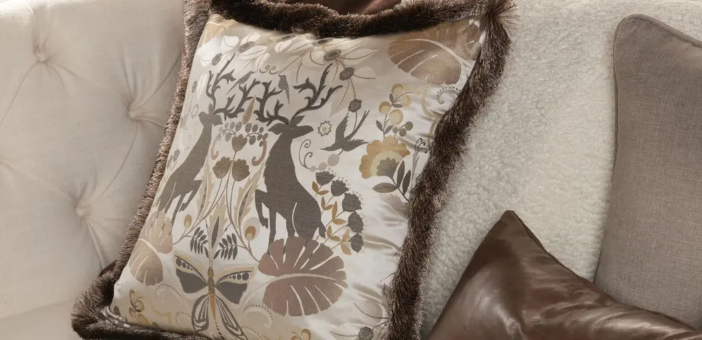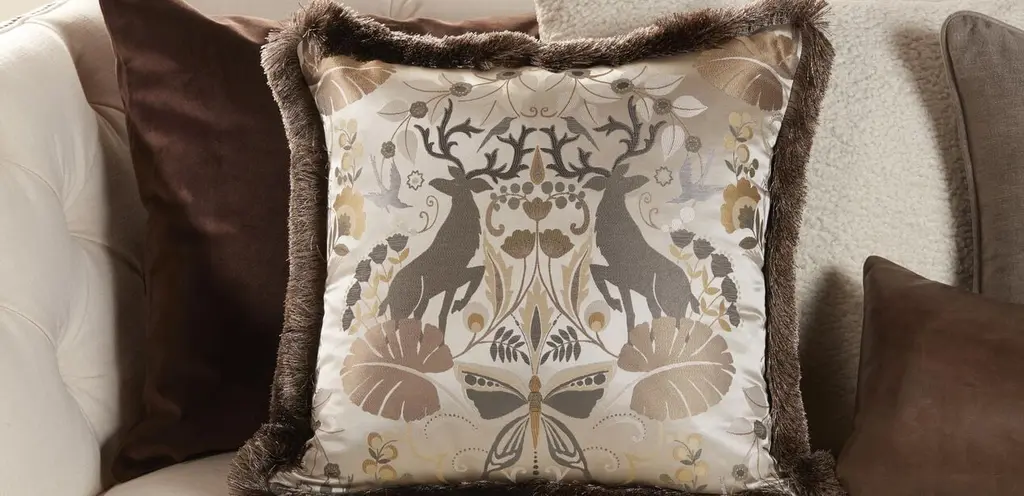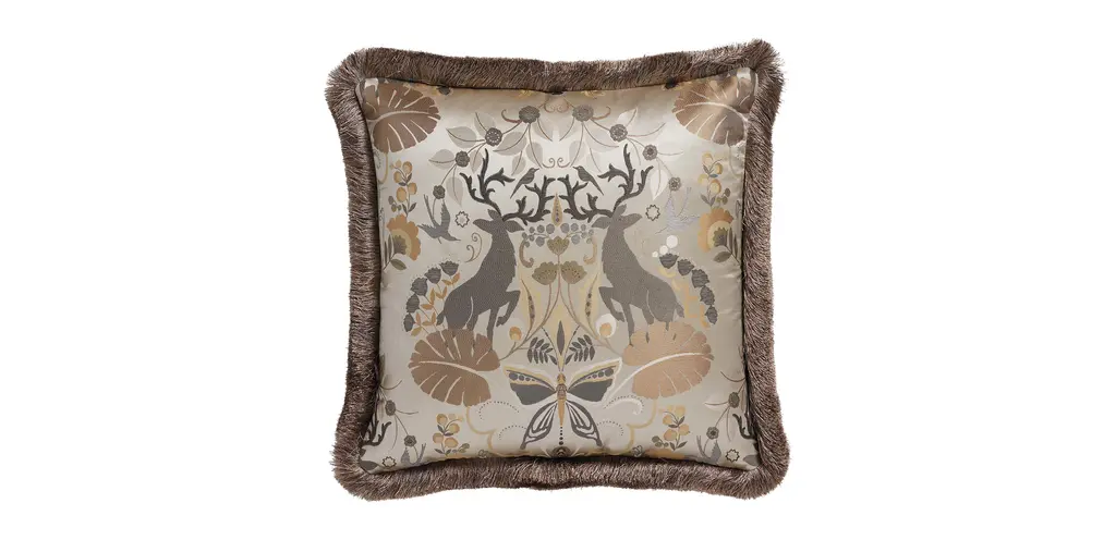 Bring a European country home feel to your personal manor with this stunning jacquard pillow. The custom-look pattern is a meditation on nature, centered around the stately stag, with a silken texture and lush fringe that add sheen and refinement.