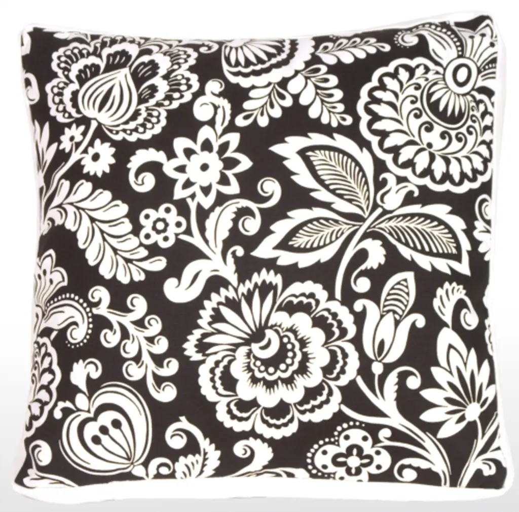 A bold large scale floral in striking black and white cotton fabric! The added detail of the box edge in white completes the fashionable European design. The box edge also helps pillow sit upright on leather or vinyl furniture. The stylized flowers are beautifully done, and the eye catching contrast of the black and white fabric will add pizzazz to your decor. The right scale of pillow for a loveseat, sofa or sectional. Set against black furniture in your family room, this pillow will pop with personality. Coordinates beautifully with crisp white sheets in your guest room. Stylish in a dorm room or teen girl's bedroom. Soften your wicker furniture in your sunroom with this charming floral themed fabric. Add this pillow to your master bedroom for a dramatic flourish. Mix and match this pillow with its cousins on a window seat to create a soft, inviting oasis. Size: 16"x16" Square Fabric: 100% Cotton Same fabric, front and back 2.5"x2.5"x2.5" box edge seams Color matched zipper closure Machine wash, cold