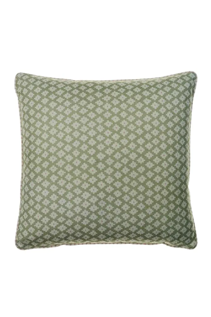 A soft and plump square cushion created from our small-scale geometric Maze fabric in pretty Pink, with a pop of zingy orange. Finished with a smart ticking stripe, Picket, this design can easily be incorporated into your interiors alongside the other prints and complementing colors of the Garden Path collection, a homage to the English Garden. - Pink, Orange,  Green,  Blue