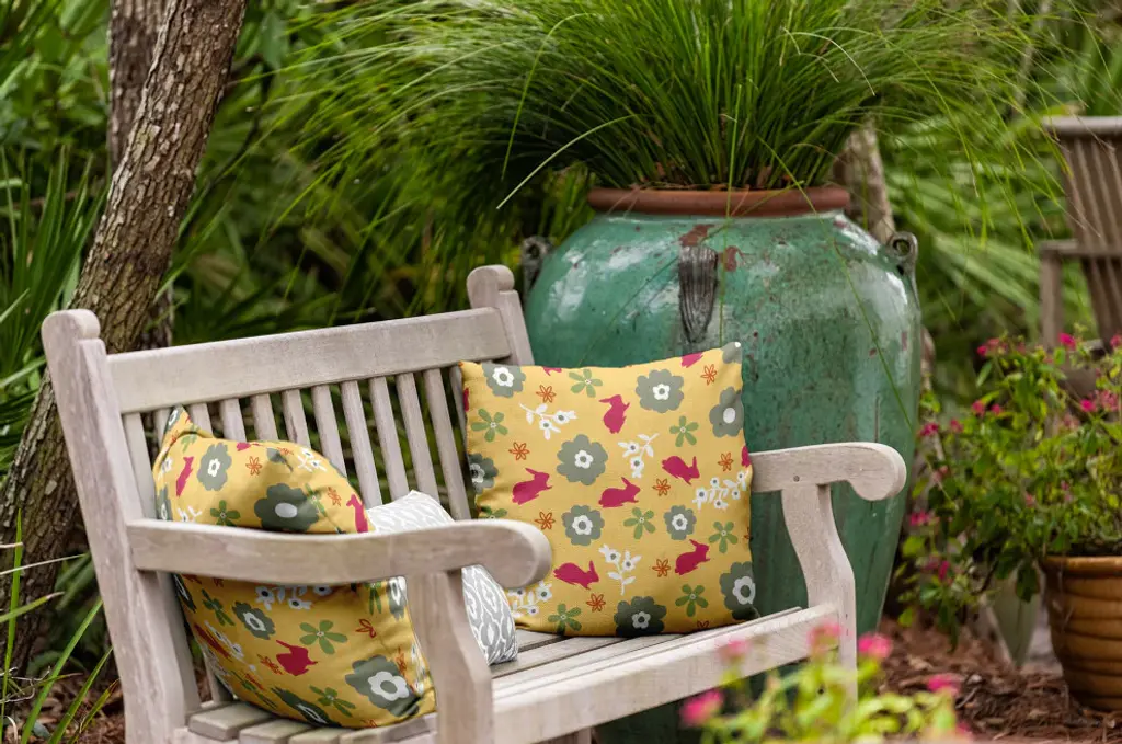 Beautify your home with a Flowery Love with Bunnies Pillow from our Flower Power Collection. This indoor/outdoor pillow will add the joy and color to your porch, deck or patio that you''ve been looking for! This decorative pillow is printed on both sides and crafted with a soft, durable polyester exterior, and filled with down alternative for a crisp look and a comfortable sitting experience. The fabric is resistant to weather, mold, and mildew so you can accentuate your indoor or outdoor decor. It is sewn closed with a knife edge and can be easily spot cleaned or dry cleaned. With floral designs and partner patterns, your home decor will be sunny and vibrant.
