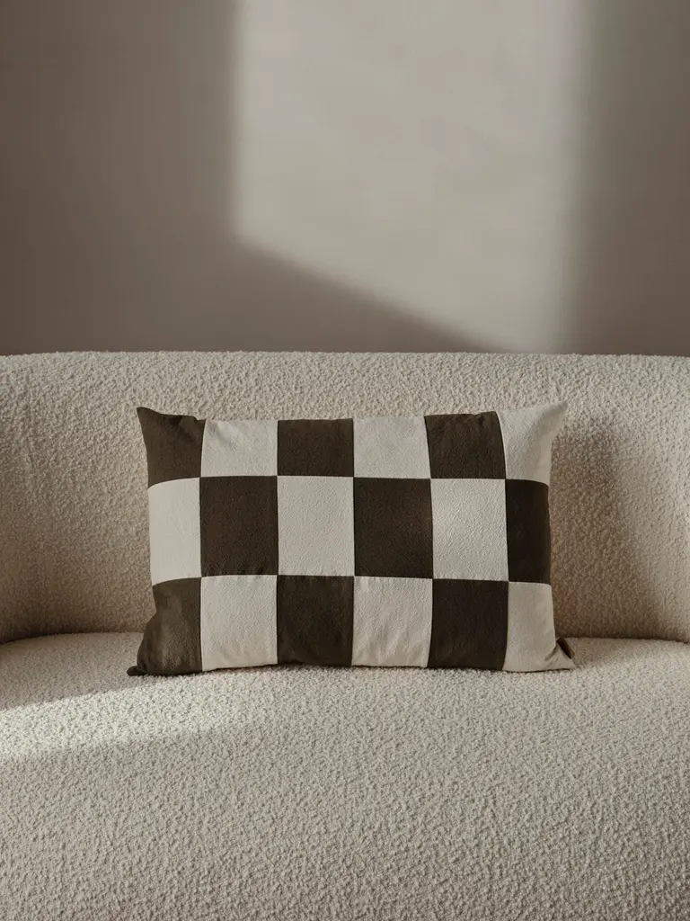 The Fold Patchwork Cushion presents a classic check pattern. Made from GOTS certified, organic cotton, the cushion cover is a testament to skilled craftsmanship, with each section carefully constructed to form a timeless design. The use of washed cotton not only adds to its aesthetic charm but also ensures a soft, inviting tactility, making it a perfect addition to any space.