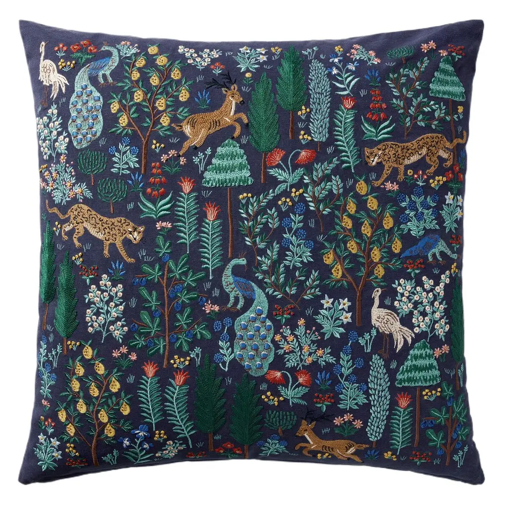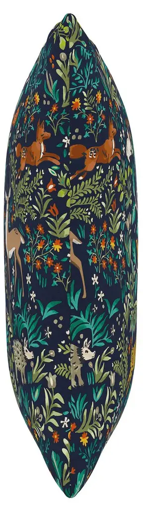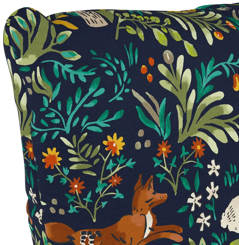 Add a fun pop of pattern to a favorite sofa or chair with this reversible throw pillow, made from cotton fabric with a charming woodland motif on a dark blue ground. Insert included.