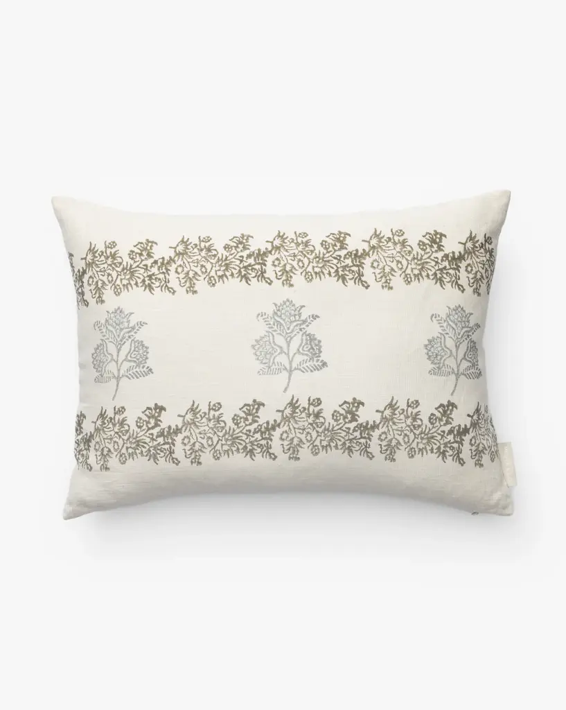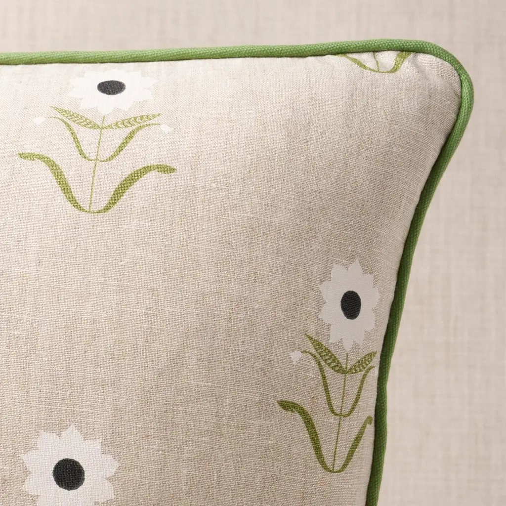 This pillow features Forget Me Nots by Peg Norriss. Forget Me Nots fabric derives its simple stylized floral pattern from a painting by artist Clare Rojas. A unique interpretation of a familiar motif, this medium-scale print works in traditional and modern settings. Pillow is finished with a welt in Elliott Brushed Cotton. Welt contents: 100% cotton. Pillow includes a feather/down fill insert and hidden zipper closure.