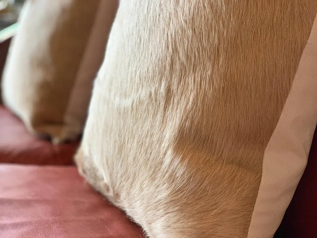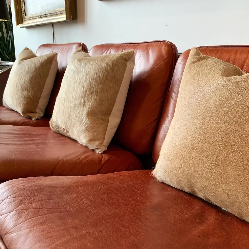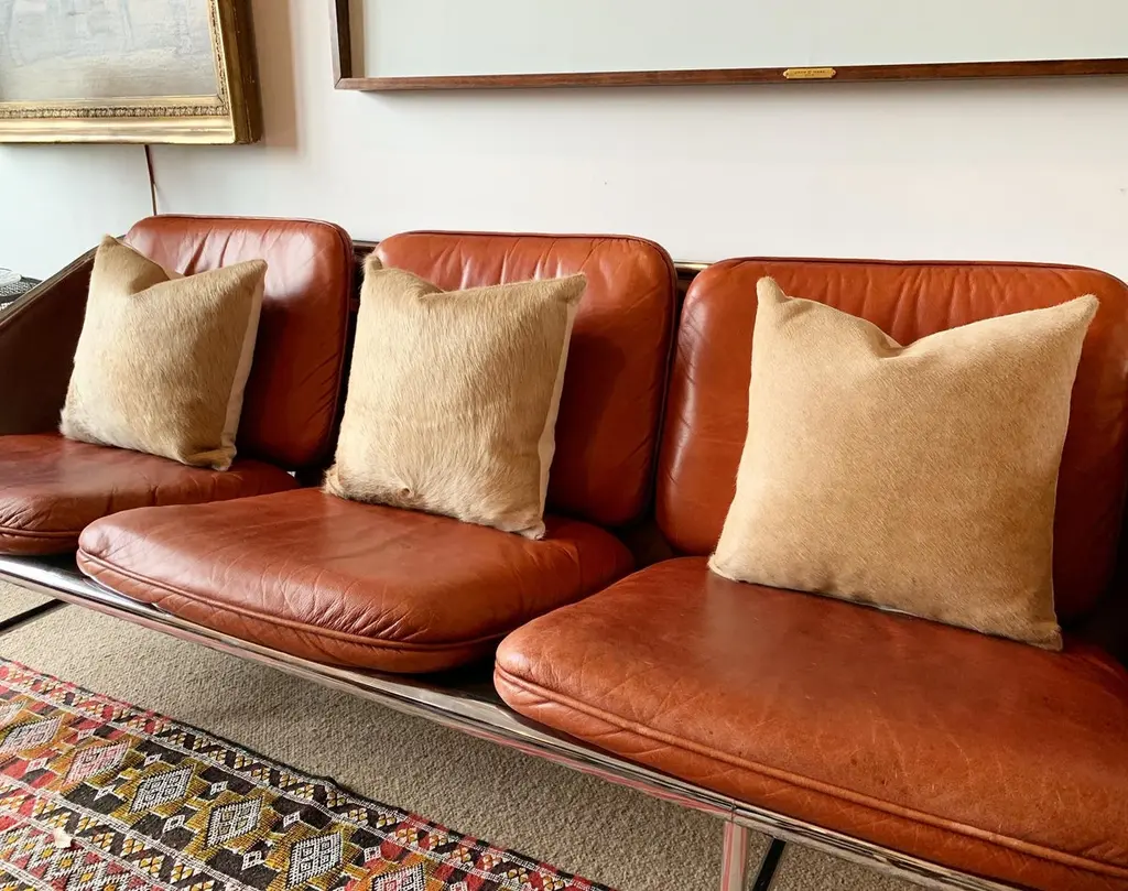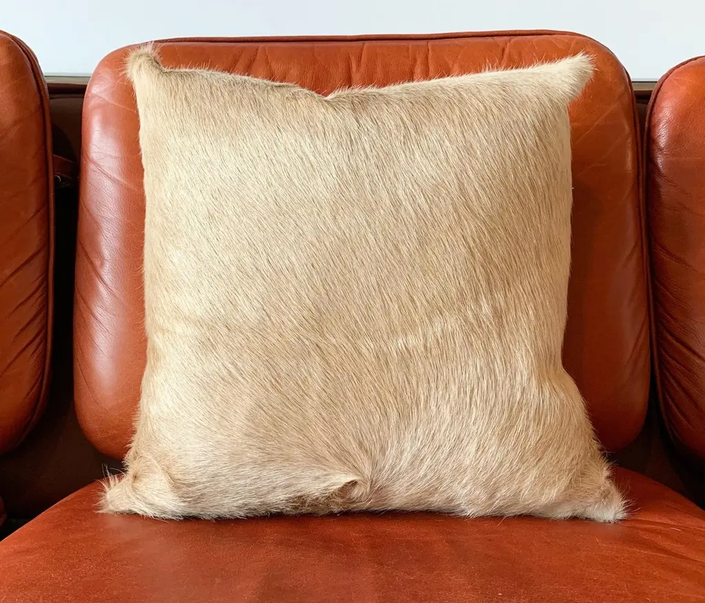 Forsyth cowhide pillows are simply the best. The most beautiful cowhides are selected, handcut, handstitched, and hand stuffed with the finest goose down. Each step is meticulously curated by Saint Louis based Forsyth artisans. Details:18 x 18 inches100% natural cowhide from BrazilCowhide front is finished with ivory cotton canvas backHidden zipperFeather and alternative down mix insert includedHandcrafted in Saint Louis.