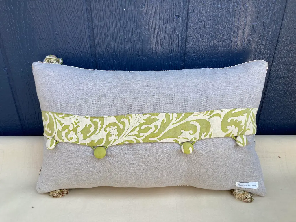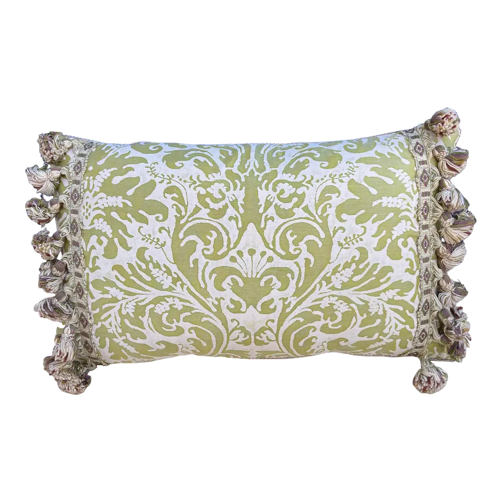 A pillow made from Fortuny’s iconic printed cotton embellished with vintage tassel fringe, a down insert is included