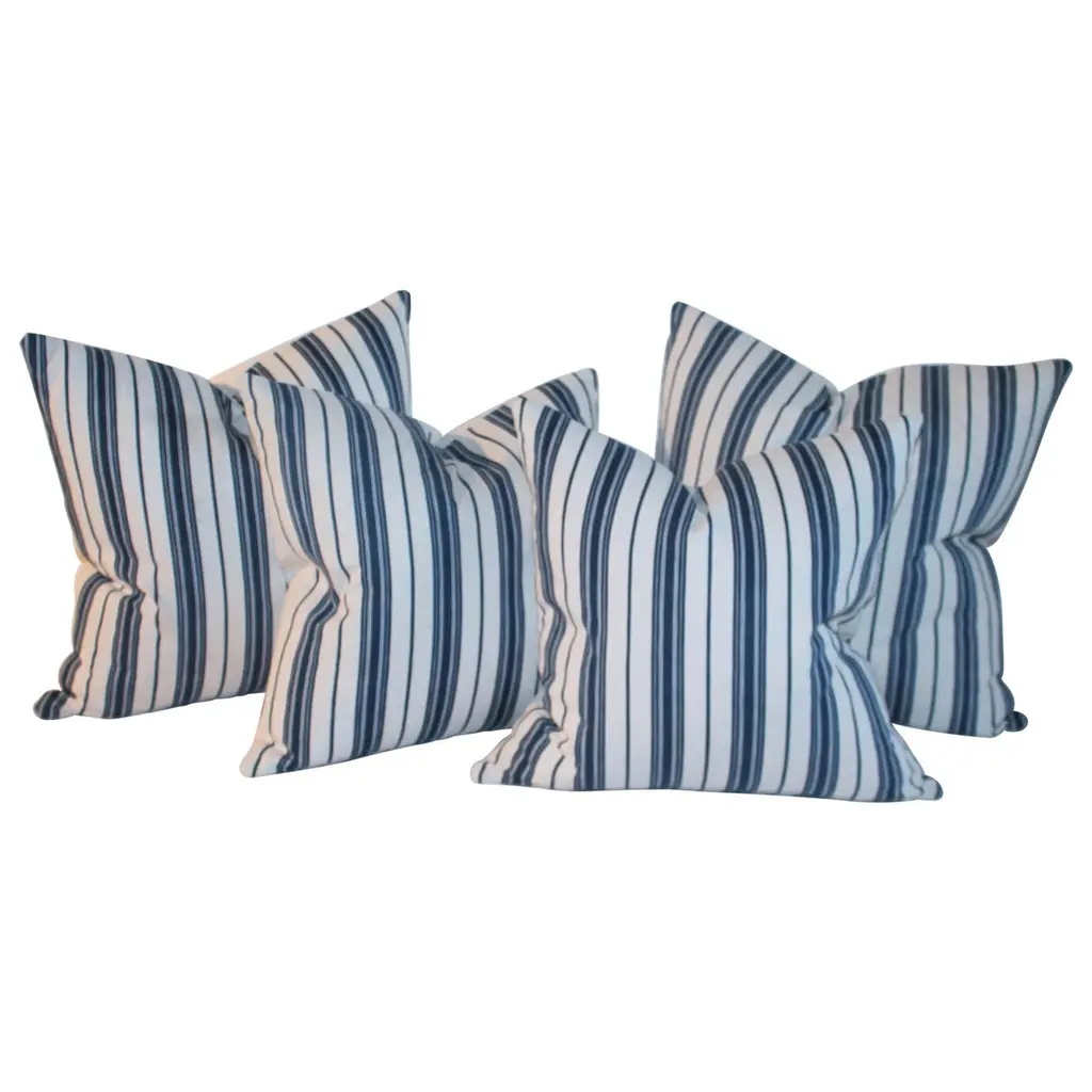 These 19th century candy stripe ticking pillows have a cream cotton linen backing. They are down and feather fill. Two pairs of pillows.
