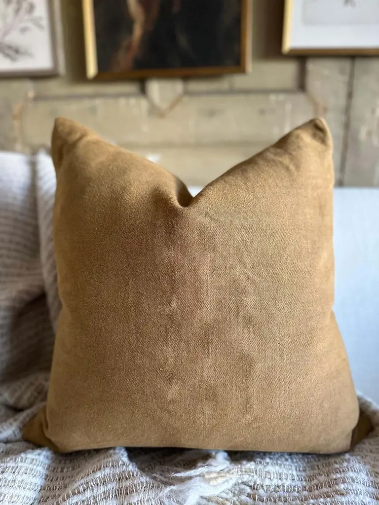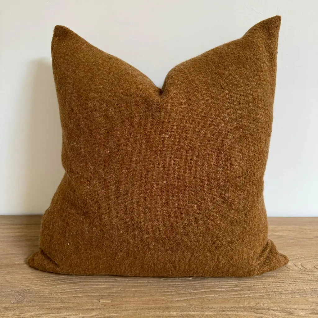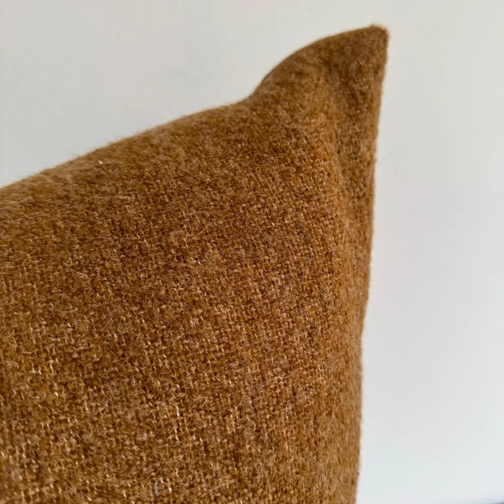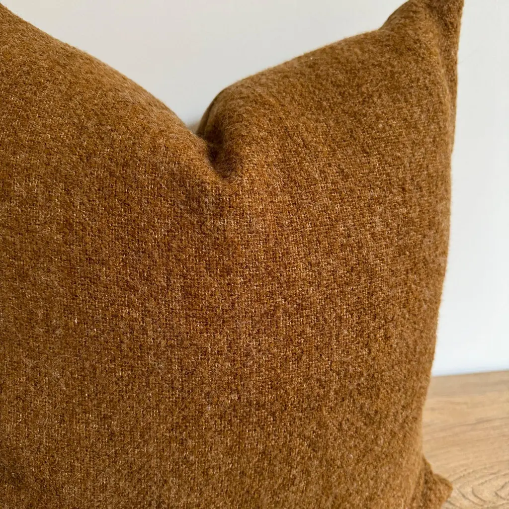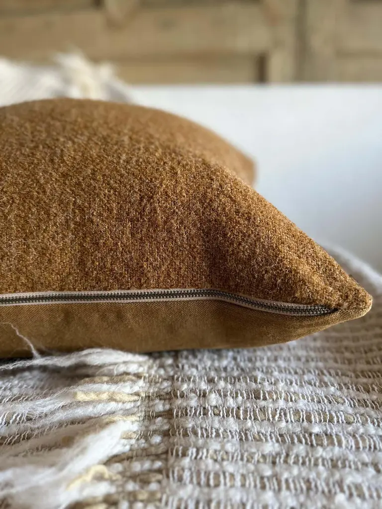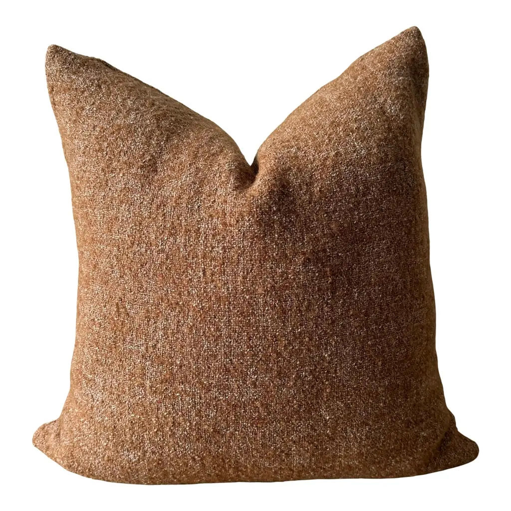 A luxurious heavy woven bouclette wood & linen face with stone washed linen back.Linen fabric is imported from France.Custom made to order, can be customized to your size.Color: HavaneAntique brass zipperSize 22x22Includes Down Feather InsertCare: Can be machine washed cold / for best results dry cleaning is recommended.