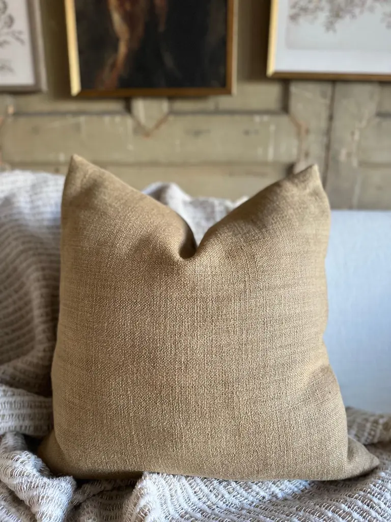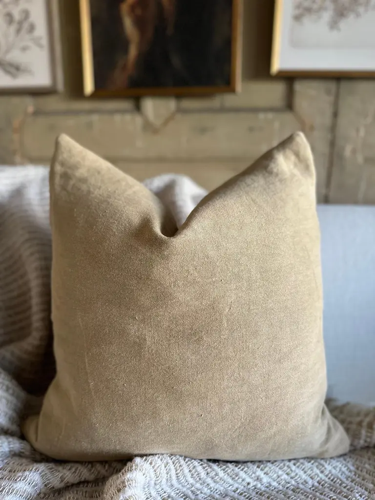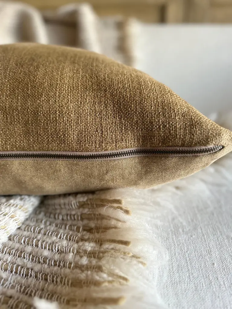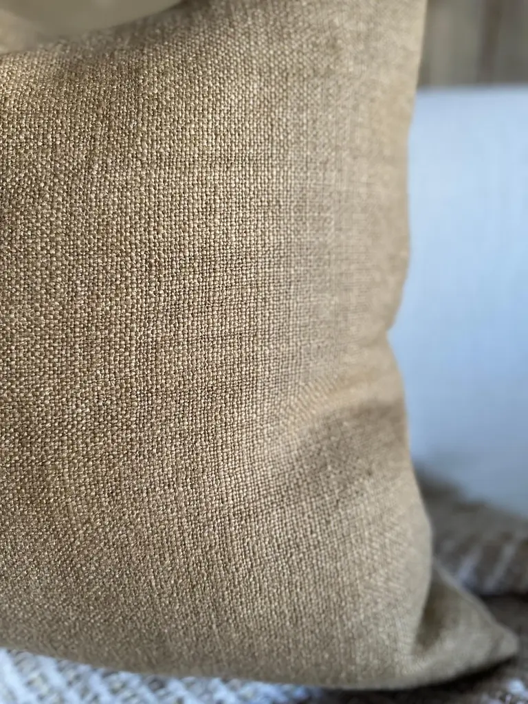 A luxurious heavy woven linen face with stone washed linen back.Linen fabric is imported from France.Custom made to order, can be customized to your size.Color: HavaneAntique brass zipperSize 22x22Includes Down Feather InsertCare: Can be machine washed cold / for best results dry cleaning is recommended.