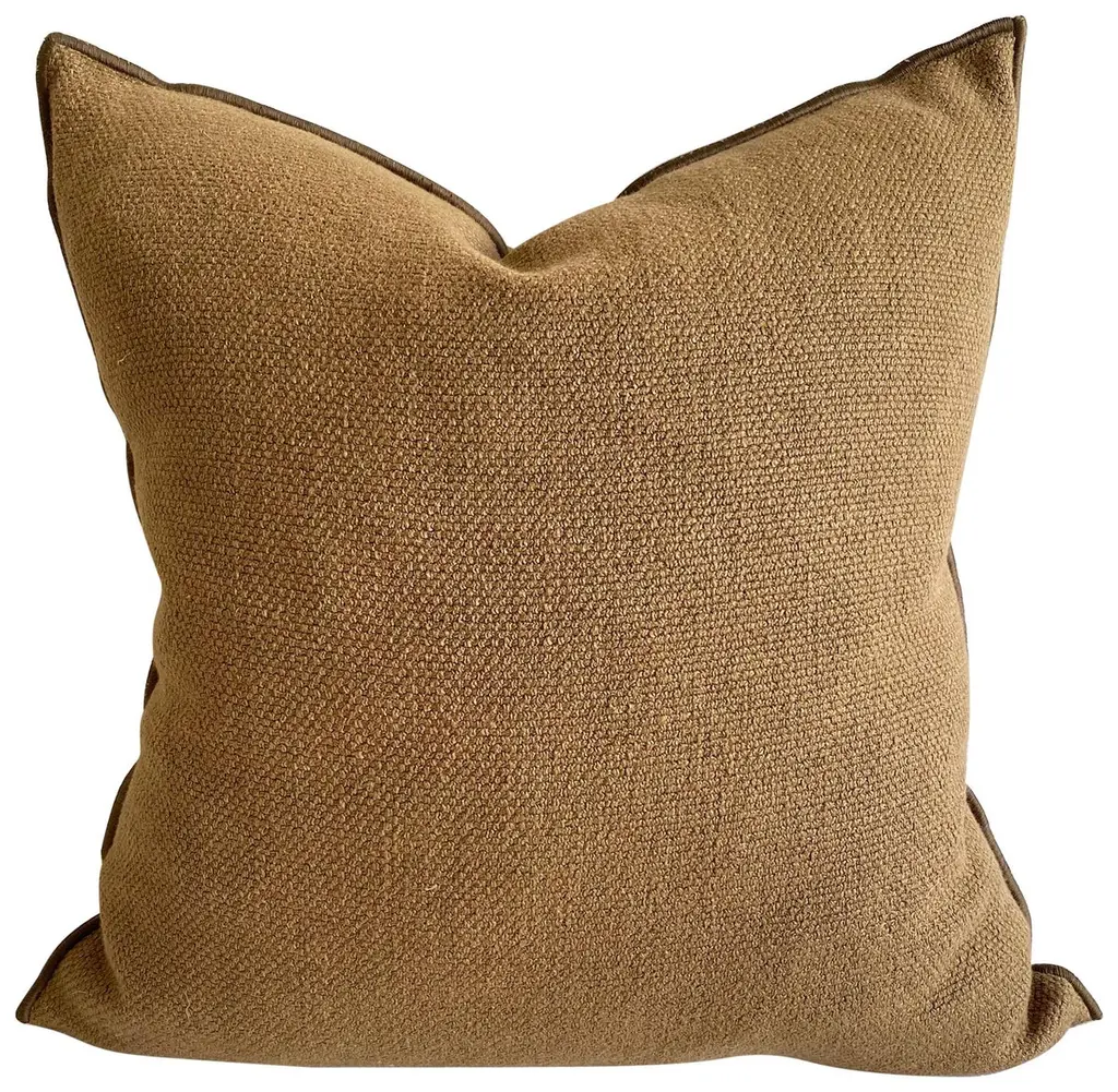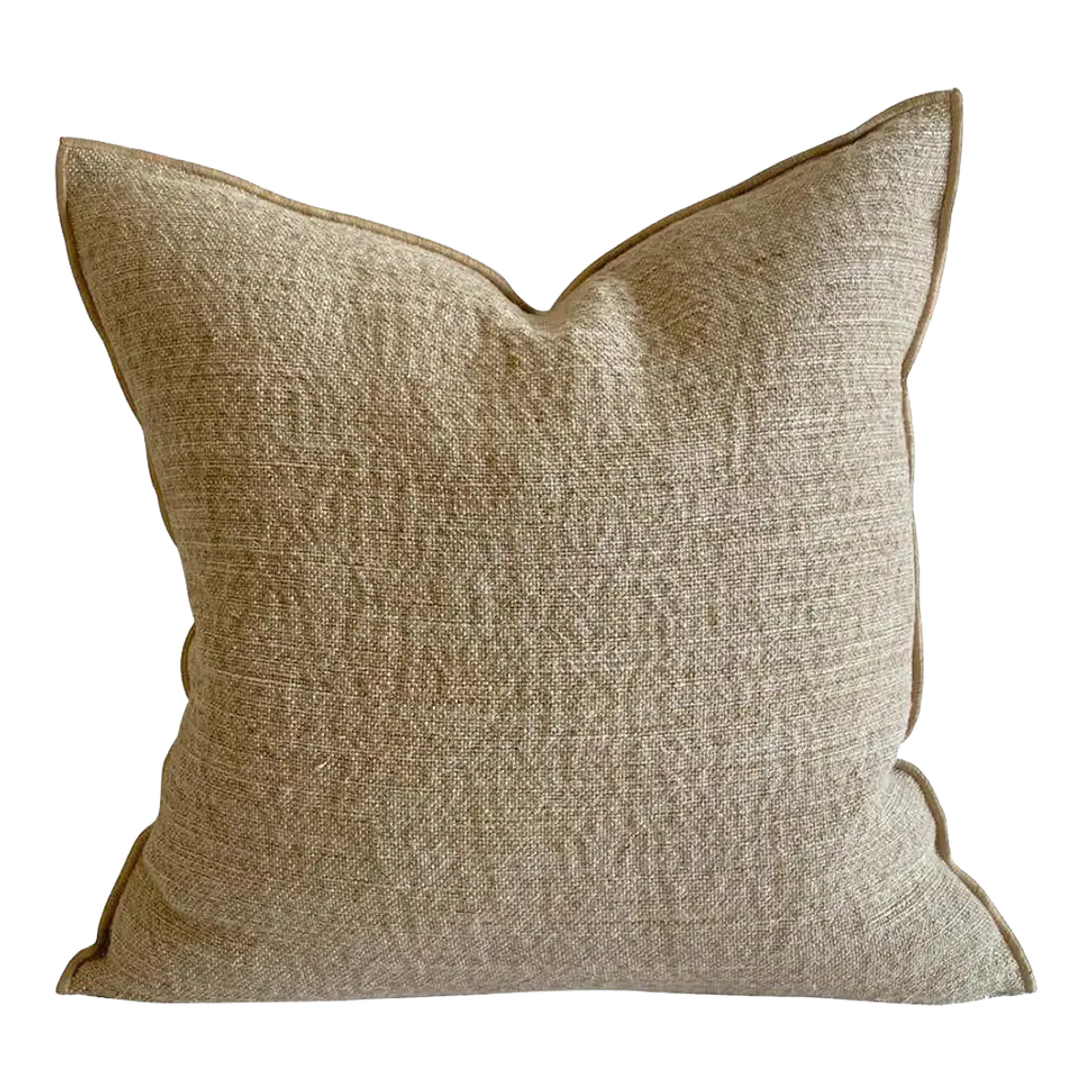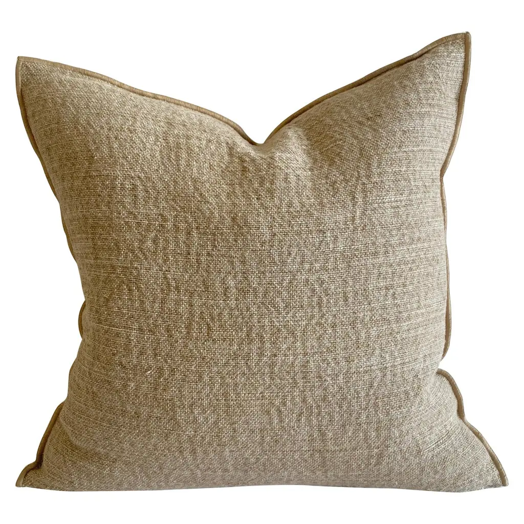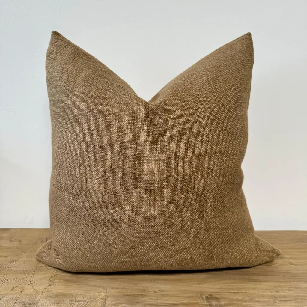 A luxurious heavy woven linen face with stone washed linen back.Linen fabric is imported from France.Custom made to order, can be customized to your size.Color: HavaneAntique brass zipperSize 22x22Includes Down Feather InsertCare: Can be machine washed cold / for best results dry cleaning is recommended.