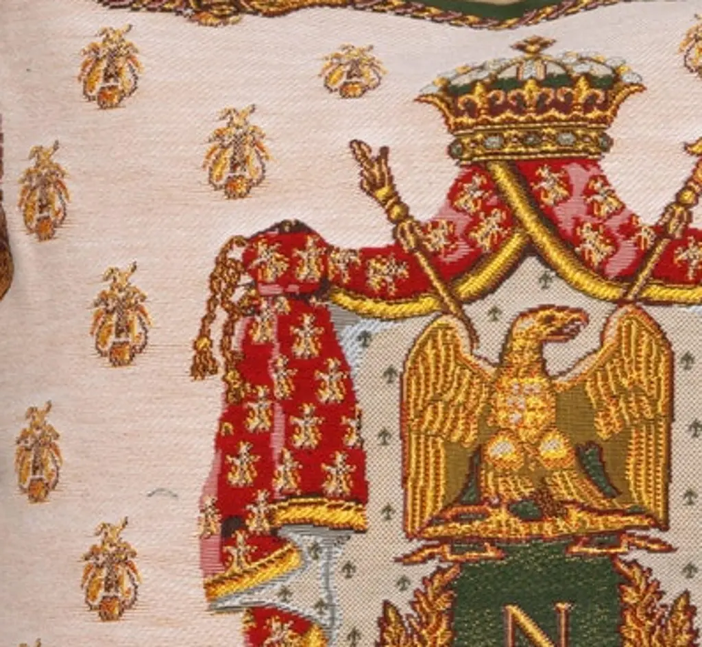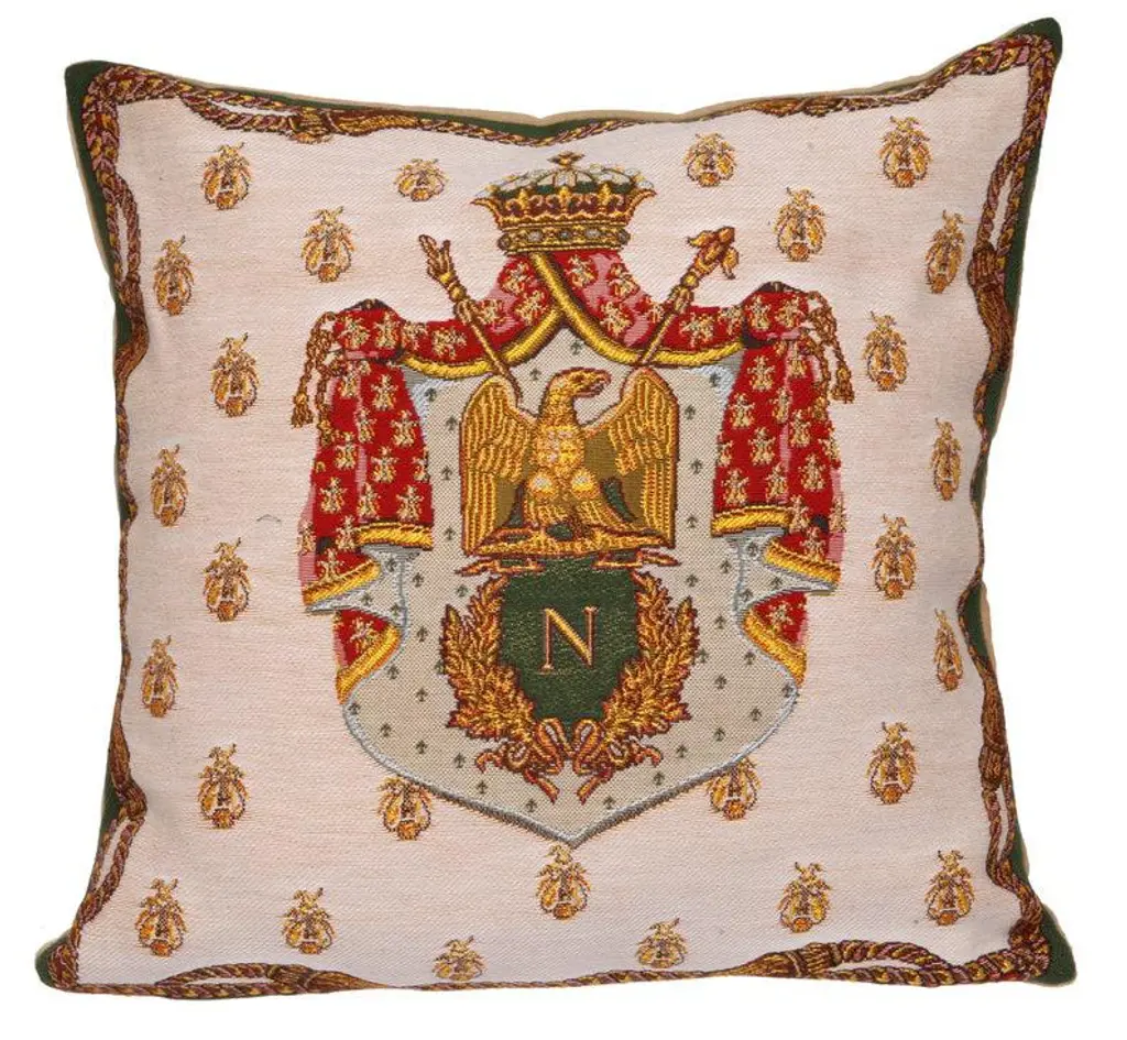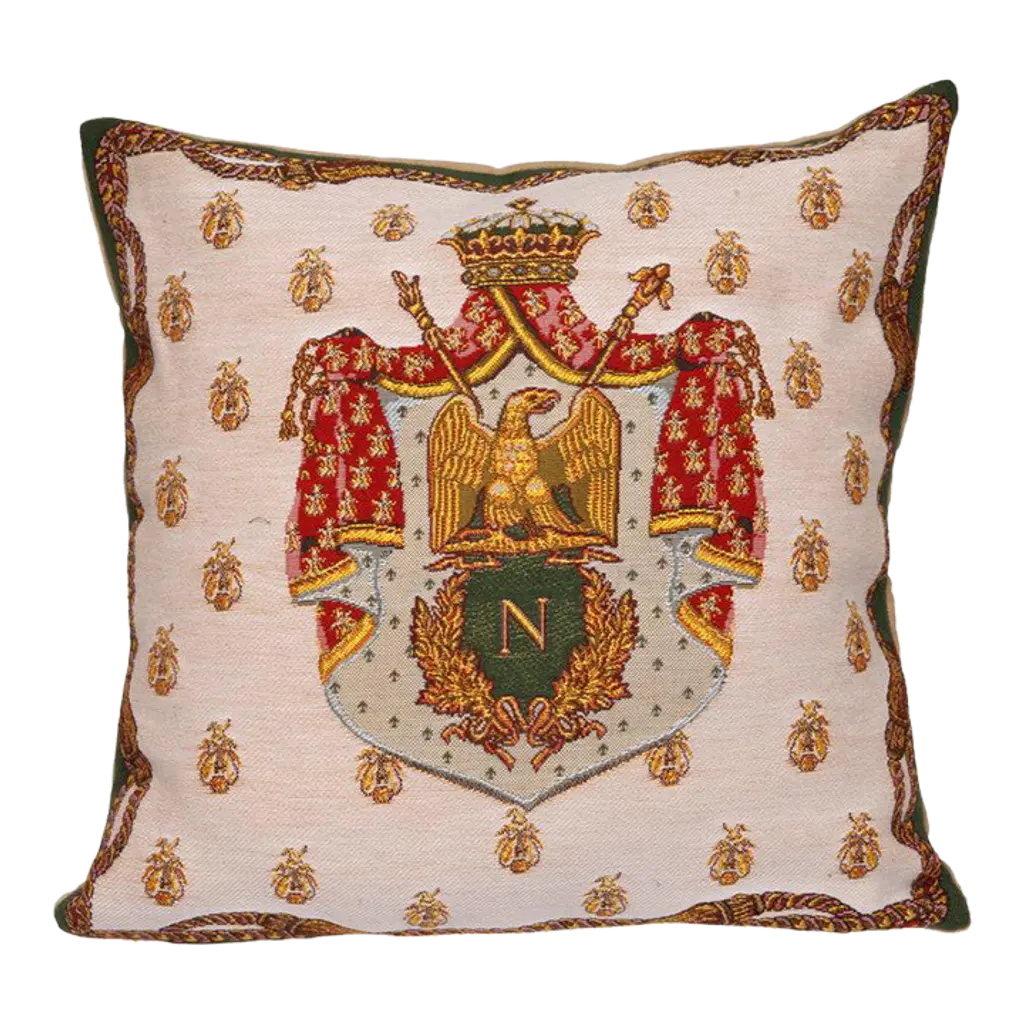 Stunning custom-tailored pillow in a woven jacquard fabric depicting the French Royal Napoleon Coat of Arms crest with crown and Napoleonic bees. Tan-colored velvet fabric back. Zipper closure. Generous goose down-and-feather insert. Excellent new, unused condition!!! ***PLEASE NOTE: If you purchase more than one pillow or more than one pair of pillows you may initially be charged extra shipping costs at checkout. However, I always combine items into one box when possible and I will alert Chairish to refund any overage paid on shipping costs to you. Warm regards, Mike Seratt I SHIP OUT IMMEDIATELY, SO THE ESTIMATION YOU SEE FOR THE DELIVERY TIMELINE IS CHAIRISH'S OVERALL GENERAL TIMELINE, BUT I WILL GET THIS OUT THE NEXT DAY AND DELIVERY IS USUALLY 5-7 DAYS AT MOST
