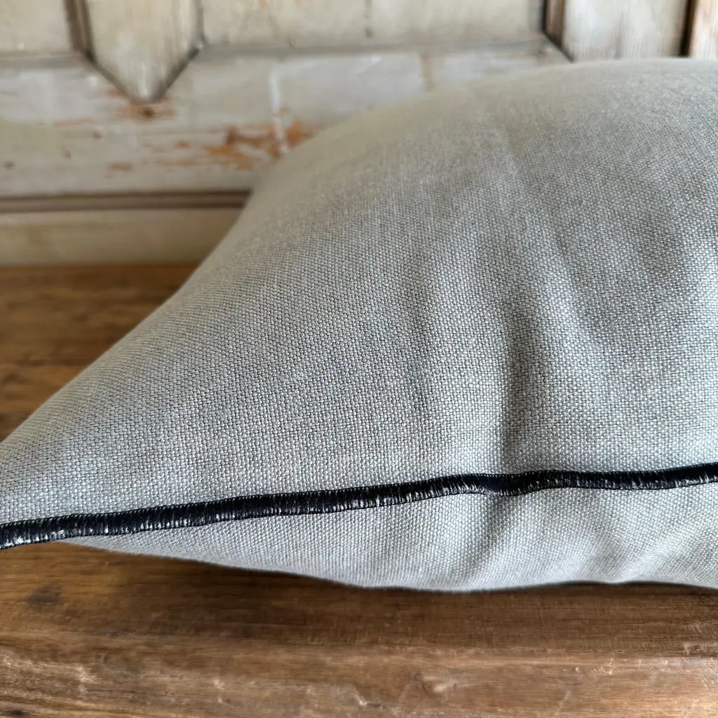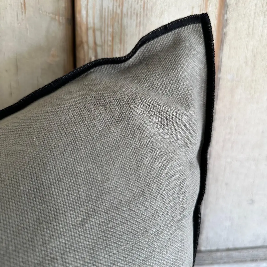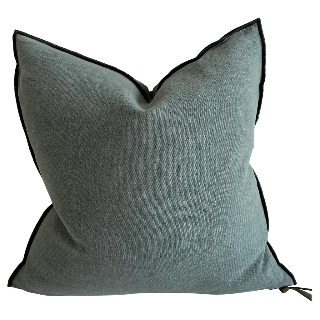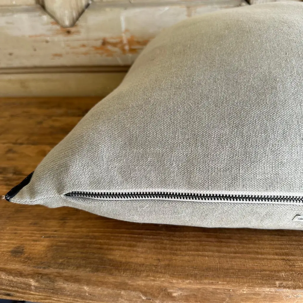 French stone washed linen accent pillow. Color : CAMO a deep muddy green with warm brown tones, this color reads a dark green gray, with a nubby textured style pillow with a stitched edge, metal zipper closure. Size: 22" x 22"Our pillows are constructed with vintage one of a kind textiles from around the globe. Carefully constructed with the finest textiles, with hidden zipper closure, and overlocked seams. Includes Feather Down Insert.Limited quantities available. If this item is backordered, please allow 6-8 weeks for production.