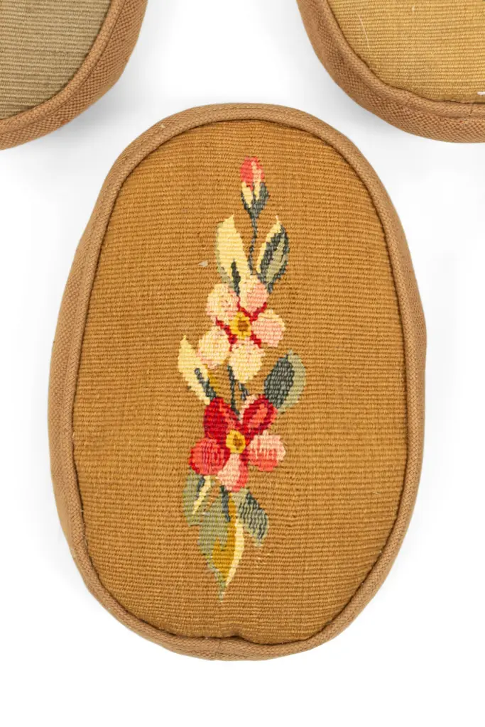 5 ASSORTED French Victorian Aubusson upholstered small oval cushions with multicolored floral design. (priced each).