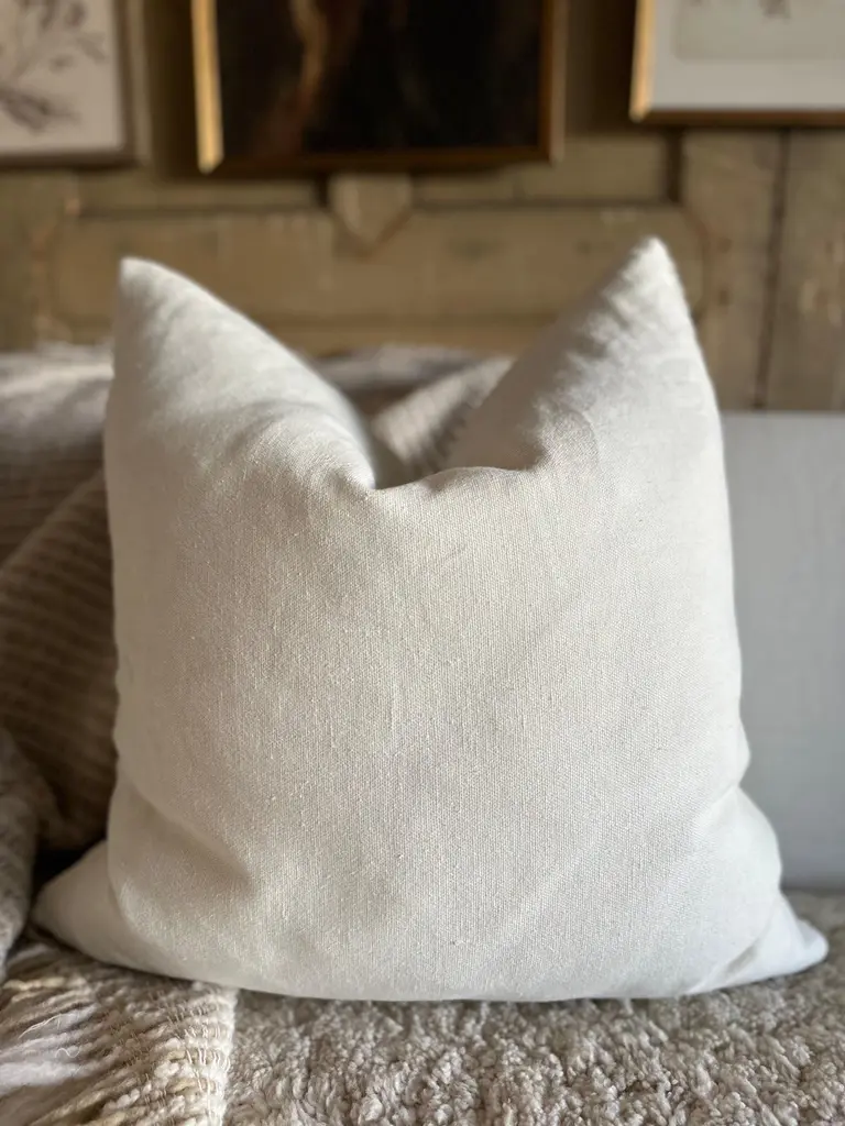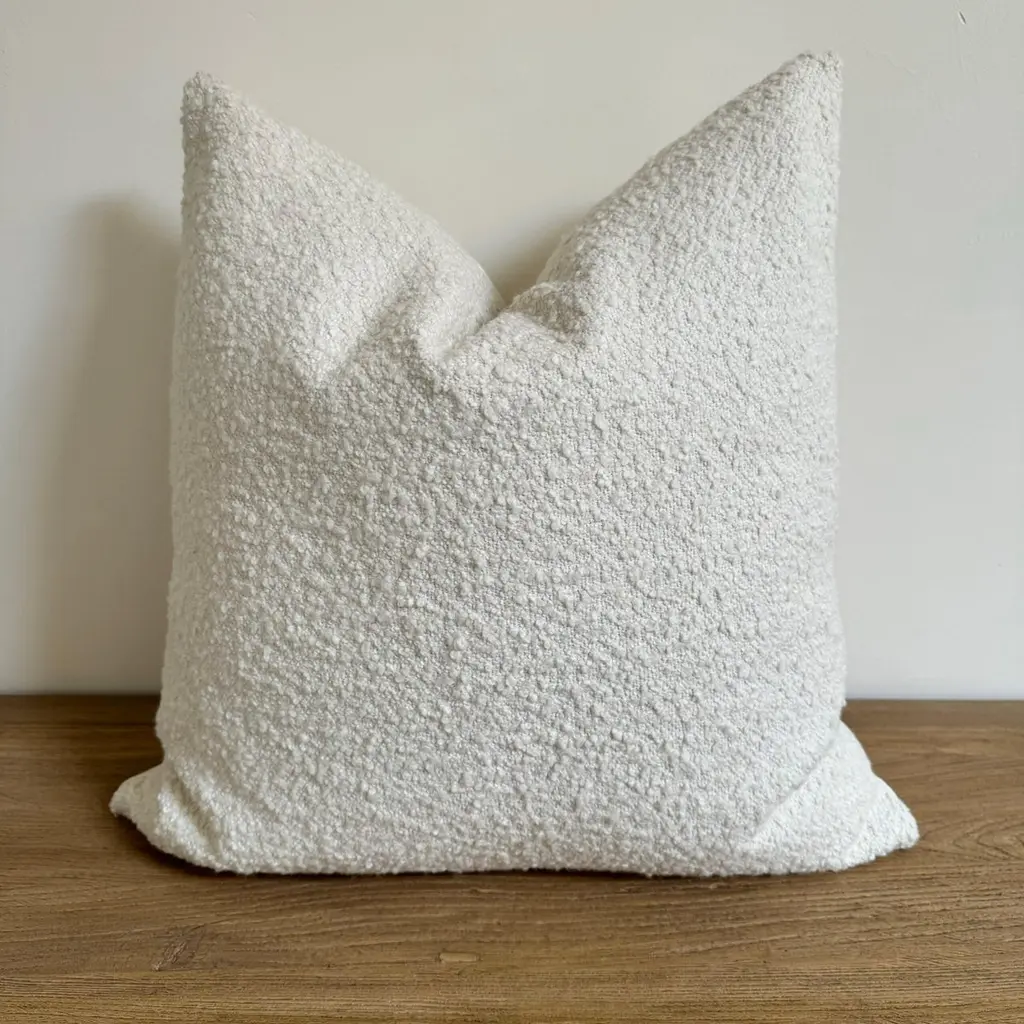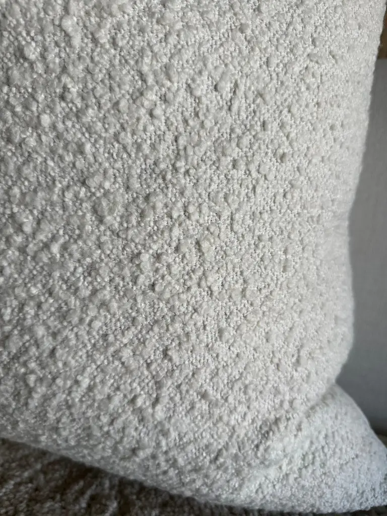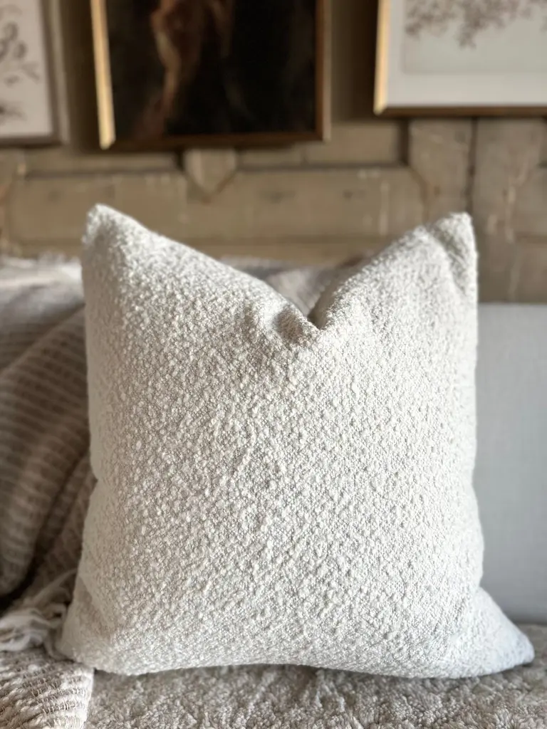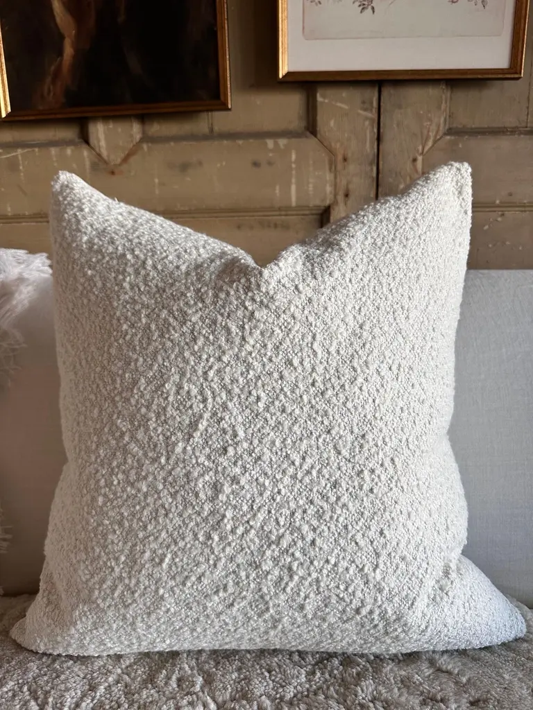 A luxurious wooly bouclette face with stone washed linen back.Linen & boucle fabric is imported from France.Custom made to order, can be customized to your size.Color: BLANCAntique brass zipperSize 22x22Includes Down Feather InsertCare: Can be machine washed cold / for best results dry cleaning is recommended.