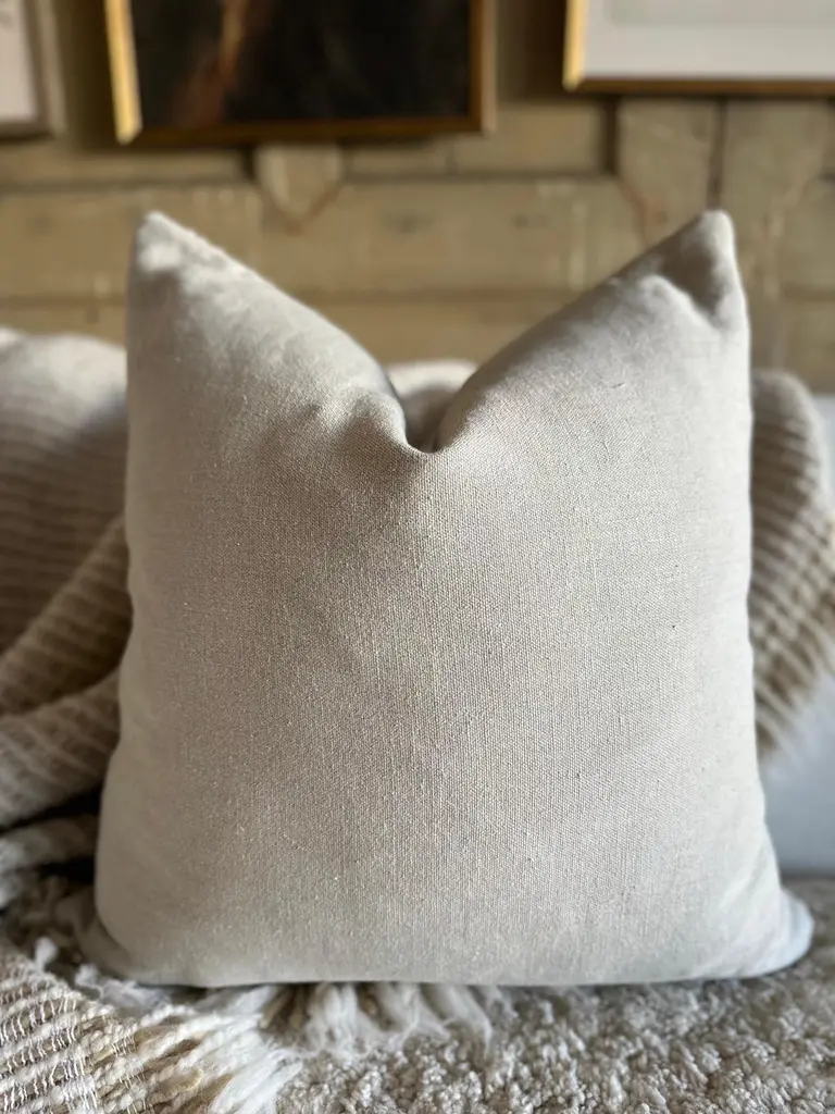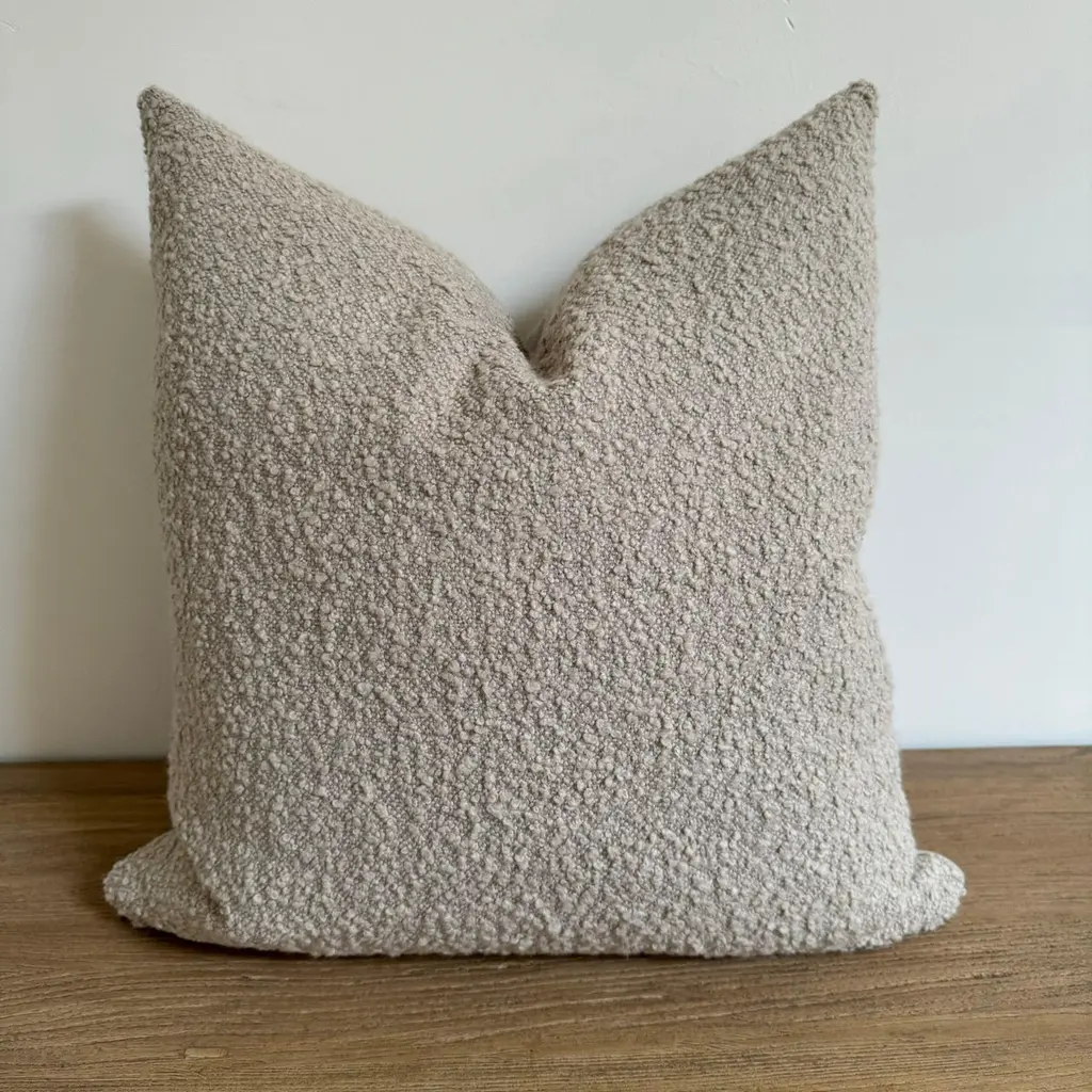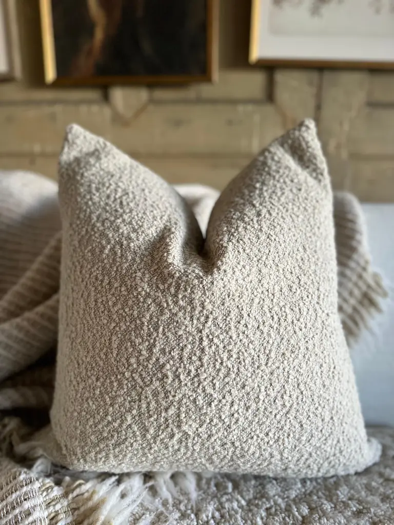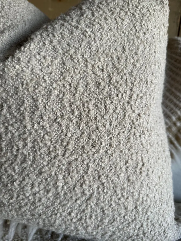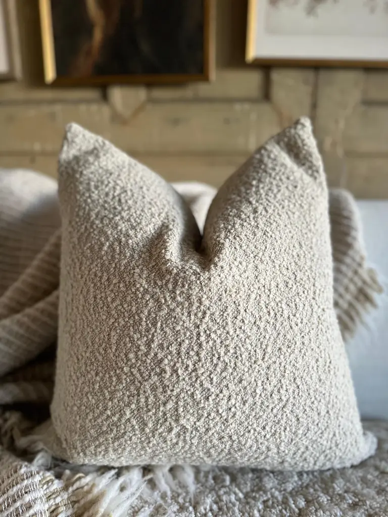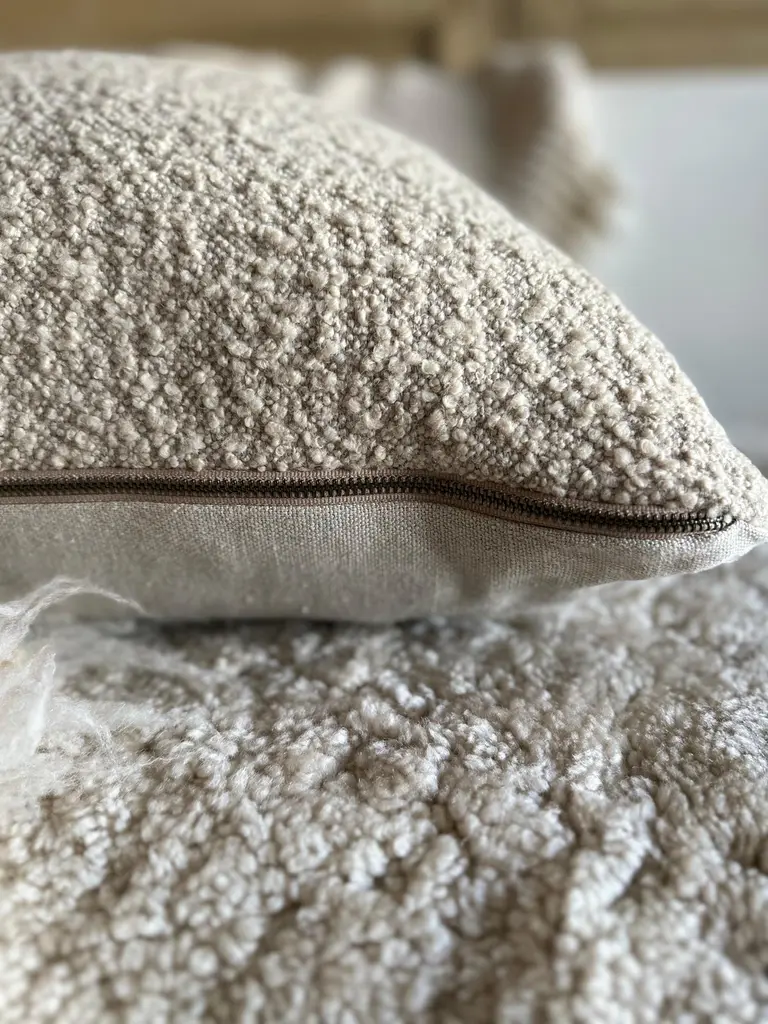 A luxurious wooly bouclette face with stone washed linen back.Linen & boucle fabric is imported from France.Custom made to order, can be customized to your size.Color: NaturalAntique brass zipperSize 22x22Includes Down Feather InsertCare: Can be machine washed cold / for best results dry cleaning is recommended.