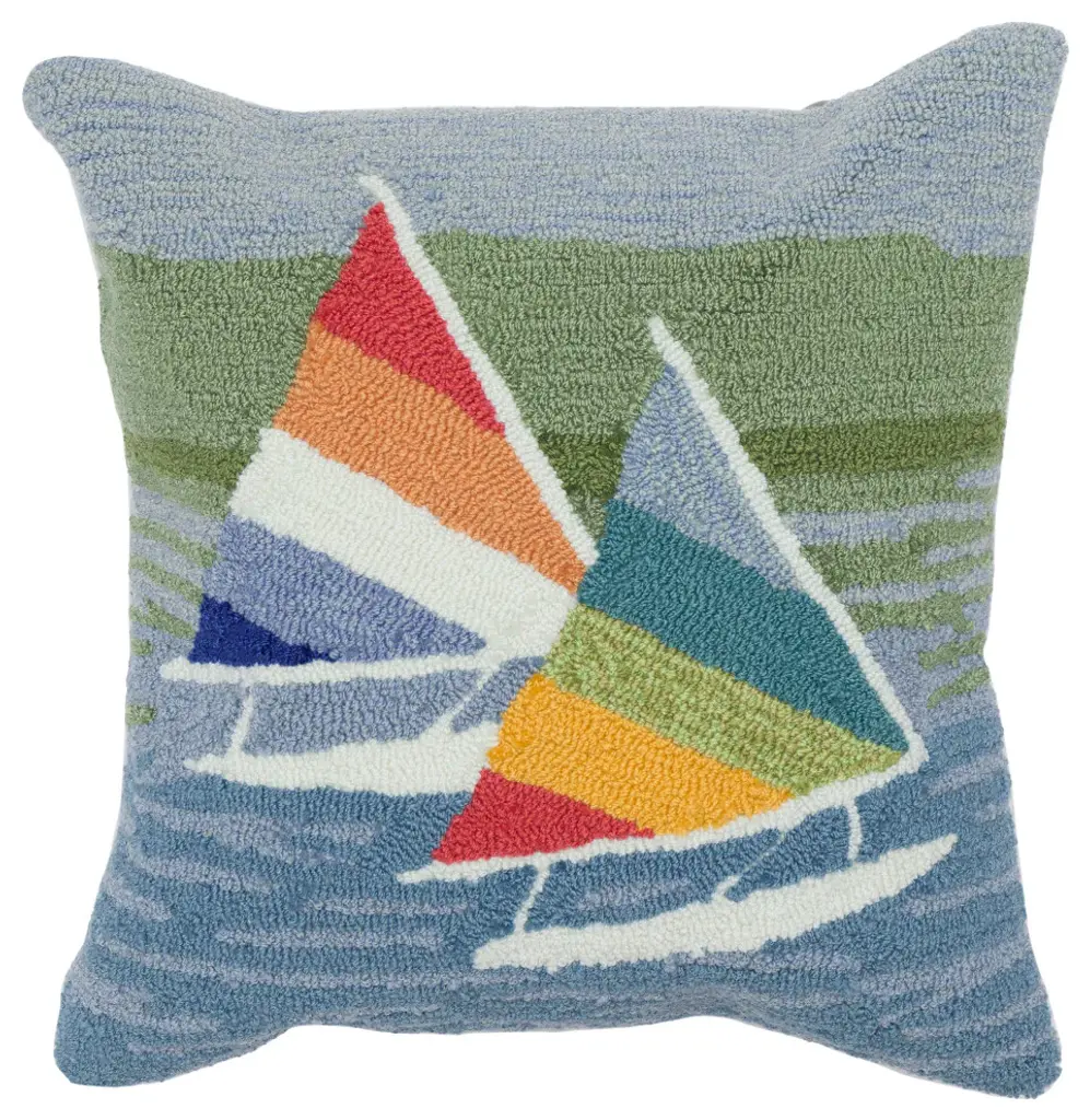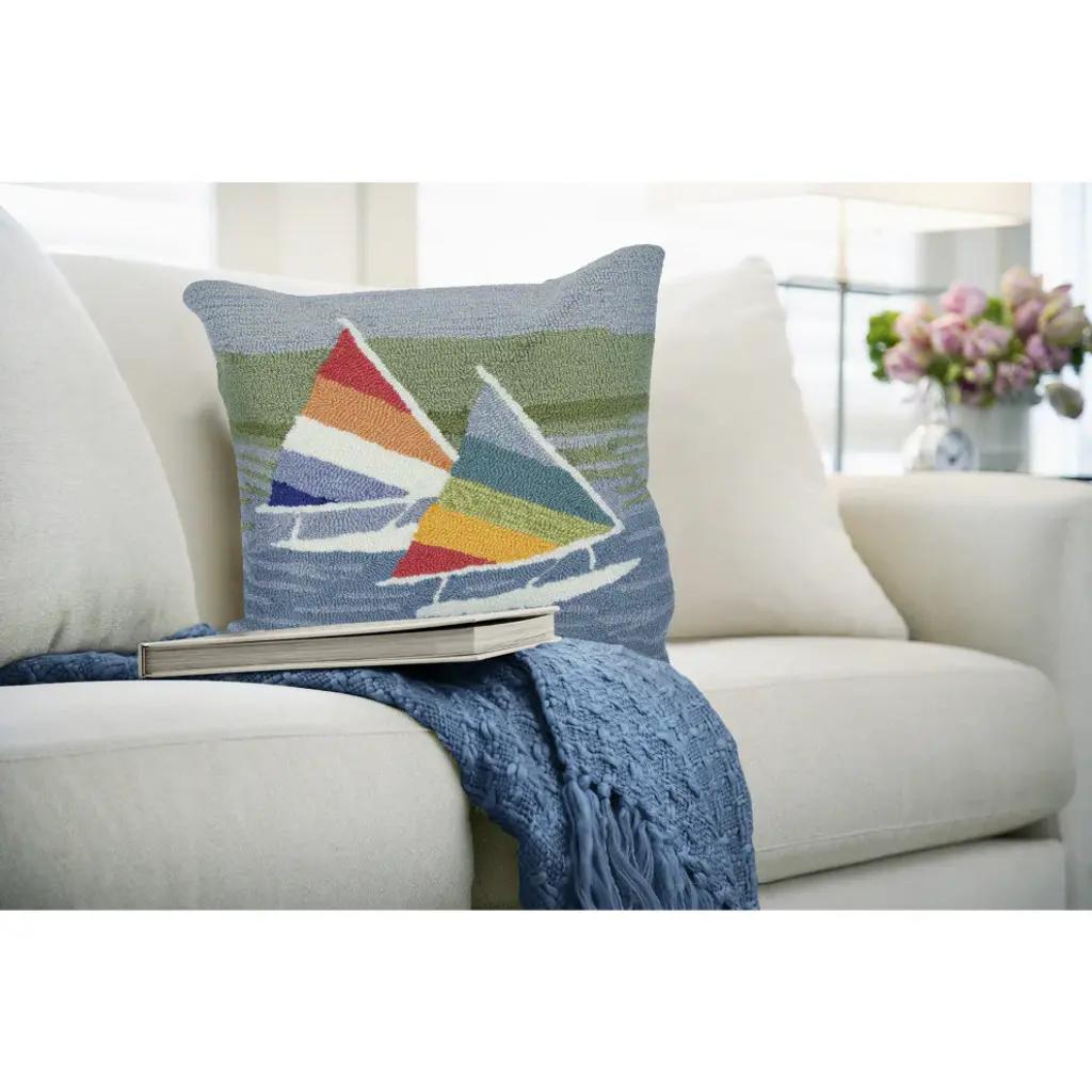 The Sailing decorative contemporary pillow features multi-color blue water and sky as a background, with blue, red, yellow and white sailboats navigating the high seas, adding a nautical vibe to your space. Made in China the Frontporch Collection is hand tufted to create detailed designs with intricately blended colors for a high-quality finish. The material is hand hooked with a Polyacrylic face, a 100% Polyester back and a 100% Polyester insert to create both softness and durability with weather resistant, UV stabilized and added fade resistant treatment. It is easy-care and has a removable cover with a durable zipper closure. It is machine washable which makes this pillow perfect for indoor and outdoor use. These pieces are perfect for your patio, family room, and bedroom and couch making this the ideal indoor or outdoor accent pillow. Fun, casual and unique these vibrant, crisp and detailed patterns range from coastal, farmhouse, novelty sayings, pets and traditional designs to perfectly accent your home. Limiting exposure to rain, moisture and direct sun will prolong pillow life. Machine wash with mild detergent. Air dry flat. Do not use a hard bristle brush.