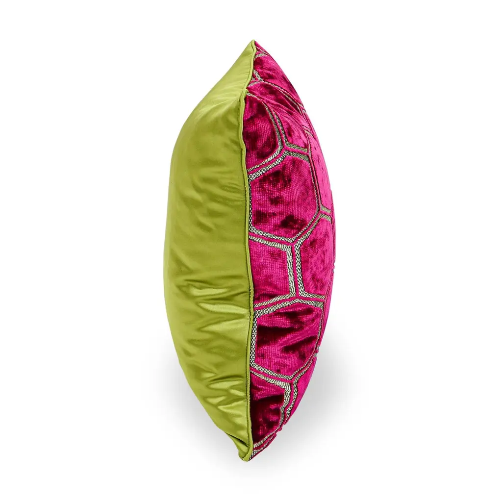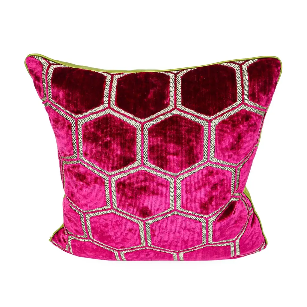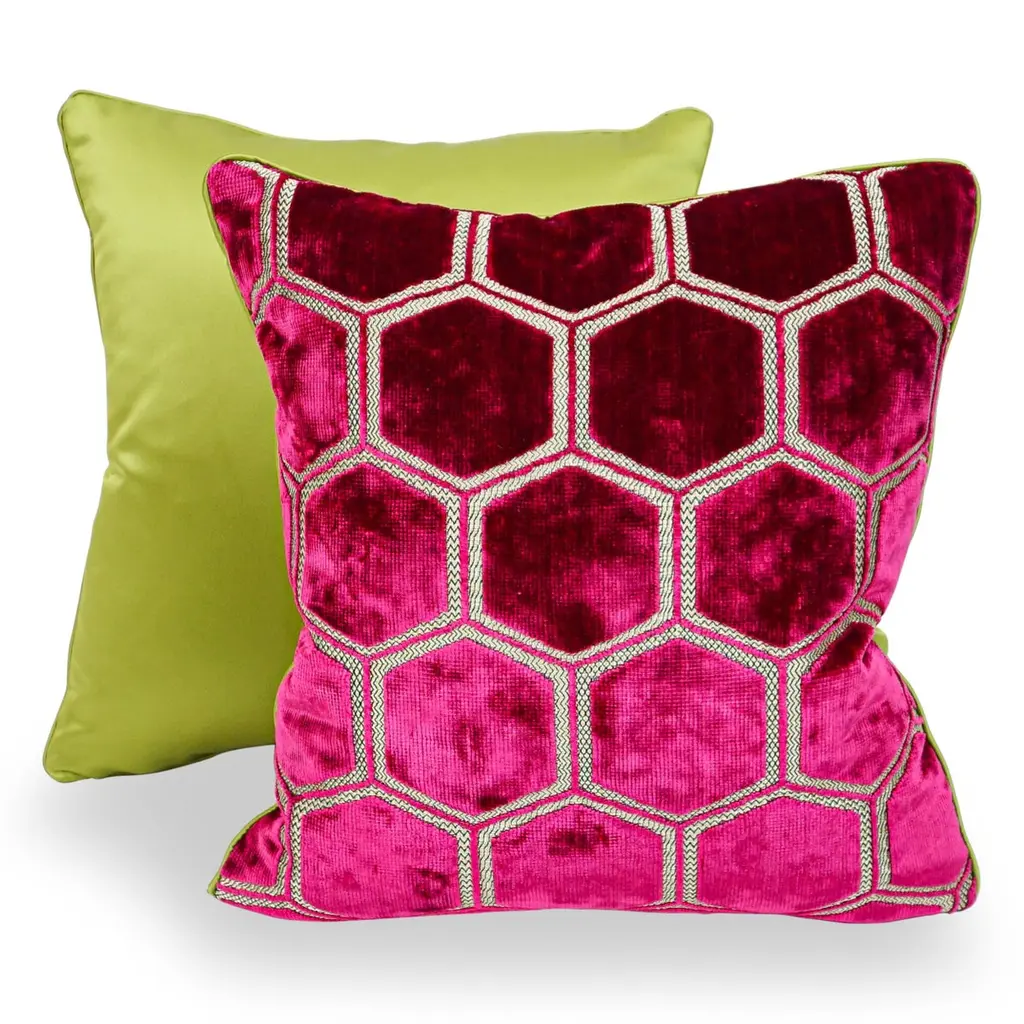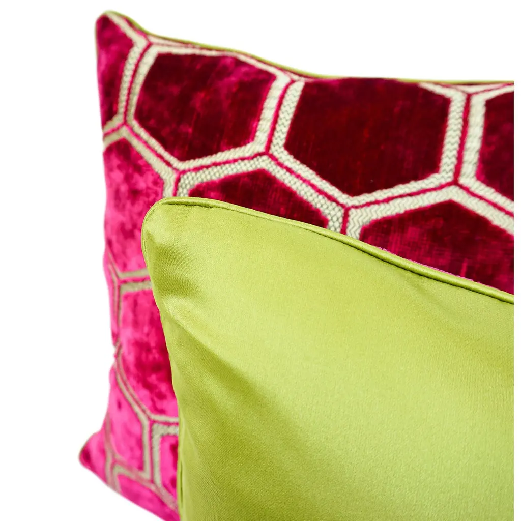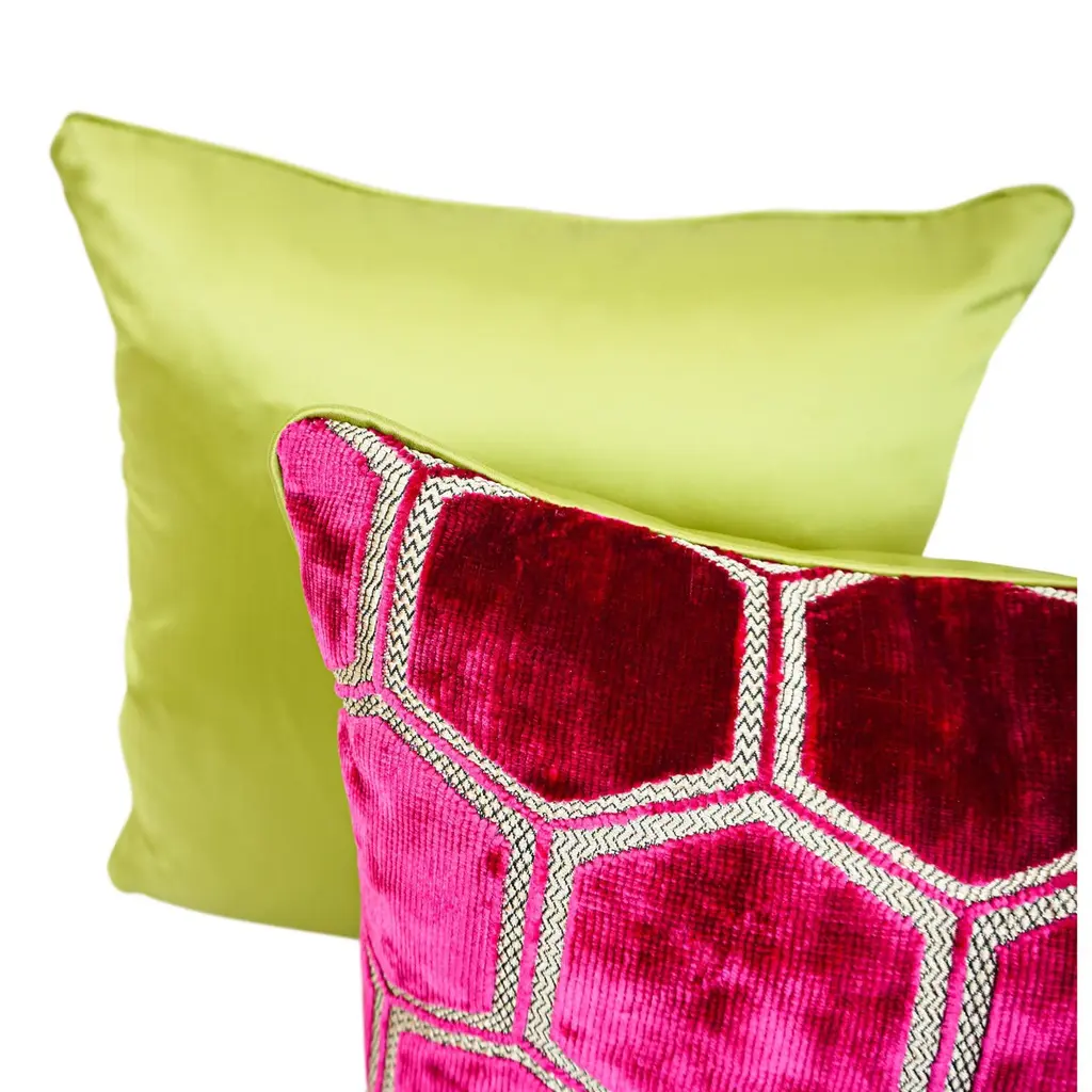 Fuchsia Hexagonal Cut Velvet Square Pillows With Chartreuse Sateen Back