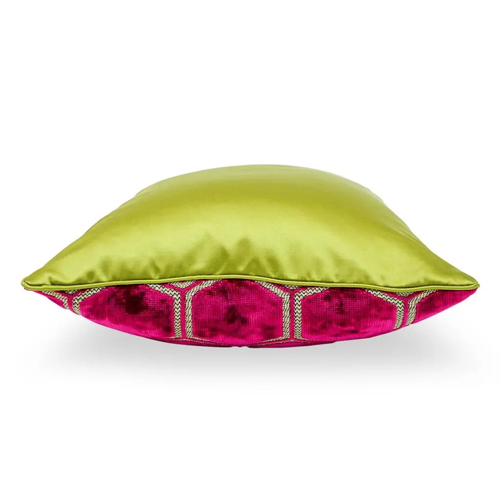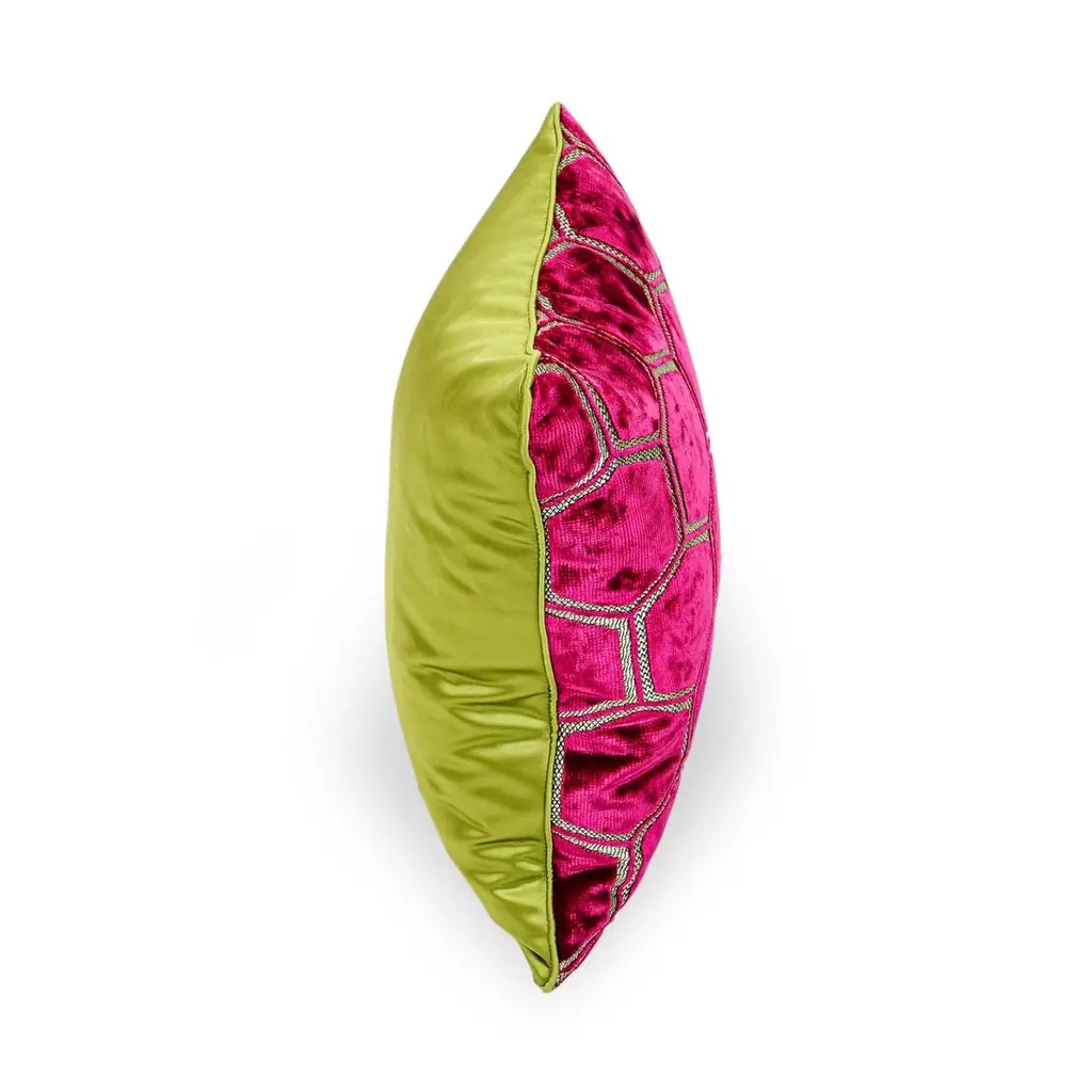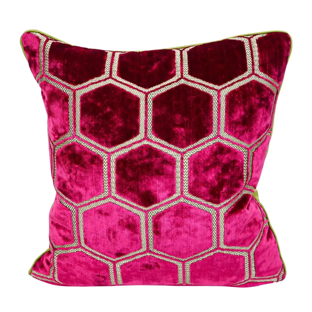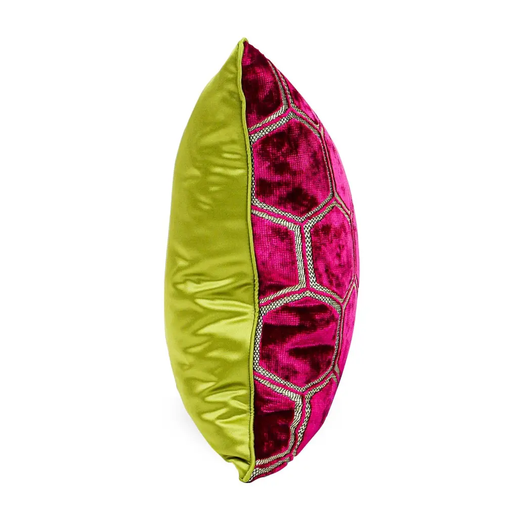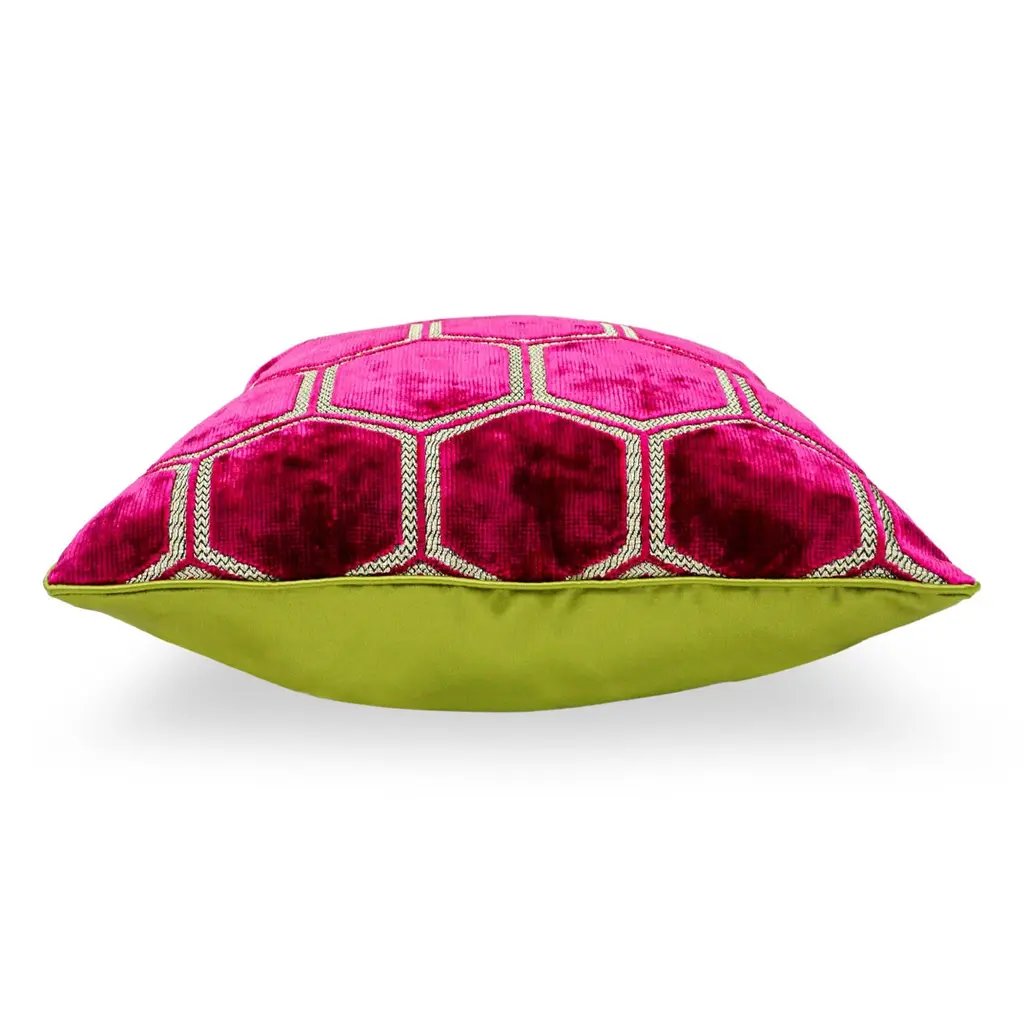 Fuchsia Hexagonal Cut Velvet Square Pillows With Chartreuse Sateen Back