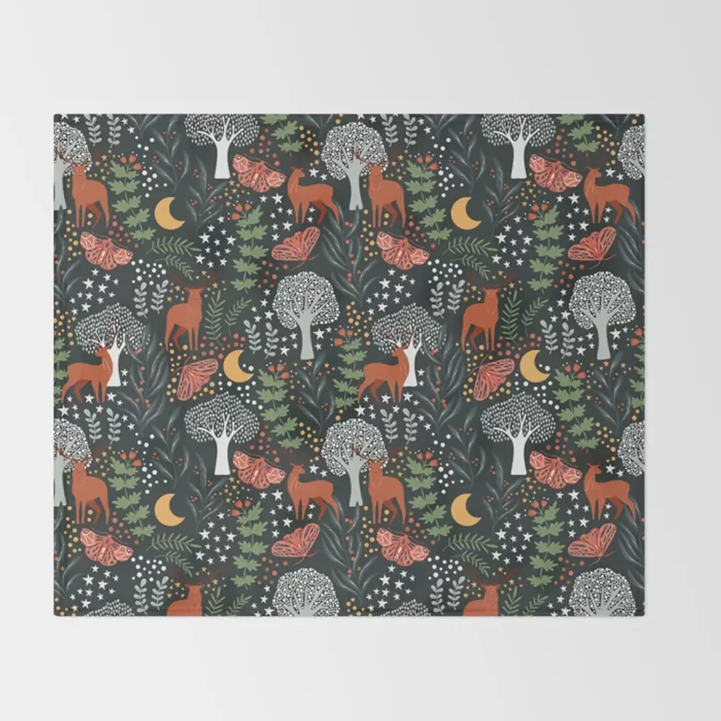 Full-Moon Forest: Whimsical Woodland Nightscape With Deer And Moths Throw Blanket