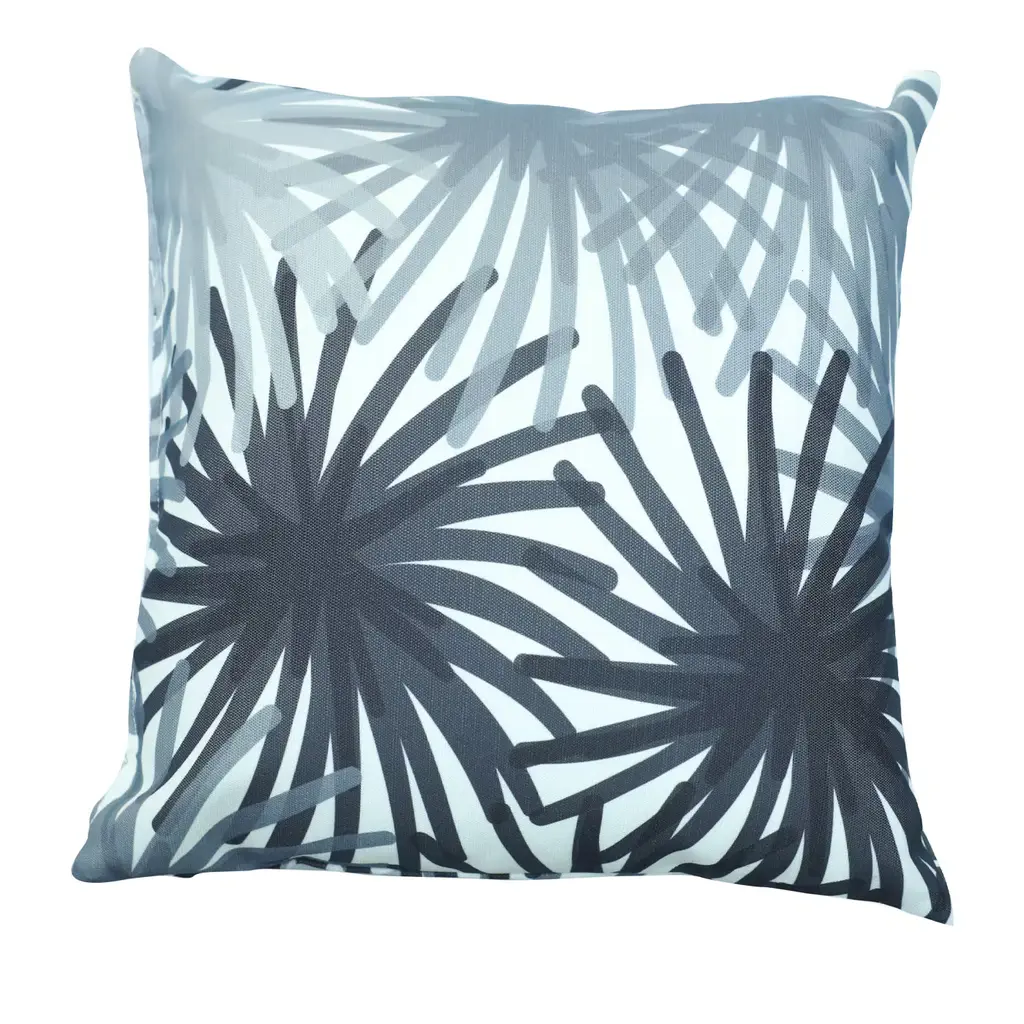 This striking cushion has a down insert with a cover in 100% cotton decorated using the pigment printing technique with a pattern of blue, aqua, and turquoise fireworks.