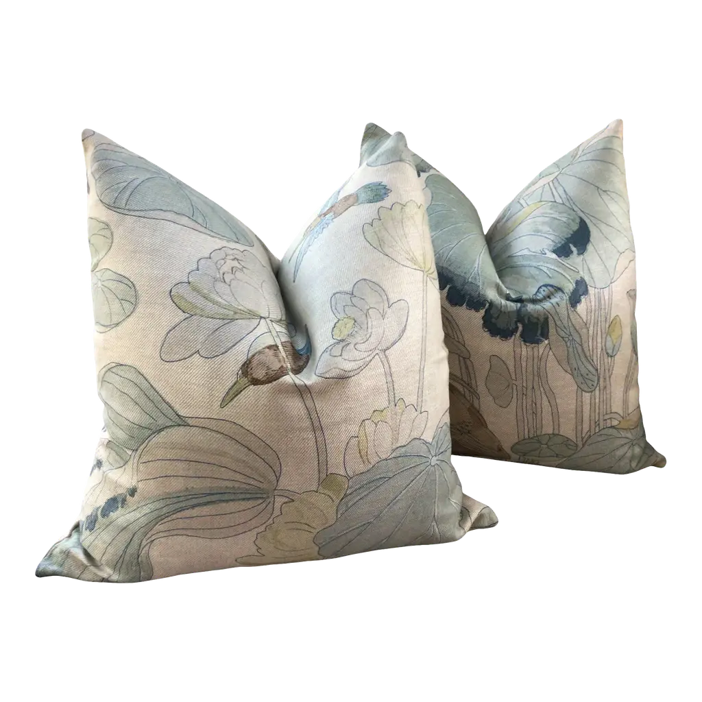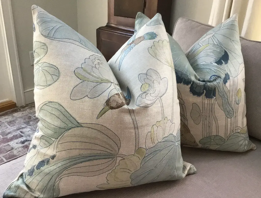 From inimitable design house,GP and J Baker, comes one of their most iconic prints . “Nympheus” in Frost and sea is a large scale twill with Muted shades of blue, teal, gray and celadon on an ivory background .This fabric is heavier than their linen version and is three times as pricey. (Thus the increased pricing for pillows). On the other hand, this is HANDS DOWN my most favorite all time fabric. It features herons, lotus, and lilies -In soothing ocean tones. OH MY! Your order will come as a PAIR of 22” complete pillows with plush down inserts. Patterns will vary and pairs will coordinate-not match! (Which would be so dull) All are GORGEOUS. Closure is by way of invisible zipper.. This listing will feature frost and sea on both sides.