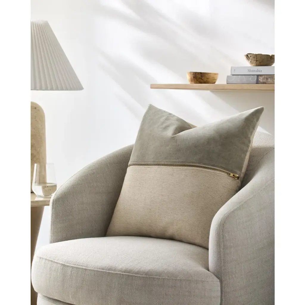 Designed by Galey Alix for Livabliss, the San Marco accent pillow combines classic elements in a fresh way. Crafted from linen, viscose, and cotton, its contrasting colors and textures meet in its middle with a classic brass zipper. Available in three different color options.