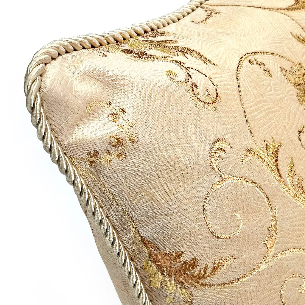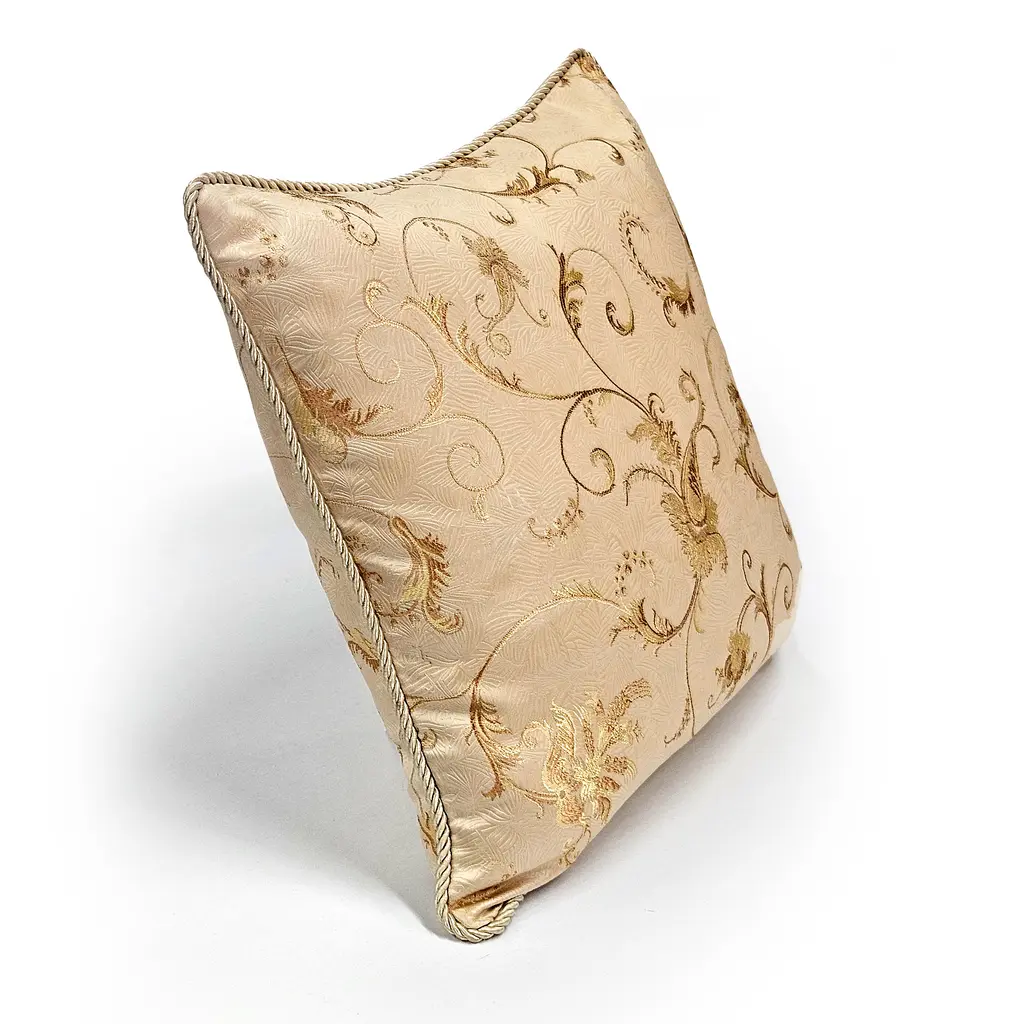Enhance your decor with this 17-inch square throw pillow, showcasing a luxurious brocade pattern in light gold and copper hues. The pillow features an embossed leaf design in the background, adding a subtle texture and richness. Finished with elegant gold cording along the edges, this pillow offers a sophisticated touch to any living space or bedroom. Both sides display the same exquisite fabric, ensuring beauty from any angle. Size: 17"x17" Square Fabric: 100% Polyester Same fabric and design on front and back Seamed with coordinated braided piping Dry Clean Only Hidden zipper closure