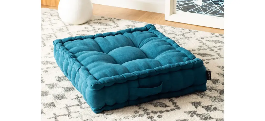 Inspired by the ambiance of a Brooklyn Heights poetry caf_, the Gardenia floor pillow invites everyone to gather _round and take a seat. The cool deep turquoise hue of Gardenia is ideal for adding a casual touch of color to neutral-toned furnishings. A cloth handle allows for easy transport and storage.